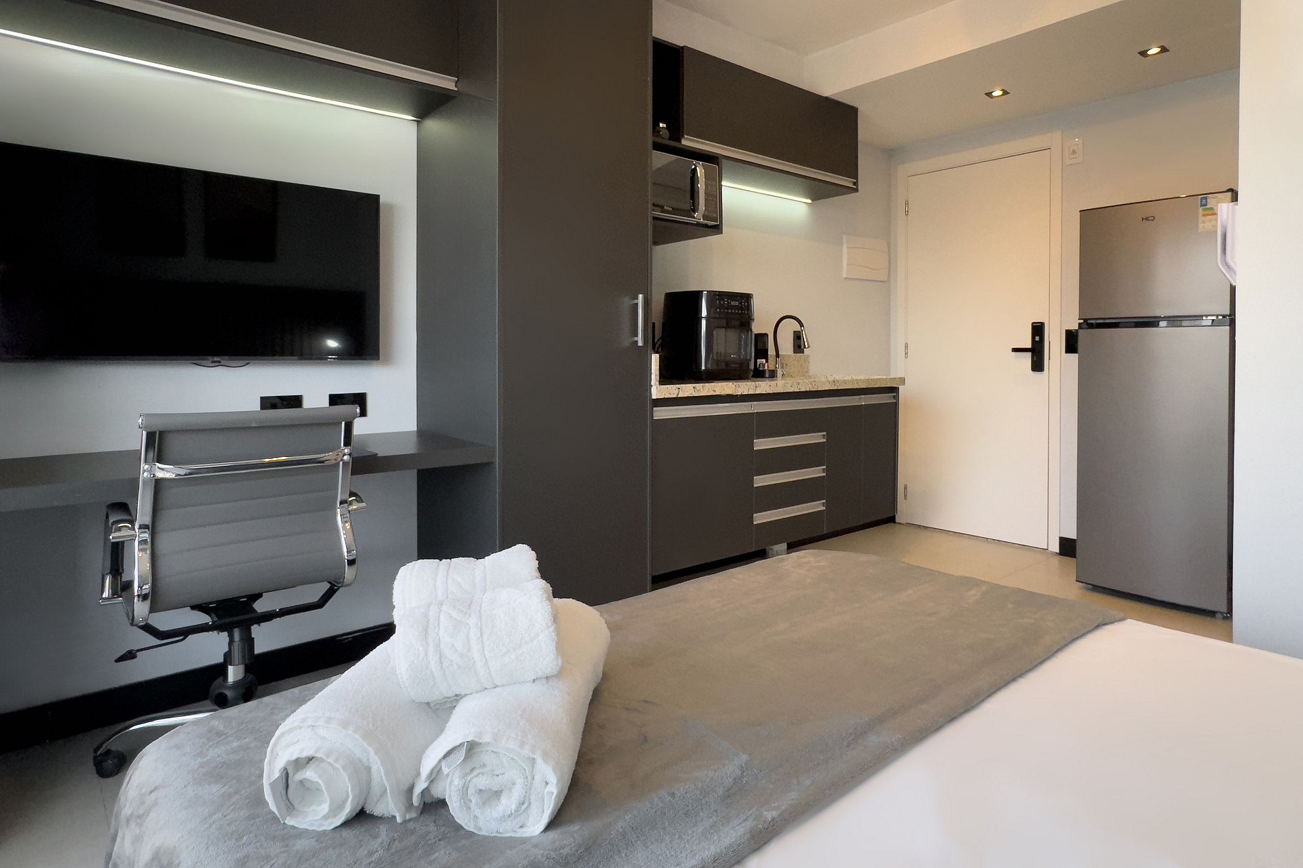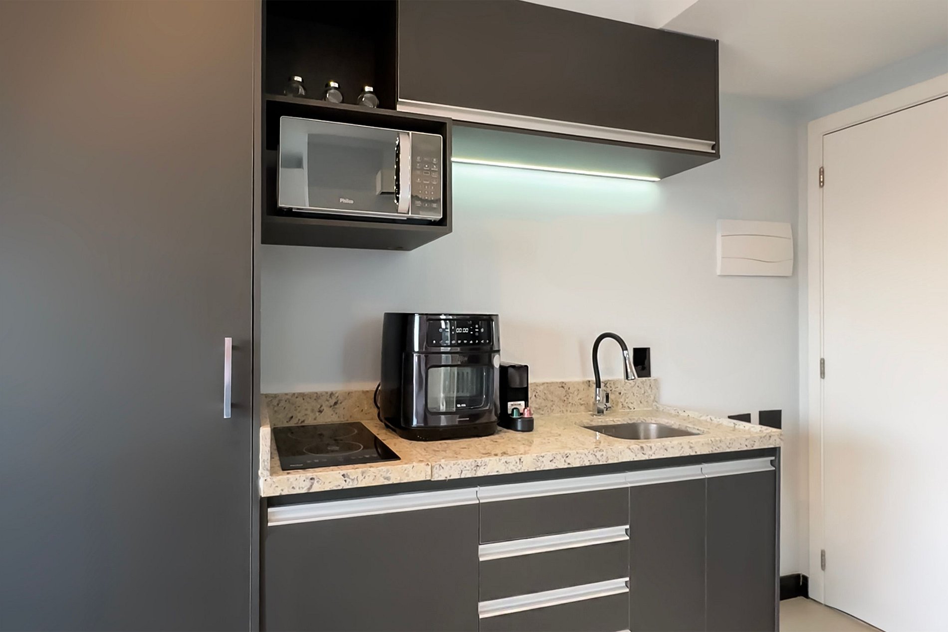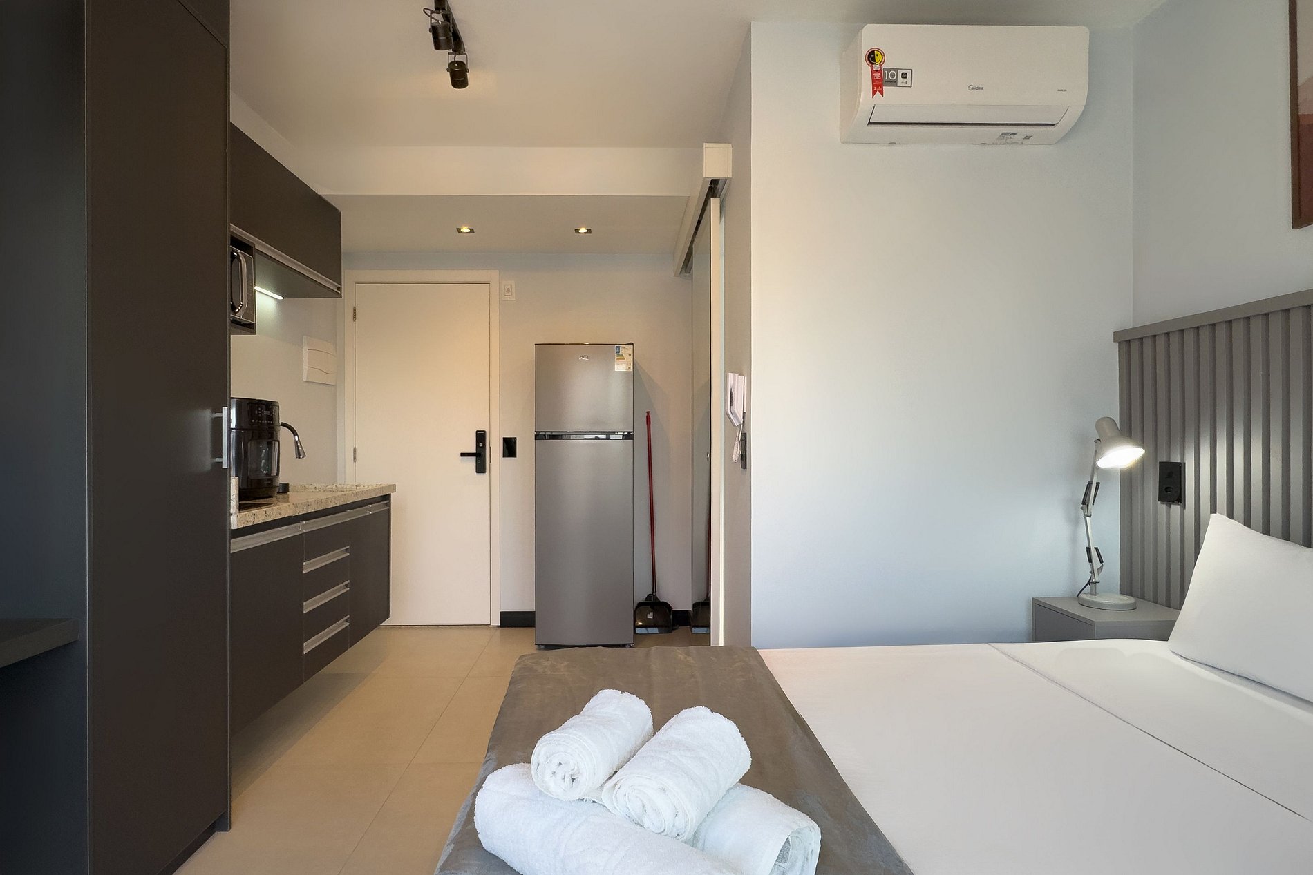 O apartamento possui 1 cama de casal (1,38x1,88) Cozinha completa com geladeira, freezer, micro-ondas, fogão de (2 bocas), Nespresso, bancada para home office, guarda-roupa, secador de cabelo, ferro de passar, TV e banheiro com ótimo chuveiro (água quente e fria). Será fornecido um jogo de enxoval (lençóis, travesseiros, fronhas e toalhas de banho e rosto) por hóspede. Não há trocas durante a permanência.