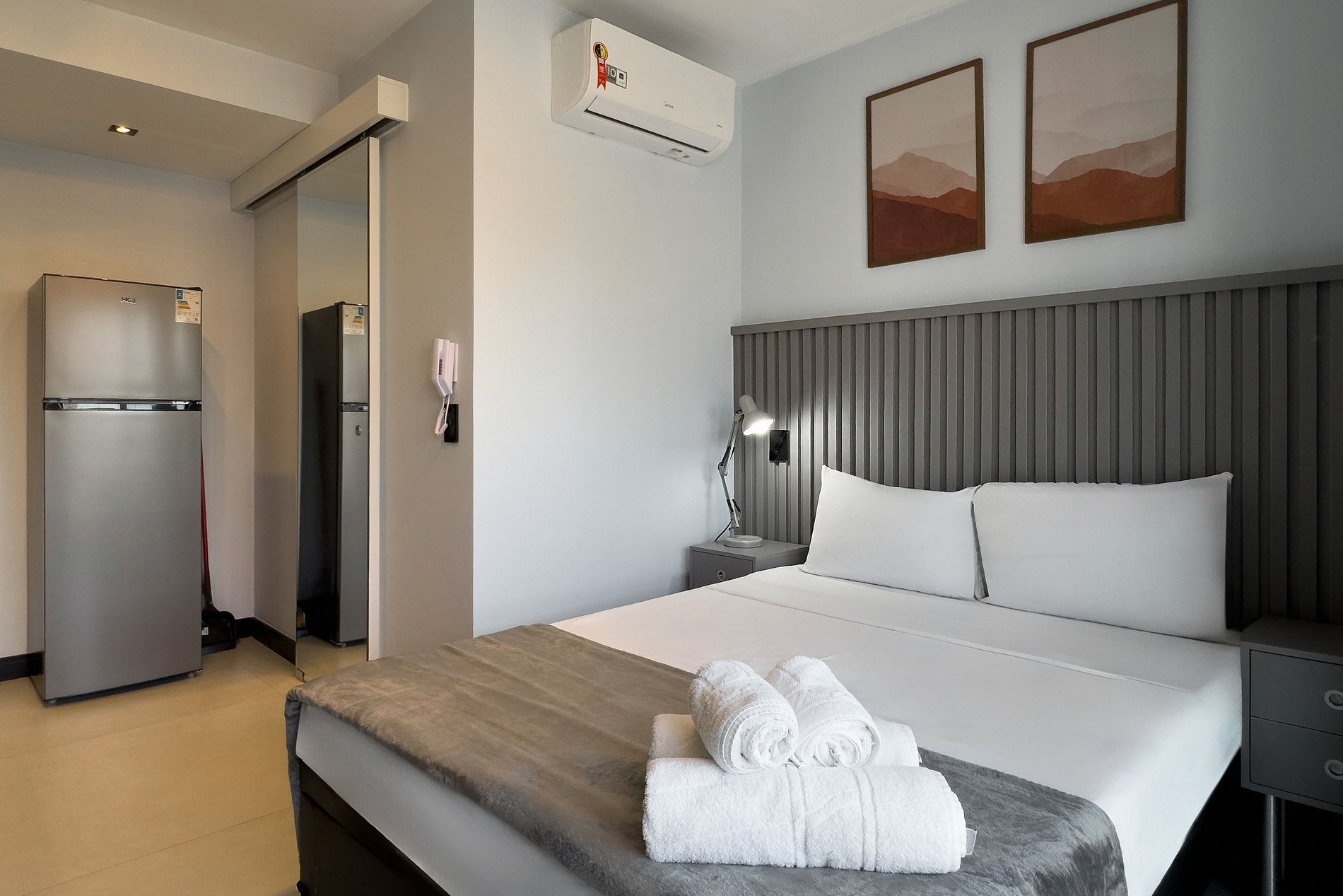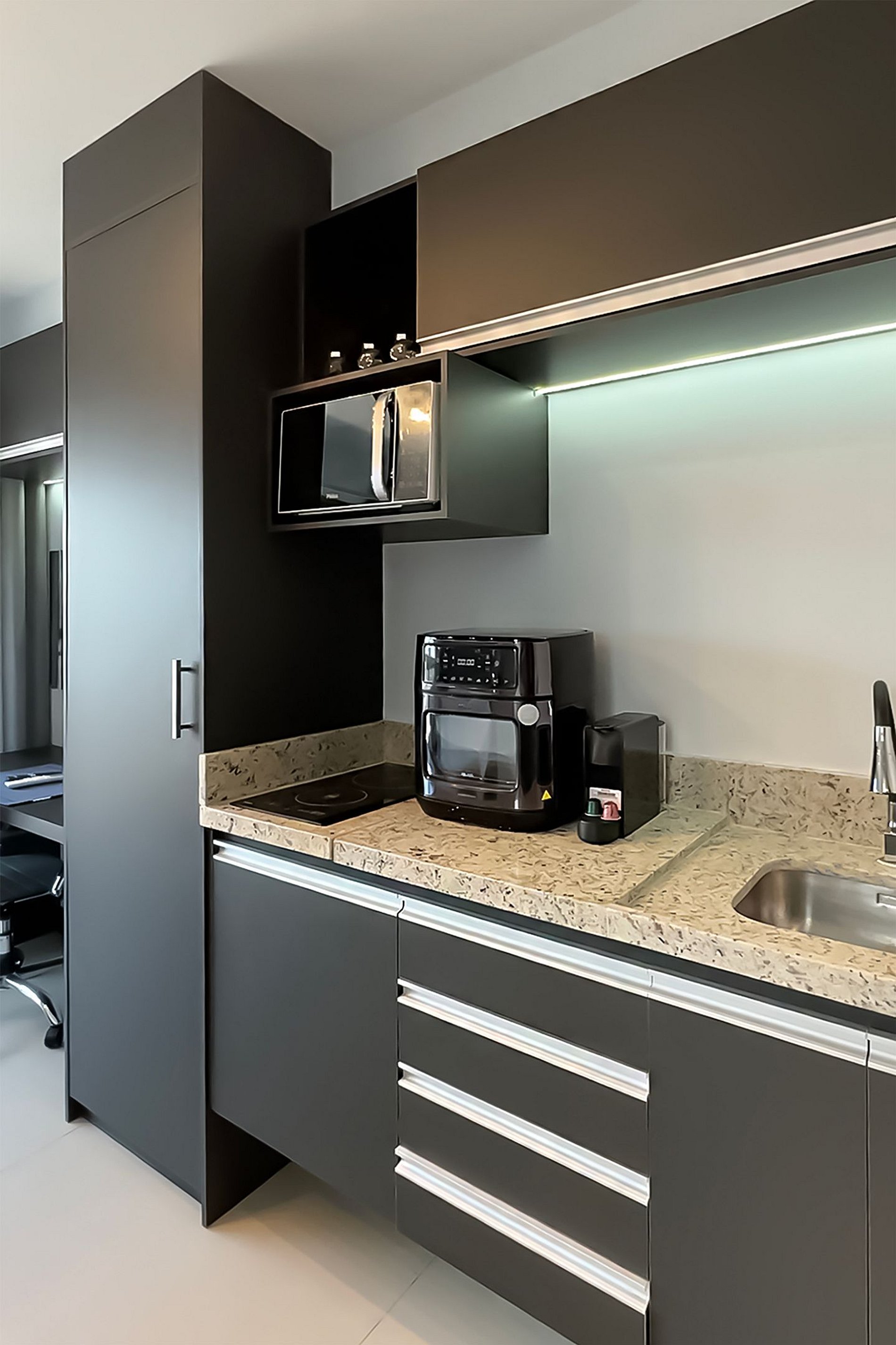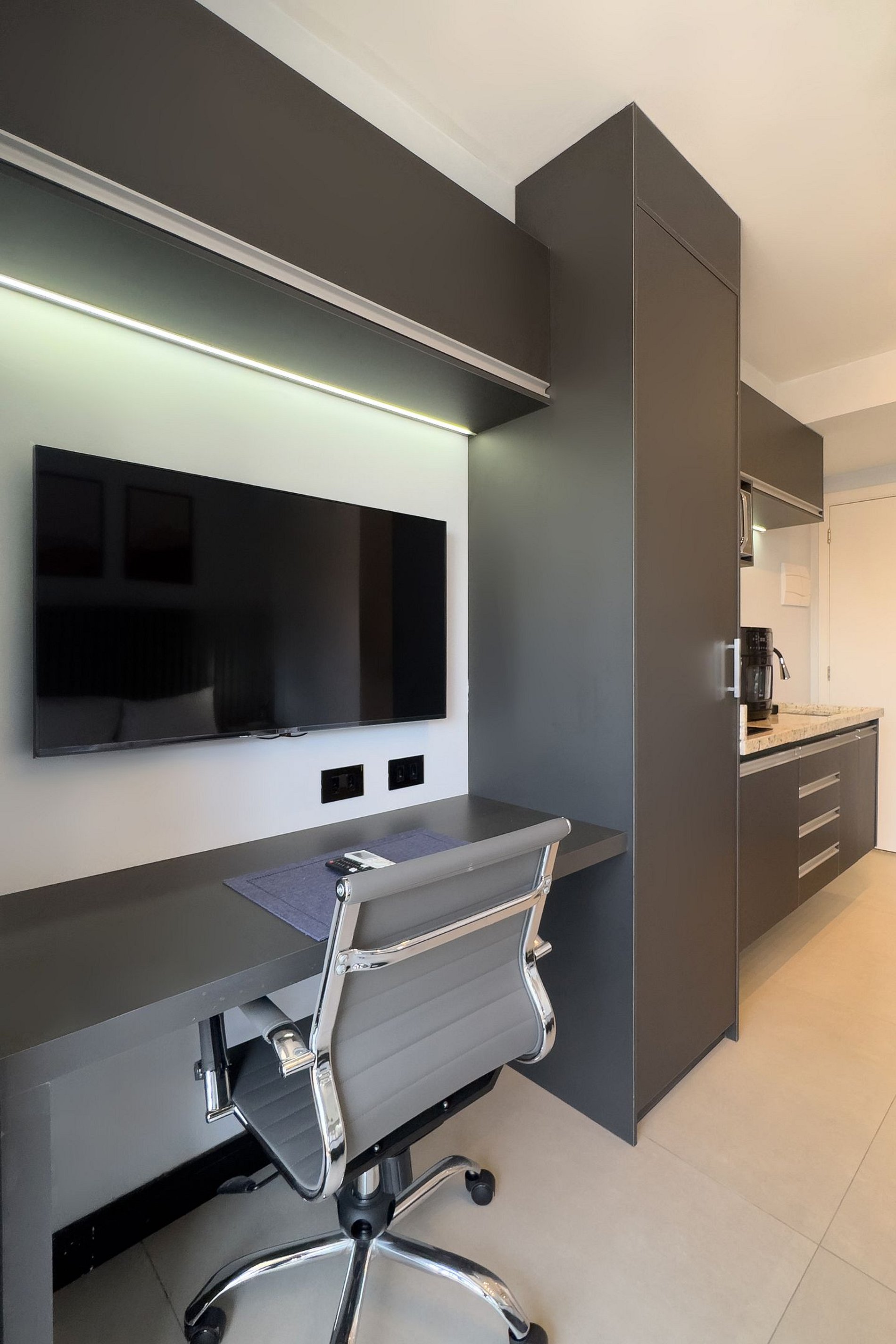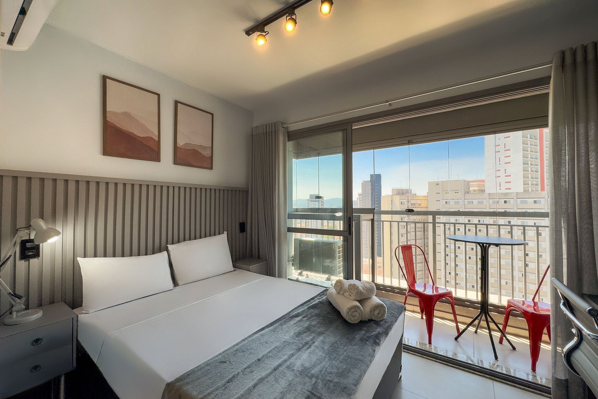 O apartamento possui 1 cama de casal (1,38x1,88) Cozinha completa com geladeira, freezer, micro-ondas, fogão de (2 bocas), Nespresso, bancada para home office, guarda-roupa, secador de cabelo, ferro de passar, TV e banheiro com ótimo chuveiro (água quente e fria). Será fornecido um jogo de enxoval (lençóis, travesseiros, fronhas e toalhas de banho e rosto) por hóspede. Não há trocas durante a permanência.