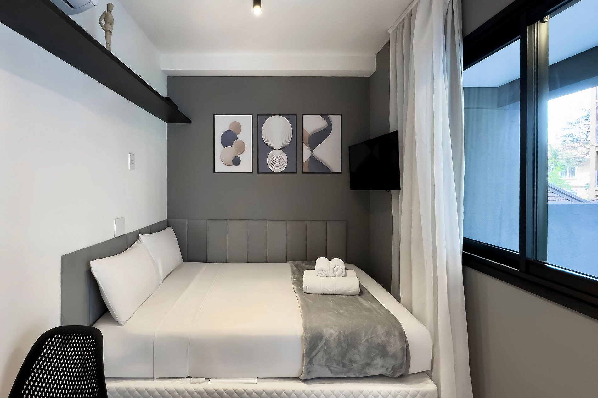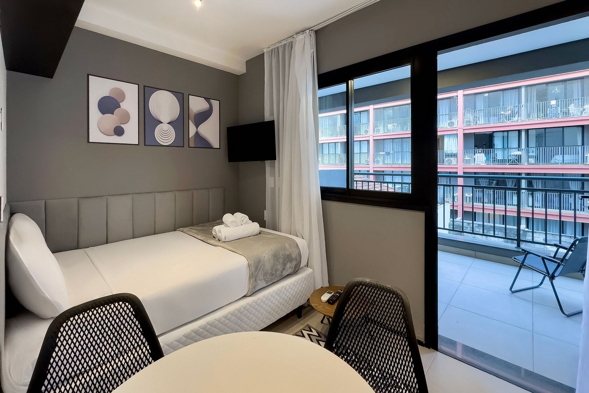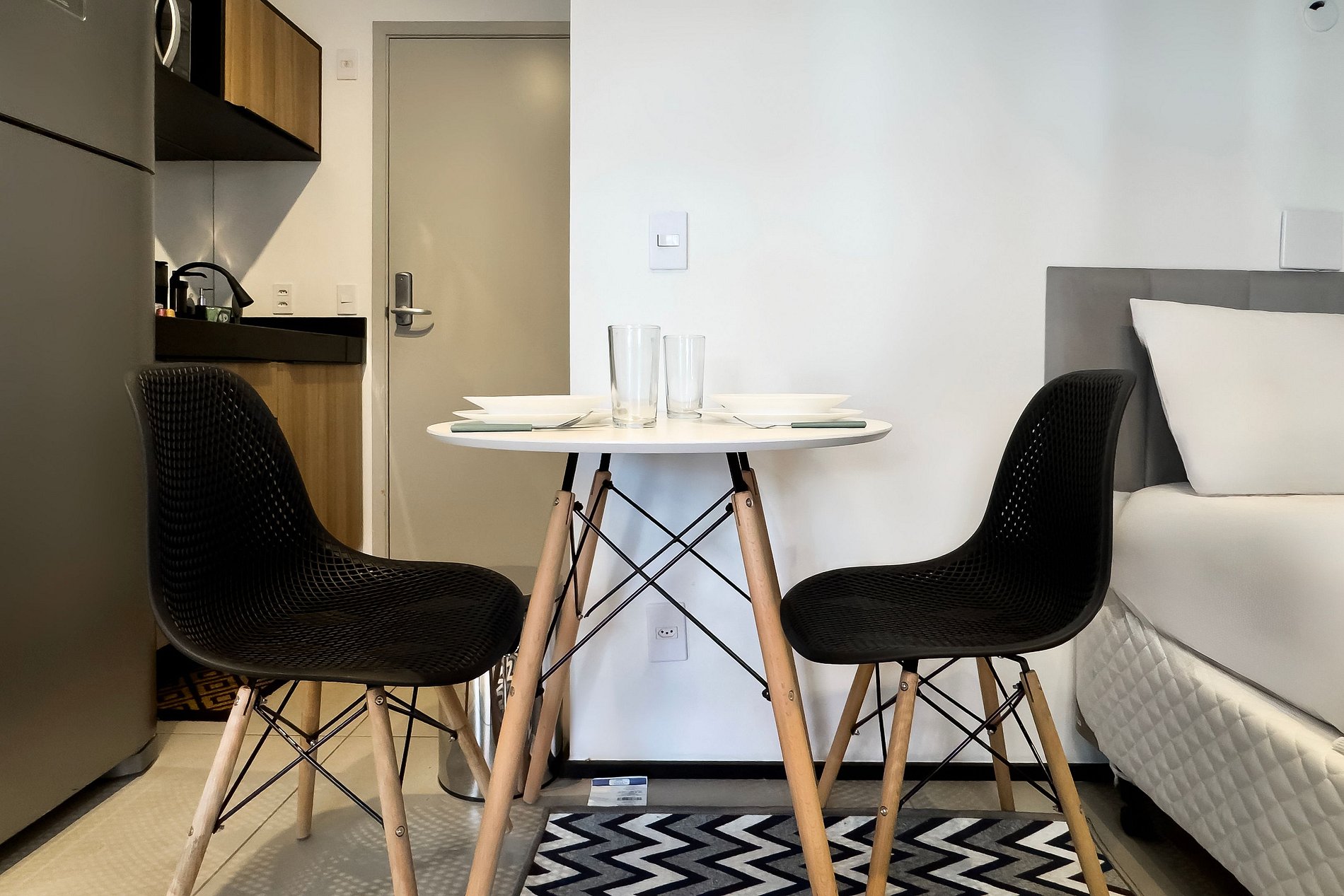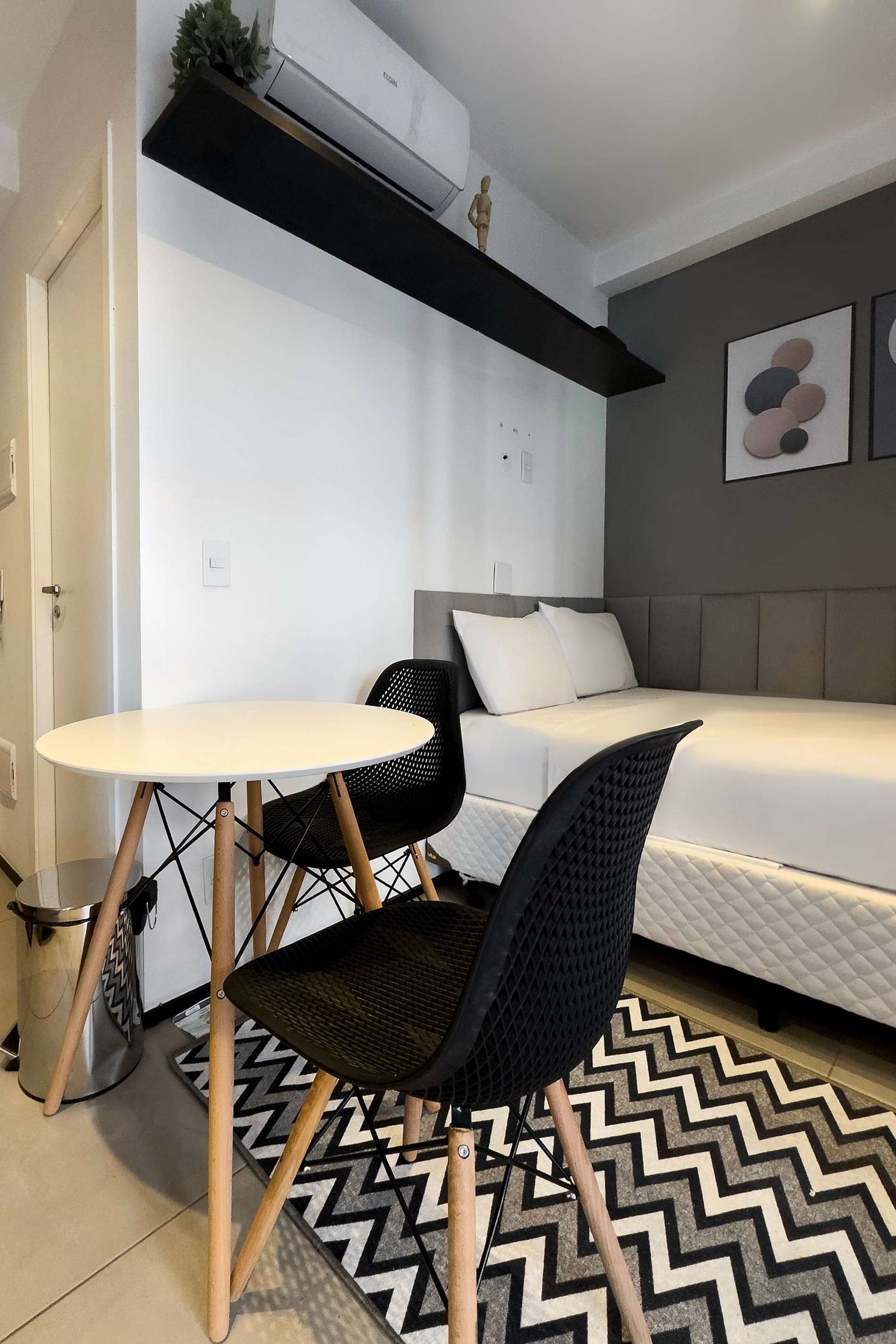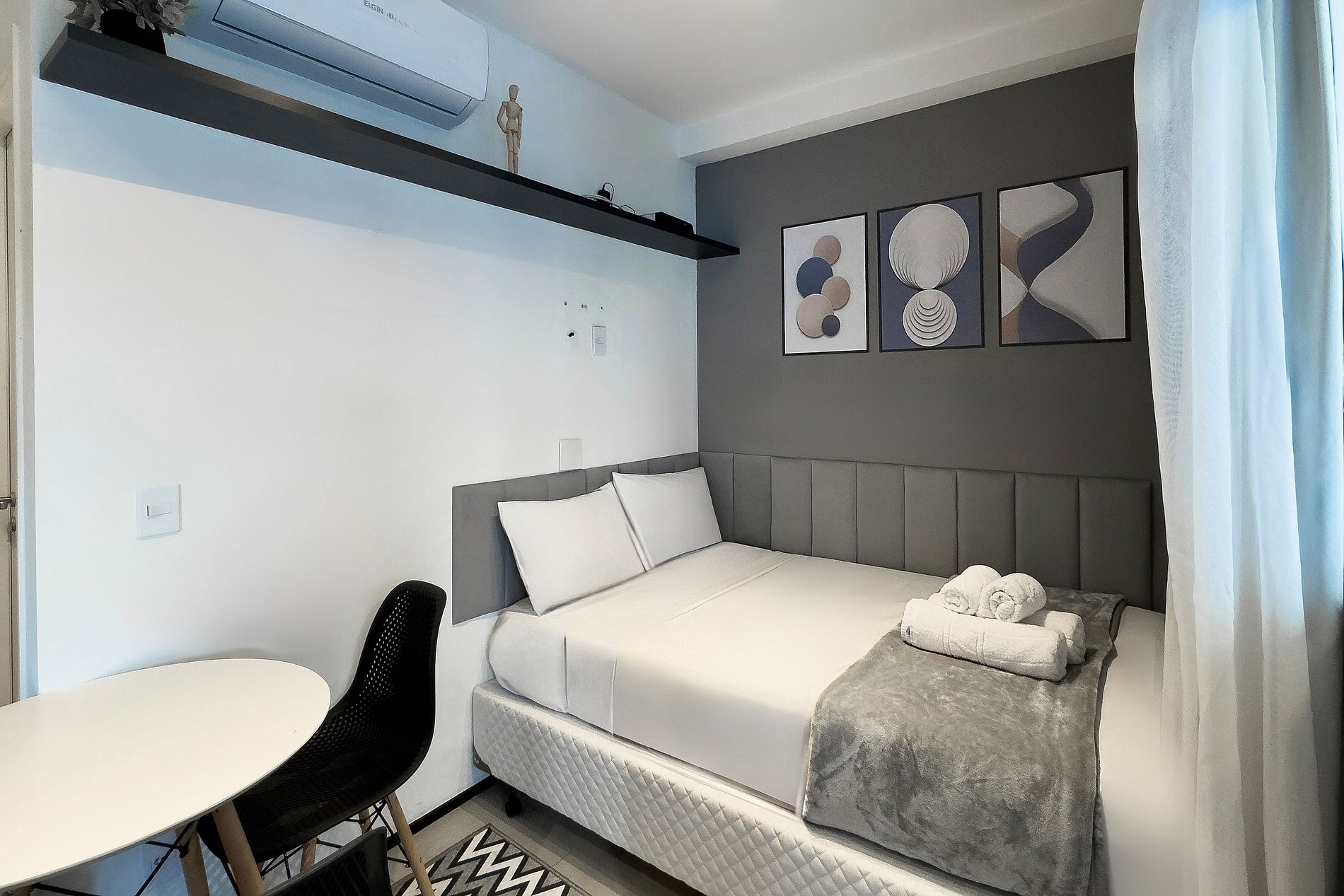 O apartamento possui 1 cama de casal (1,58x1,88), e ar-condicionado. Cozinha completa com geladeira , freezer, micro-ondas, fogão de indução, jogo de talheres, cafeteira nespresso para home office, sanduicheira , guarda-roupa, secador de cabelo, ferro de passar , mesa, 2 Cadeiras , Cortina Black out TV , banheiro com ótimo chuveiro (água quente e fria).O apartamento é automatizado com Alexa para maior conforto. Será fornecido um jogo de enxoval (lençóis, travesseiros, fronhas e toalhas de banho) por hóspede. Outras observações Ao redor do endereço .R. Humberto I, 1005 você encontrará uma variedade de opções para tornar sua estadia cada vez mais agradável;