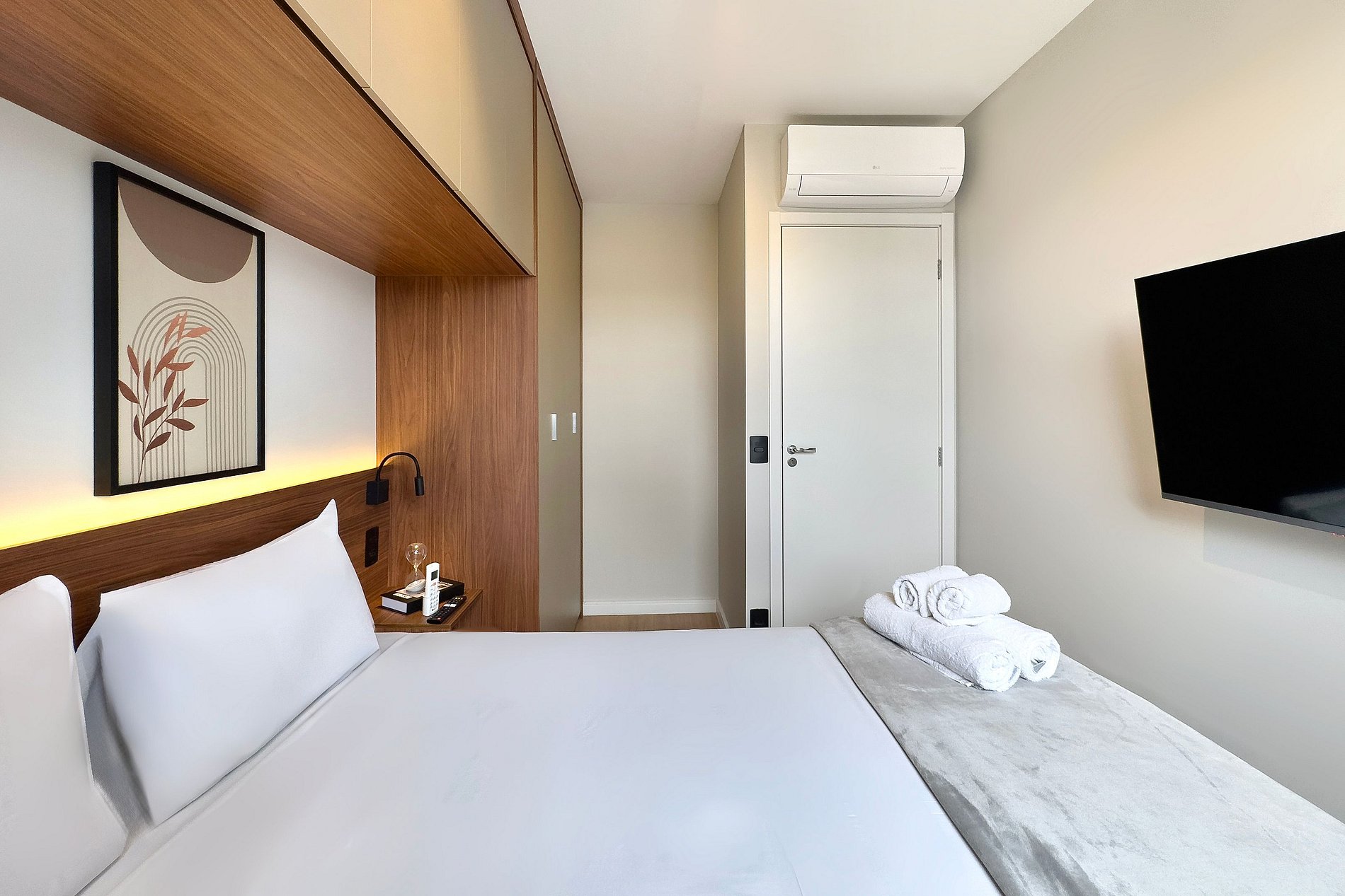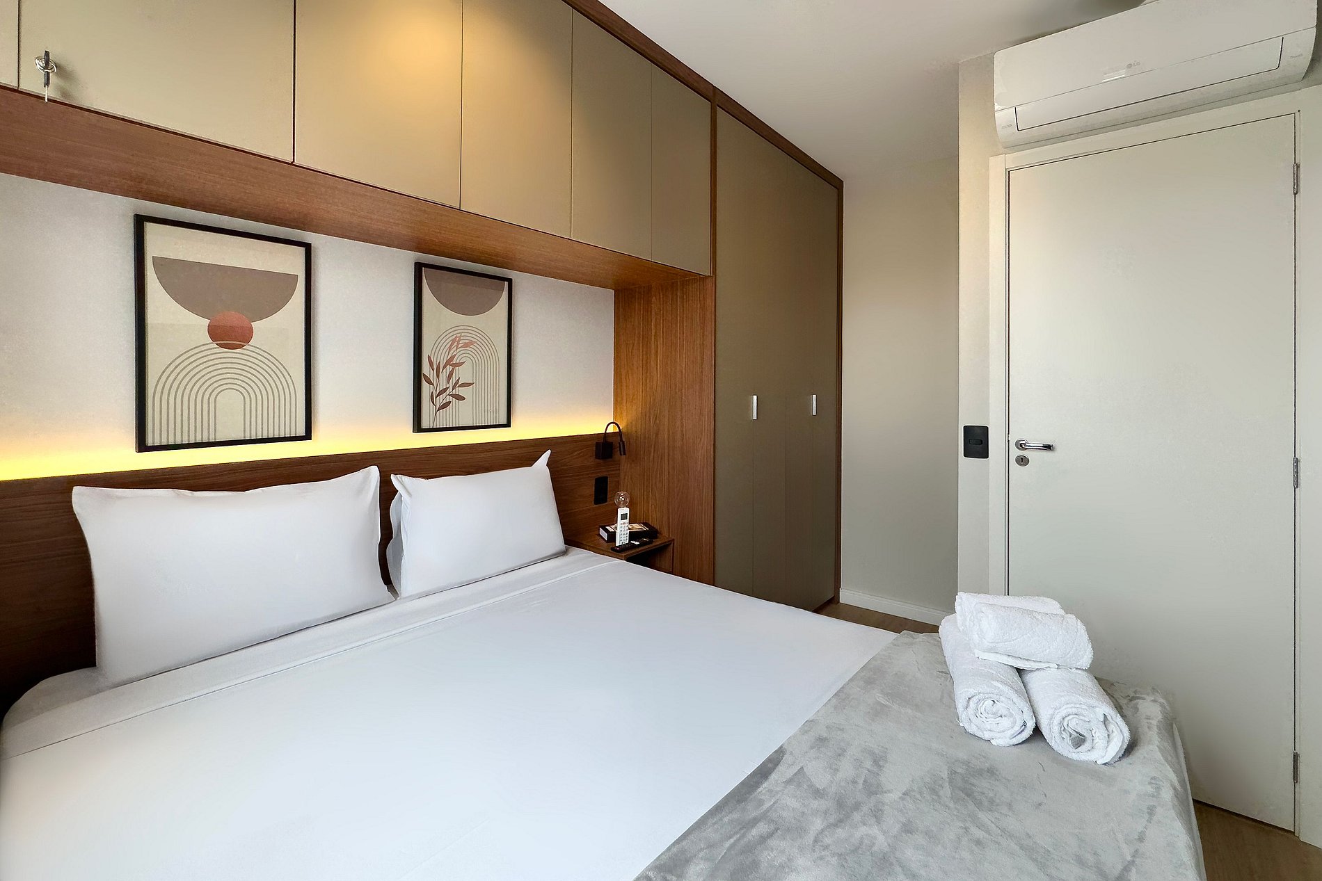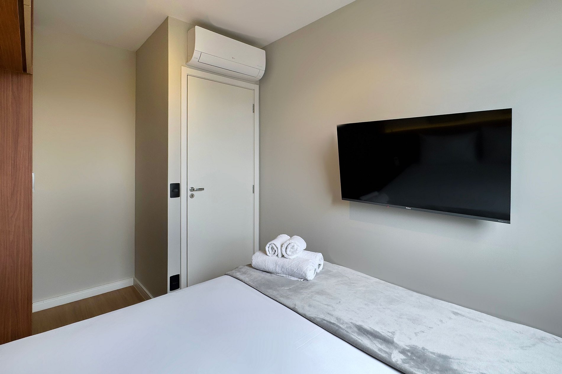 O apartamento possui 1 cama de casal padrão (1,38x1,88) no quarto um, outra cama de casal no quarto dois e um sofá cama na sala para atender até um quinto/sexto hóspede. Cozinha completa com geladeira, freezer, micro-ondas, fogão de (4 bocas), Nespresso, bancada para home office, guarda-roupa, secador de cabelo, ferro de passar, TV e banheiro com ótimo chuveiro (água quente e fria). Será fornecido um jogo de enxoval (lençóis, travesseiros, fronhas e toalhas de banho e rosto) por hóspede. Não há trocas durante a permanência. Outras observações Ao redor do endereço Alameda dos Nhambiquaras, 1990 em Moema, você encontrará uma variedade de opções para tornar sua estadia mais agradável.