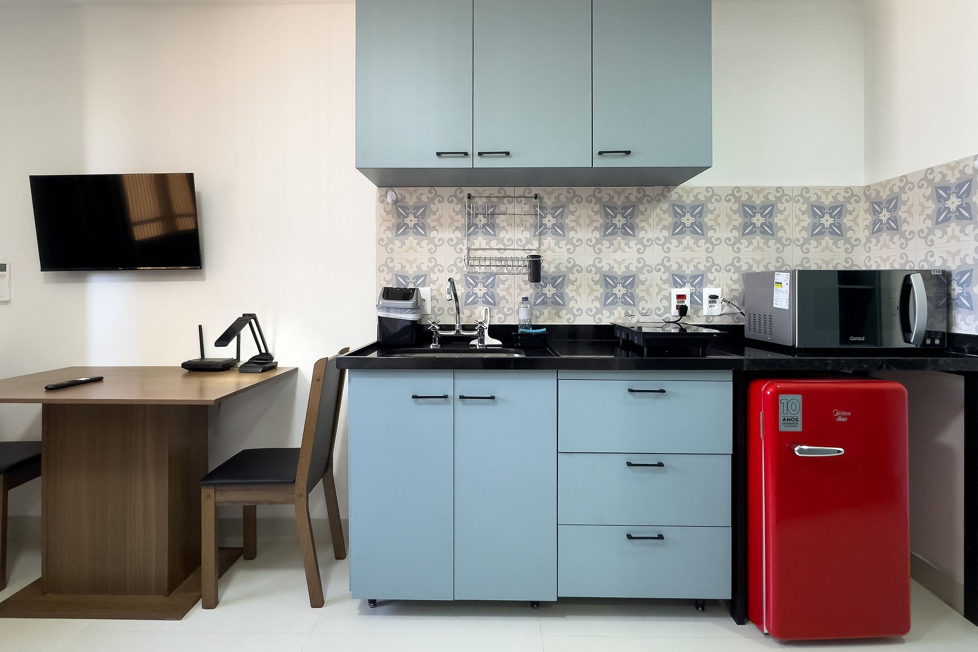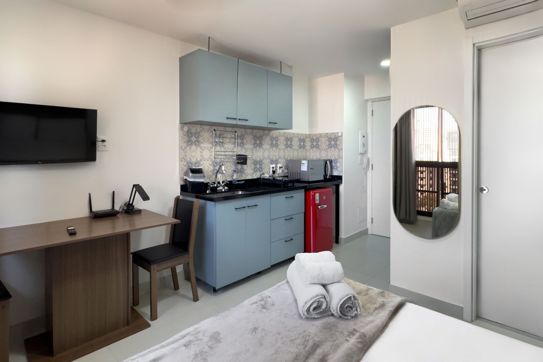 O apartamento possui 1 cama de casal (1,38x1,88) Cozinha completa com frigobar , micro-ondas, fogão de (2 bocas), cafeteira, bancada para home office, guarda-roupa, secador de cabelo, ferro de passar, TV e banheiro com ótimo chuveiro (água quente e fria). Será fornecido um jogo de enxoval (lençóis, travesseiros, fronhas e toalhas de banho e rosto) por hóspede. Não há trocas durante a permanência.