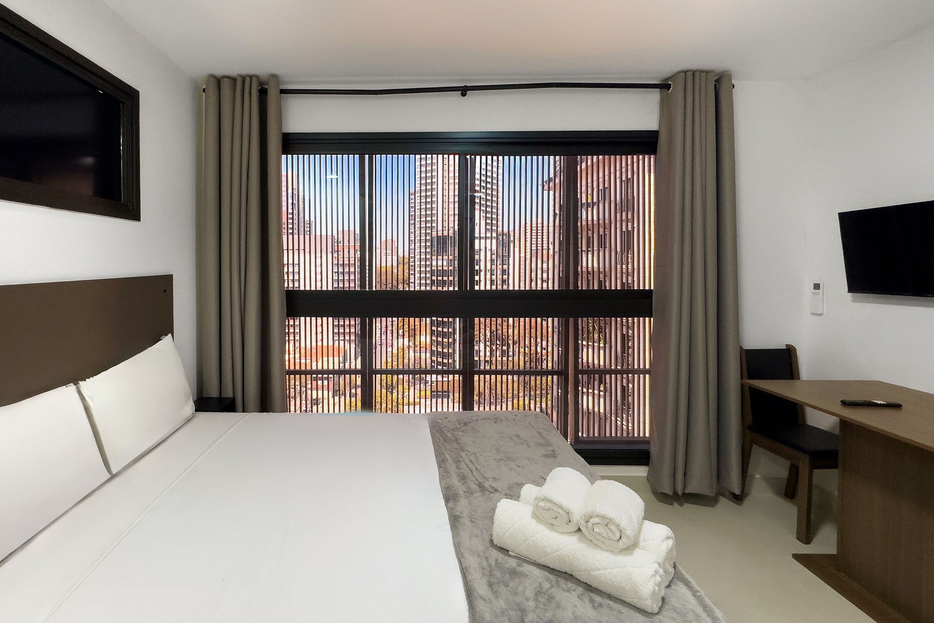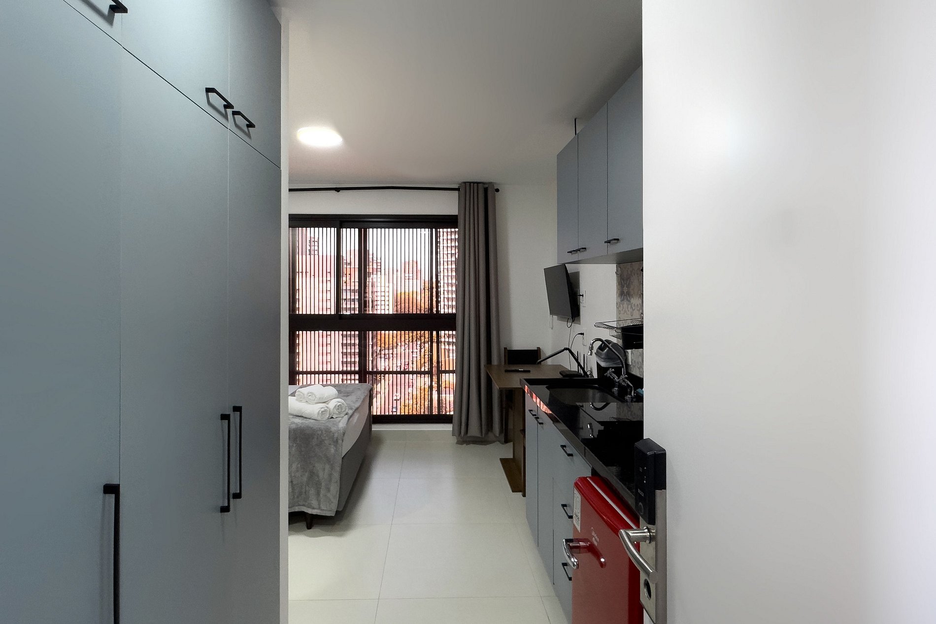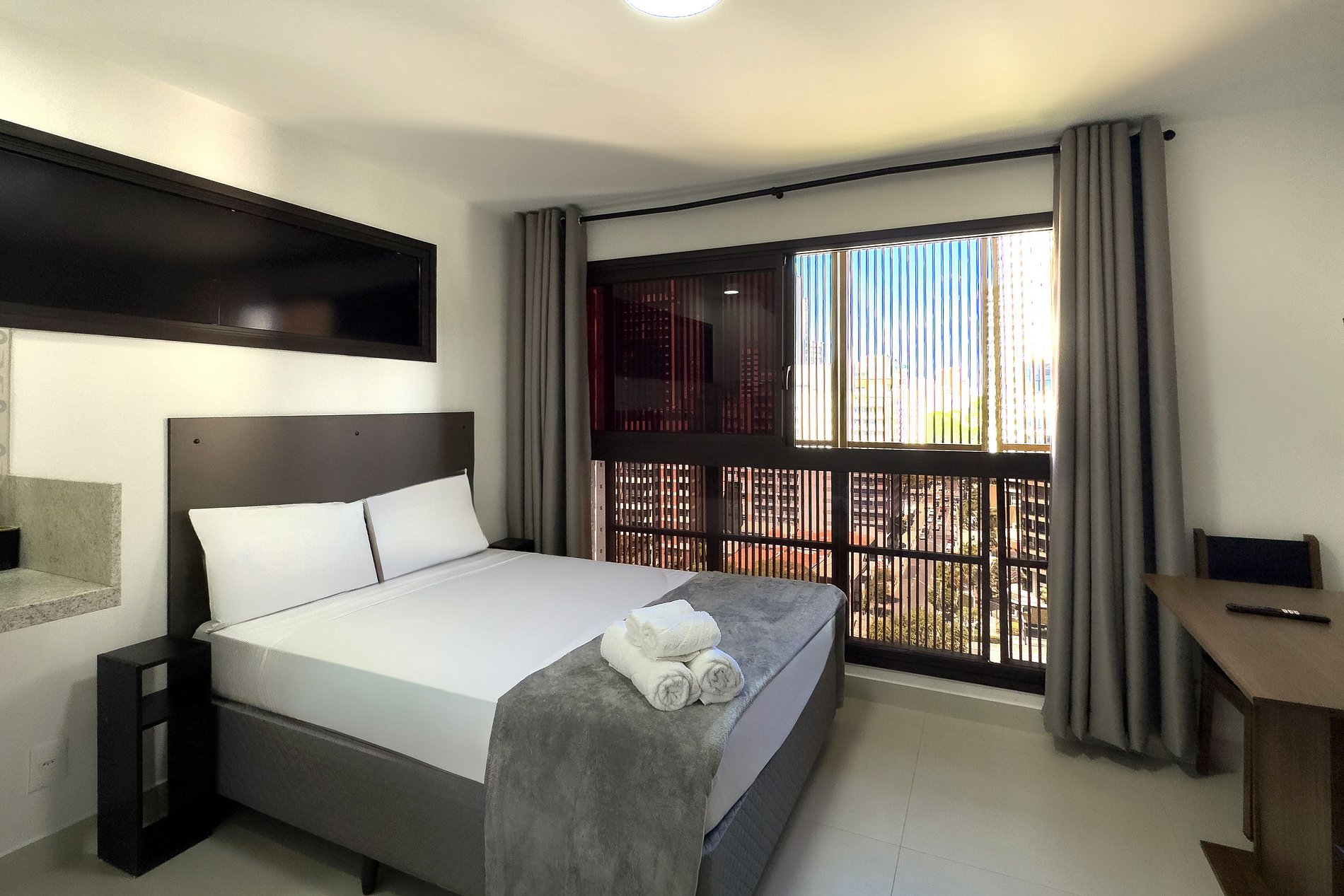 O apartamento possui 1 cama de casal (1,38x1,88) Cozinha completa com frigobar , micro-ondas, fogão de (2 bocas), cafeteira, bancada para home office, guarda-roupa, secador de cabelo, ferro de passar, TV e banheiro com ótimo chuveiro (água quente e fria). Será fornecido um jogo de enxoval (lençóis, travesseiros, fronhas e toalhas de banho e rosto) por hóspede. Não há trocas durante a permanência.