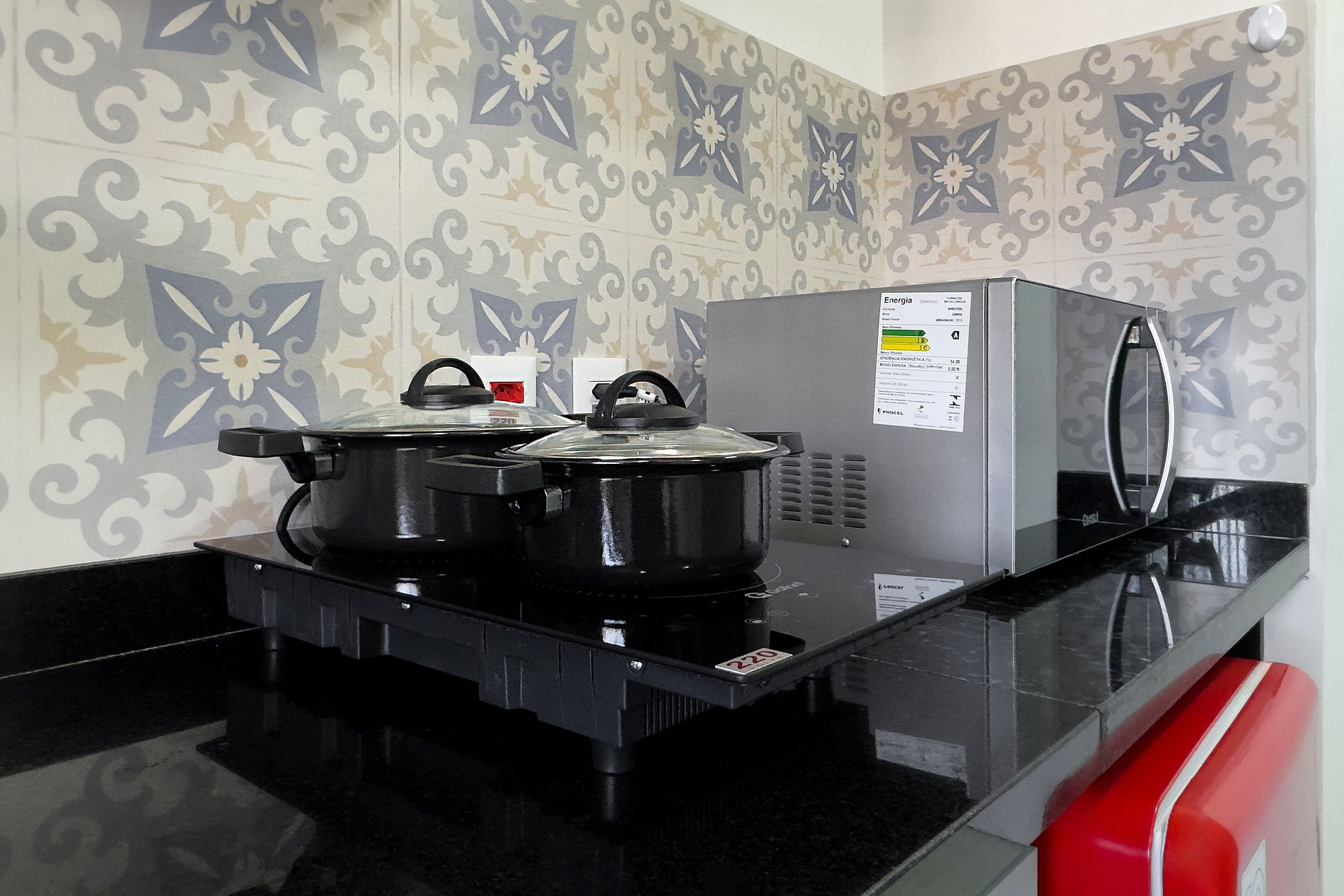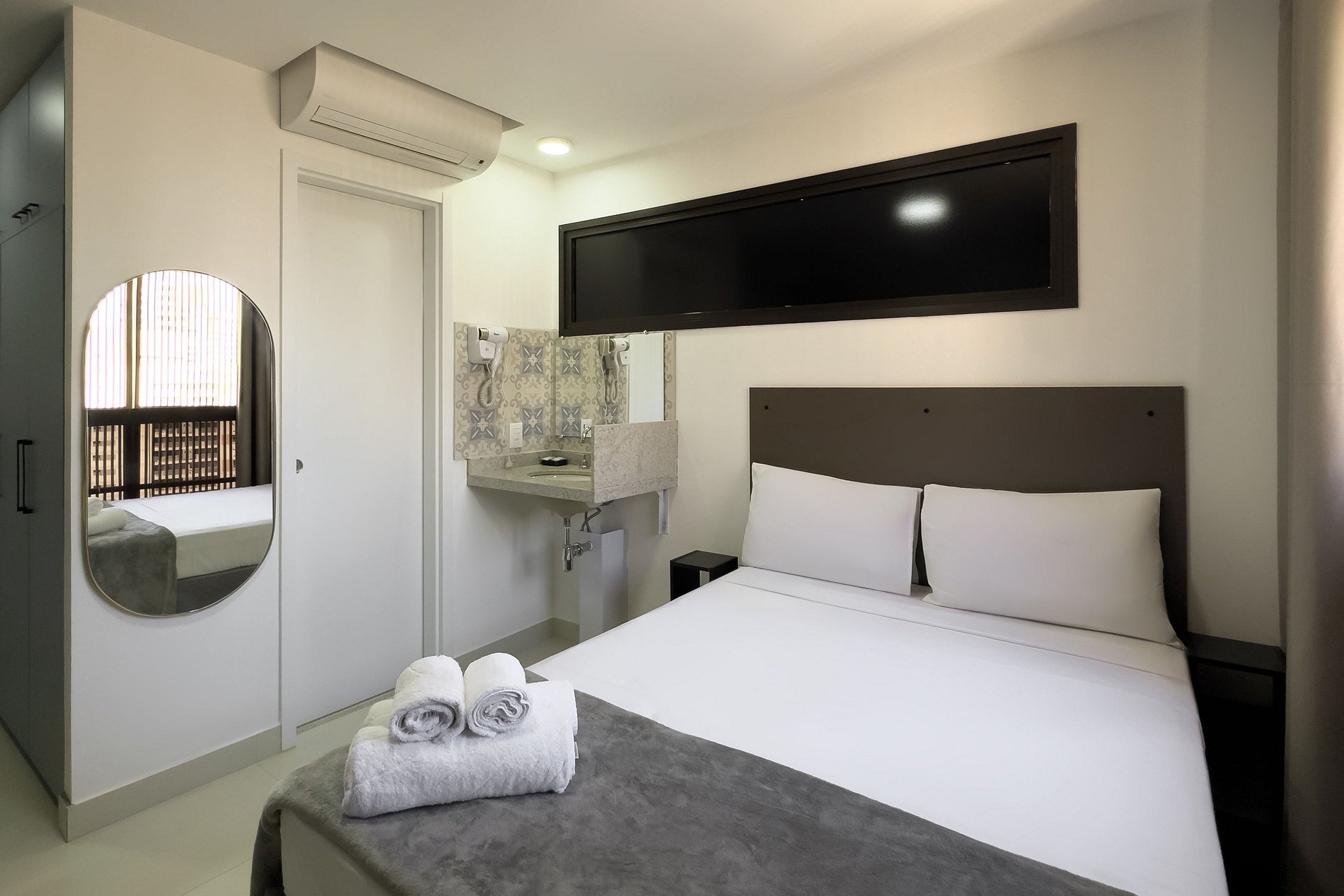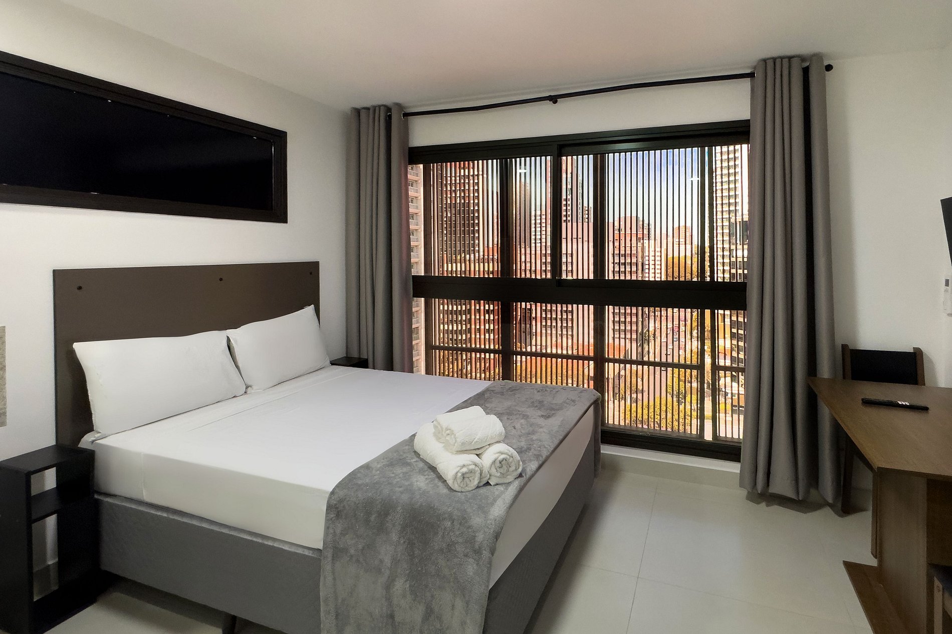 O apartamento possui 1 cama de casal (1,38x1,88) Cozinha completa com frigobar , micro-ondas, fogão de (2 bocas), cafeteira, bancada para home office, guarda-roupa, secador de cabelo, ferro de passar, TV e banheiro com ótimo chuveiro (água quente e fria). Será fornecido um jogo de enxoval (lençóis, travesseiros, fronhas e toalhas de banho e rosto) por hóspede. Não há trocas durante a permanência.