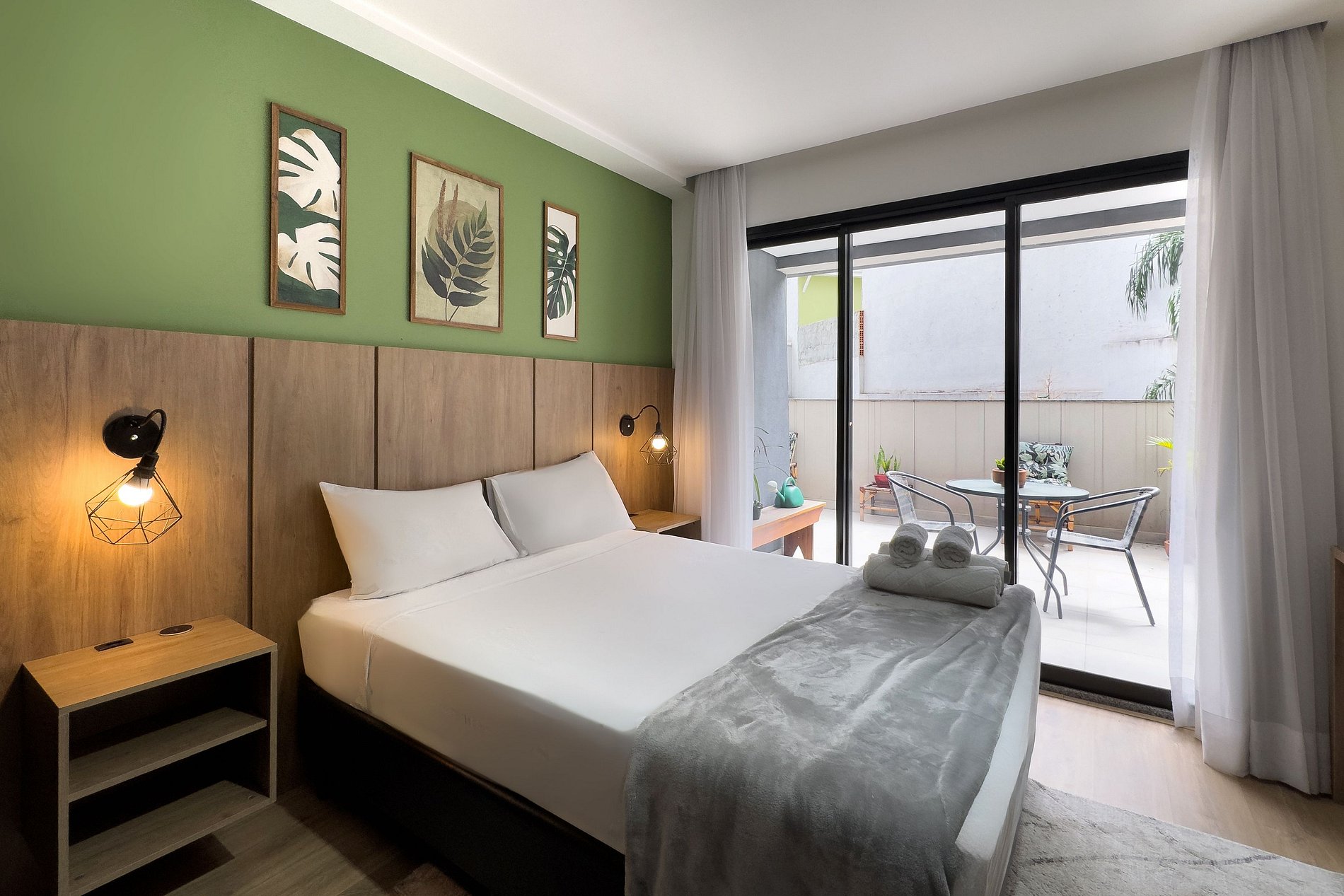 O apartamento possui 1 cama de casal (1,38x1,88), e ar-condicionado. Cozinha completa com geladeira, freezer, micro-ondas, fogão de indução, jogo de talheres, cafeteira expressa para home office, misteira, guarda-roupa, mesa, 2 Cadeira Interna, TV e banheiro com ótimo chuveiro (água quente e fria). Será fornecido um jogo de enxoval (lençóis, travesseiros, fronhas e toalhas de banho) por hóspede.