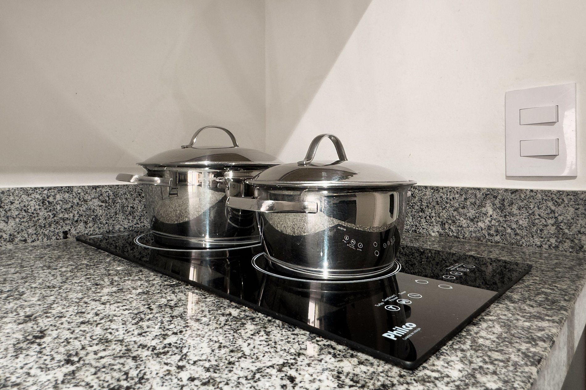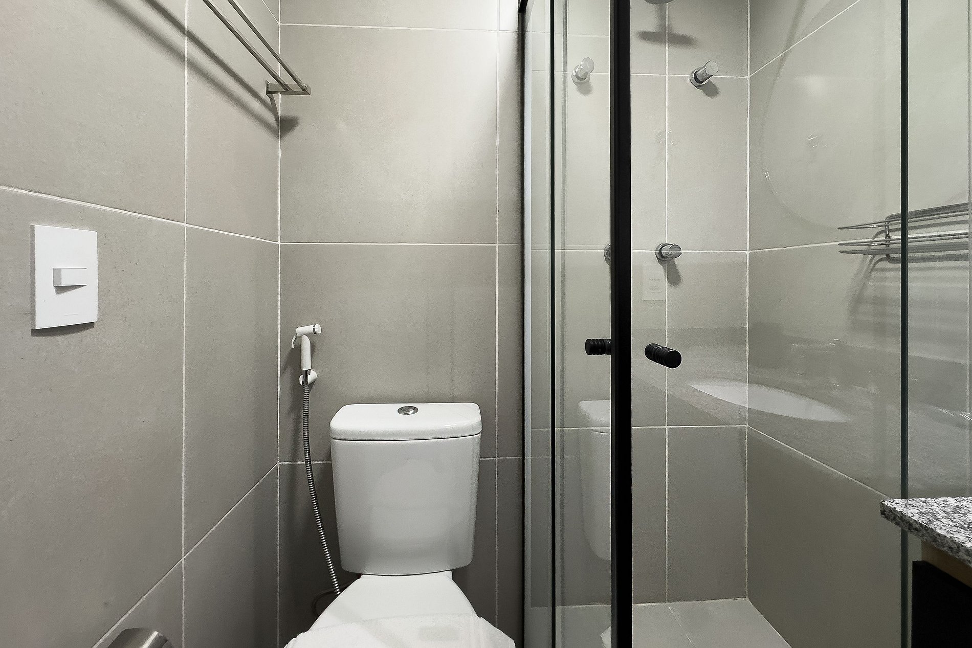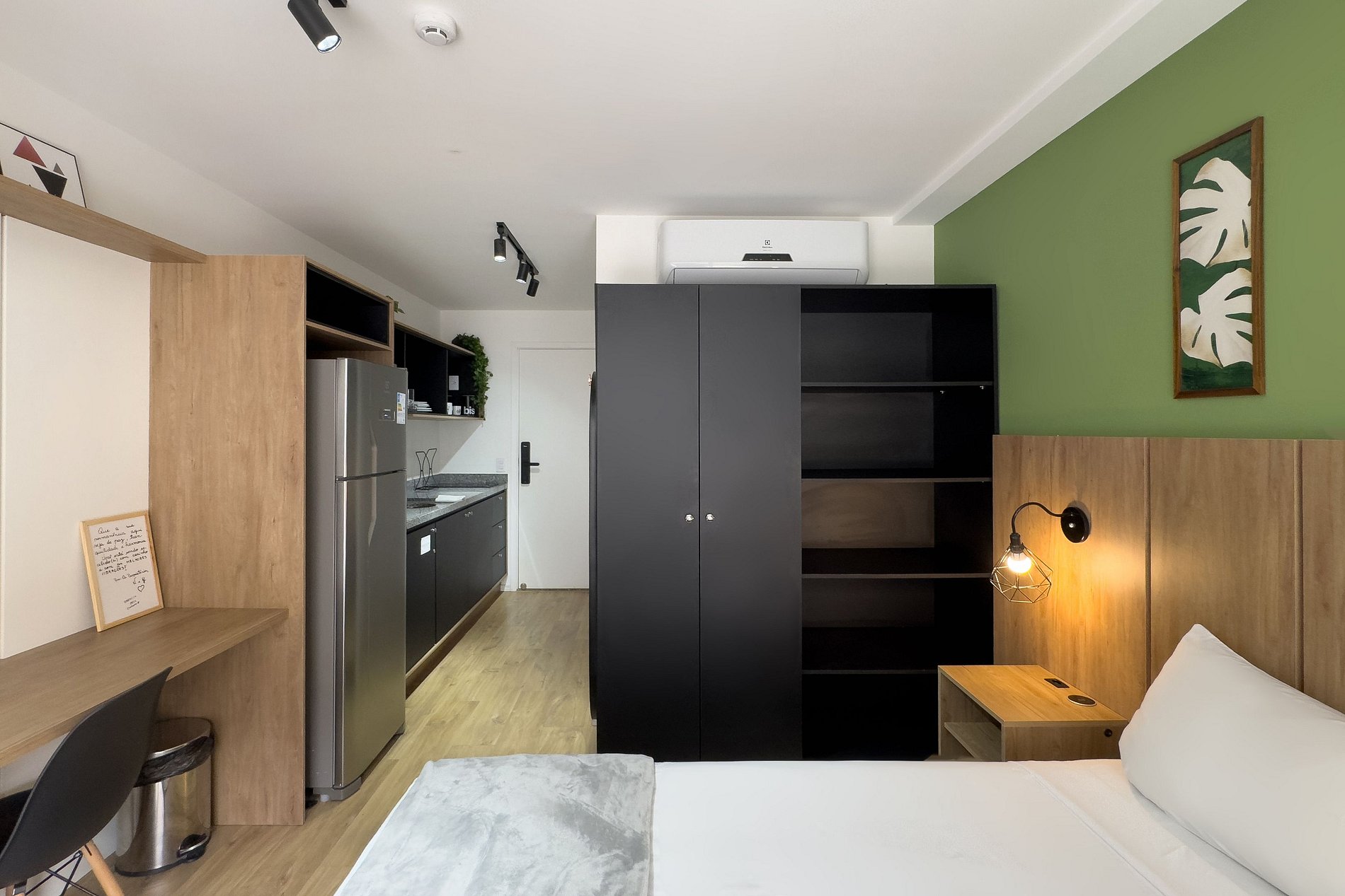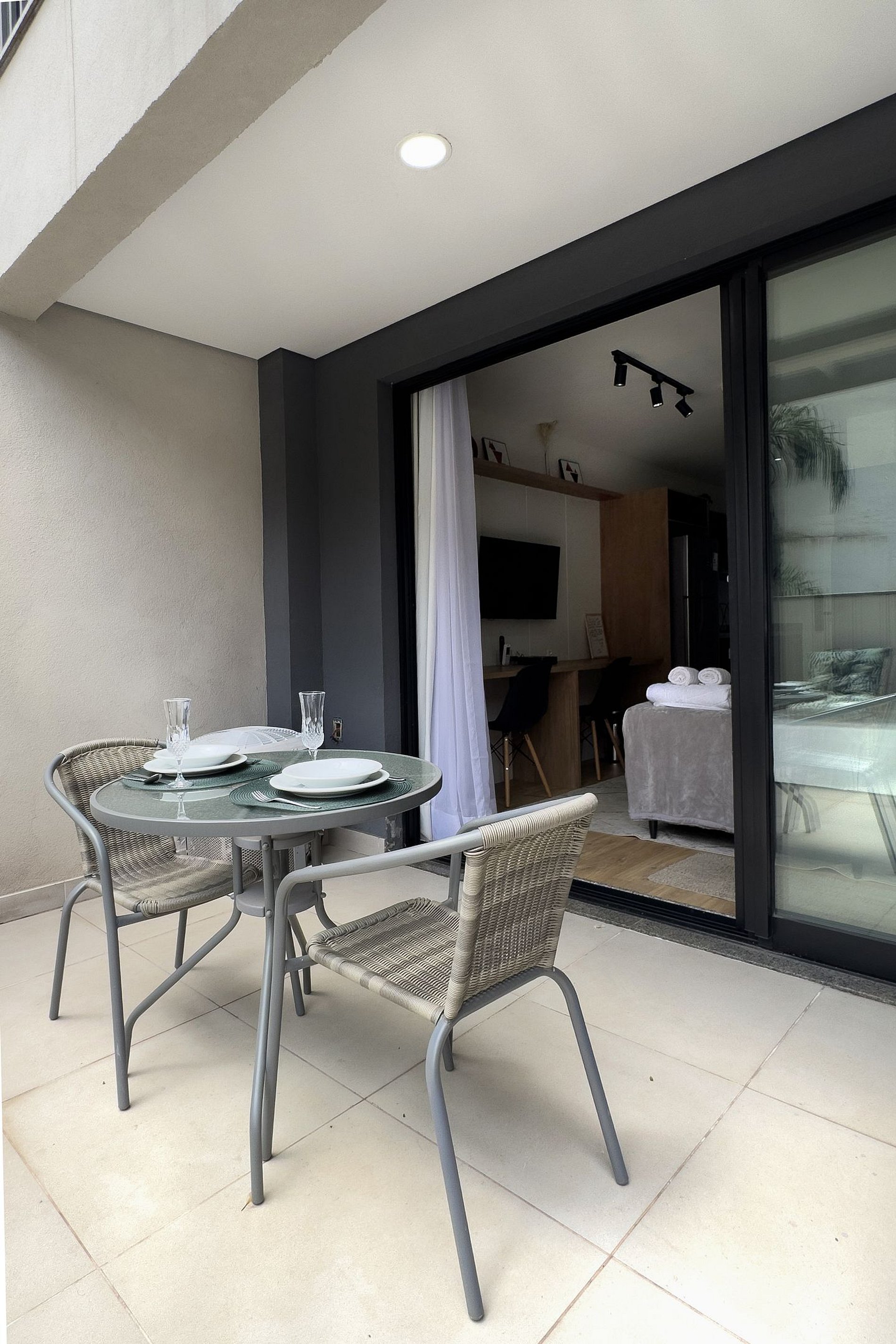 O apartamento possui 1 cama de casal (1,38x1,88), e ar-condicionado. Cozinha completa com geladeira, freezer, micro-ondas, fogão de indução, jogo de talheres, cafeteira expressa para home office, misteira, guarda-roupa, mesa, 2 Cadeira Interna, TV e banheiro com ótimo chuveiro (água quente e fria). Será fornecido um jogo de enxoval (lençóis, travesseiros, fronhas e toalhas de banho) por hóspede.