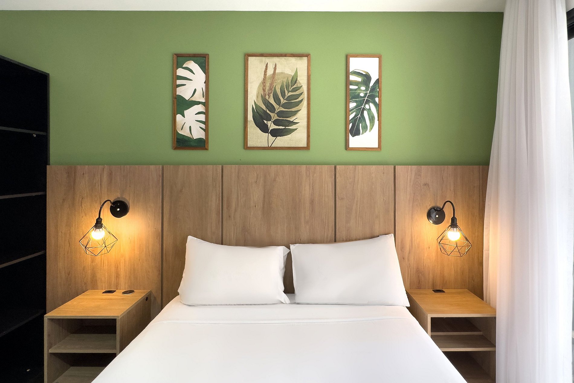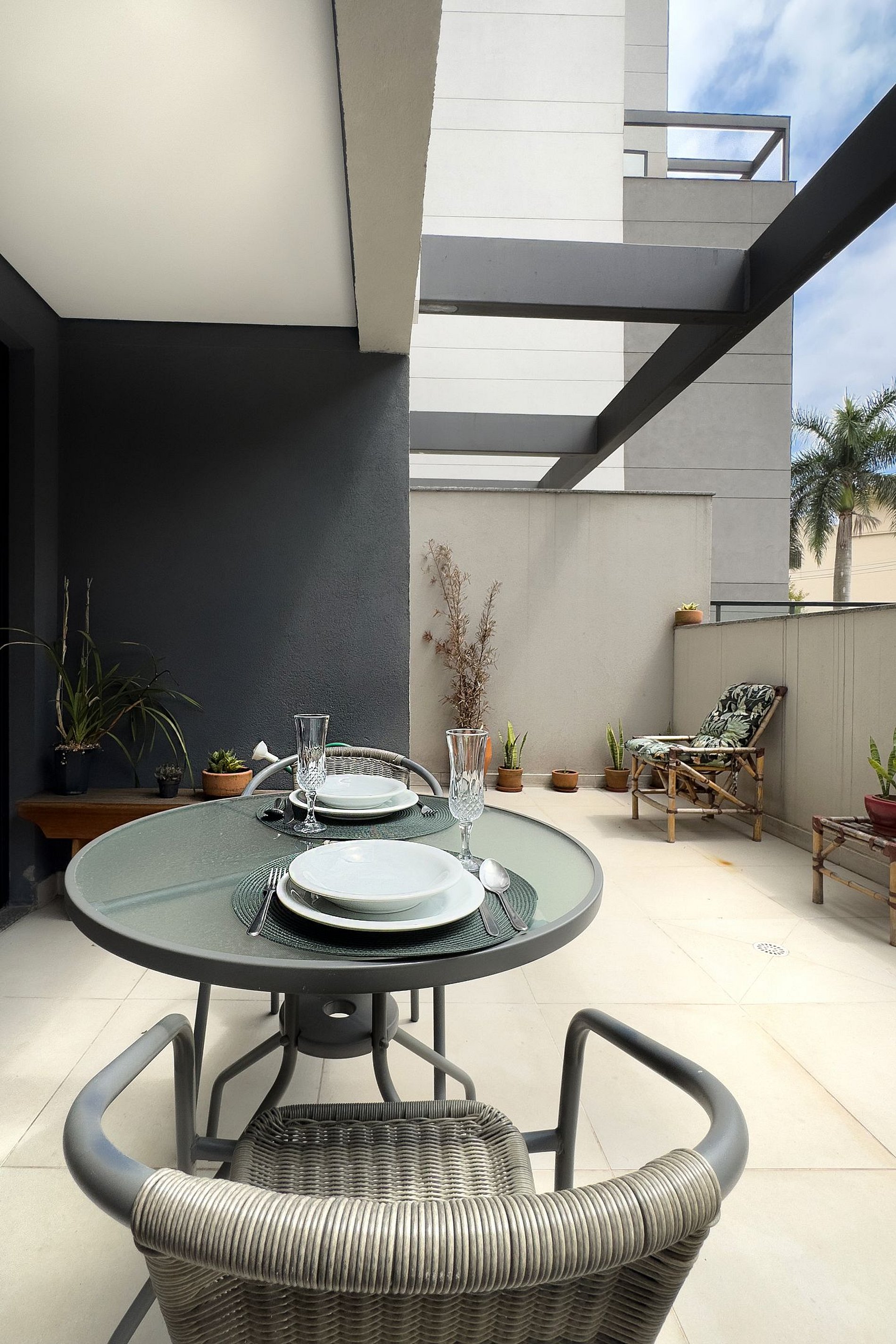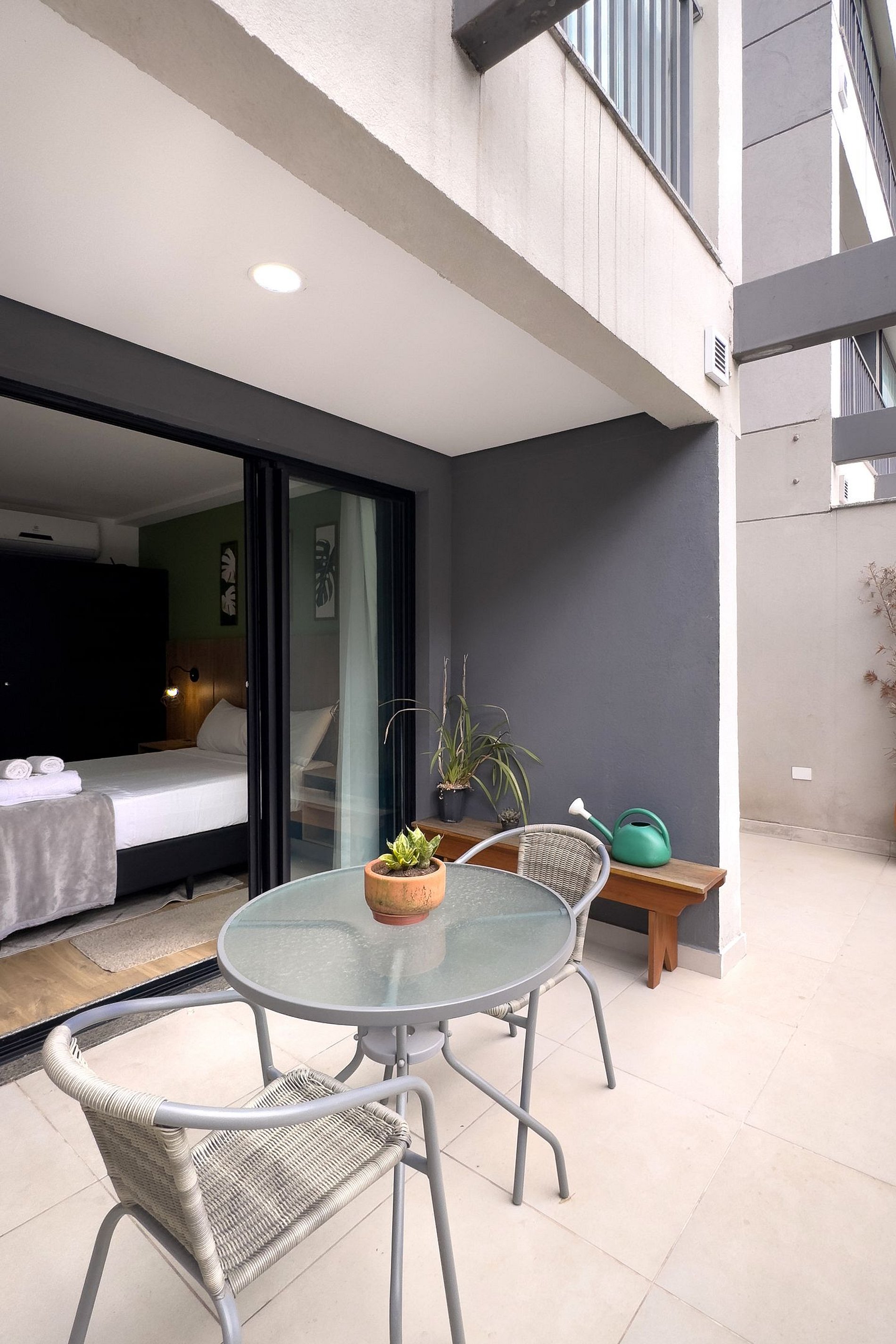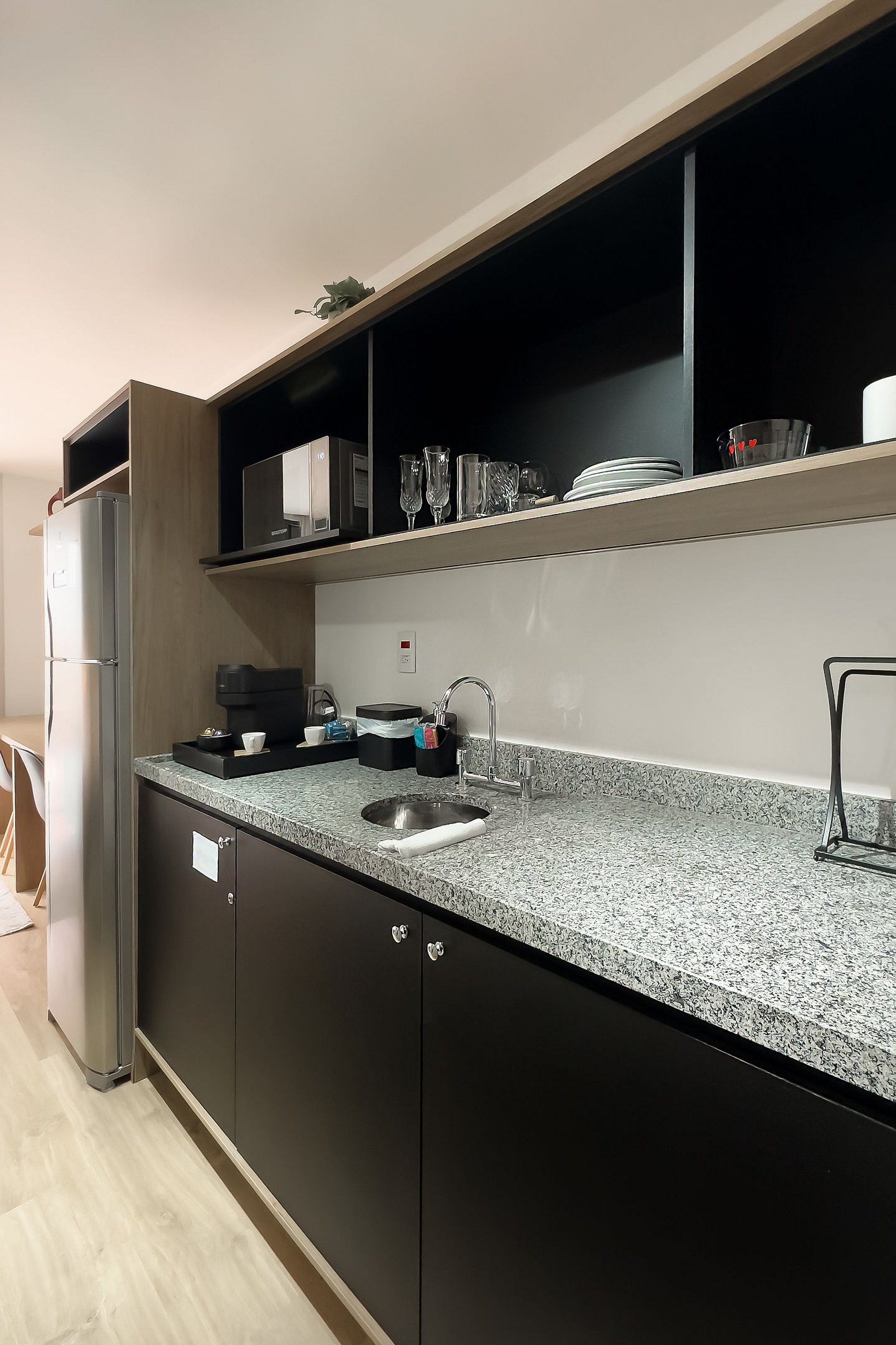 O apartamento possui 1 cama de casal (1,38x1,88), e ar-condicionado. Cozinha completa com geladeira, freezer, micro-ondas, fogão de indução, jogo de talheres, cafeteira expressa para home office, misteira, guarda-roupa, mesa, 2 Cadeira Interna, TV e banheiro com ótimo chuveiro (água quente e fria). Será fornecido um jogo de enxoval (lençóis, travesseiros, fronhas e toalhas de banho) por hóspede.