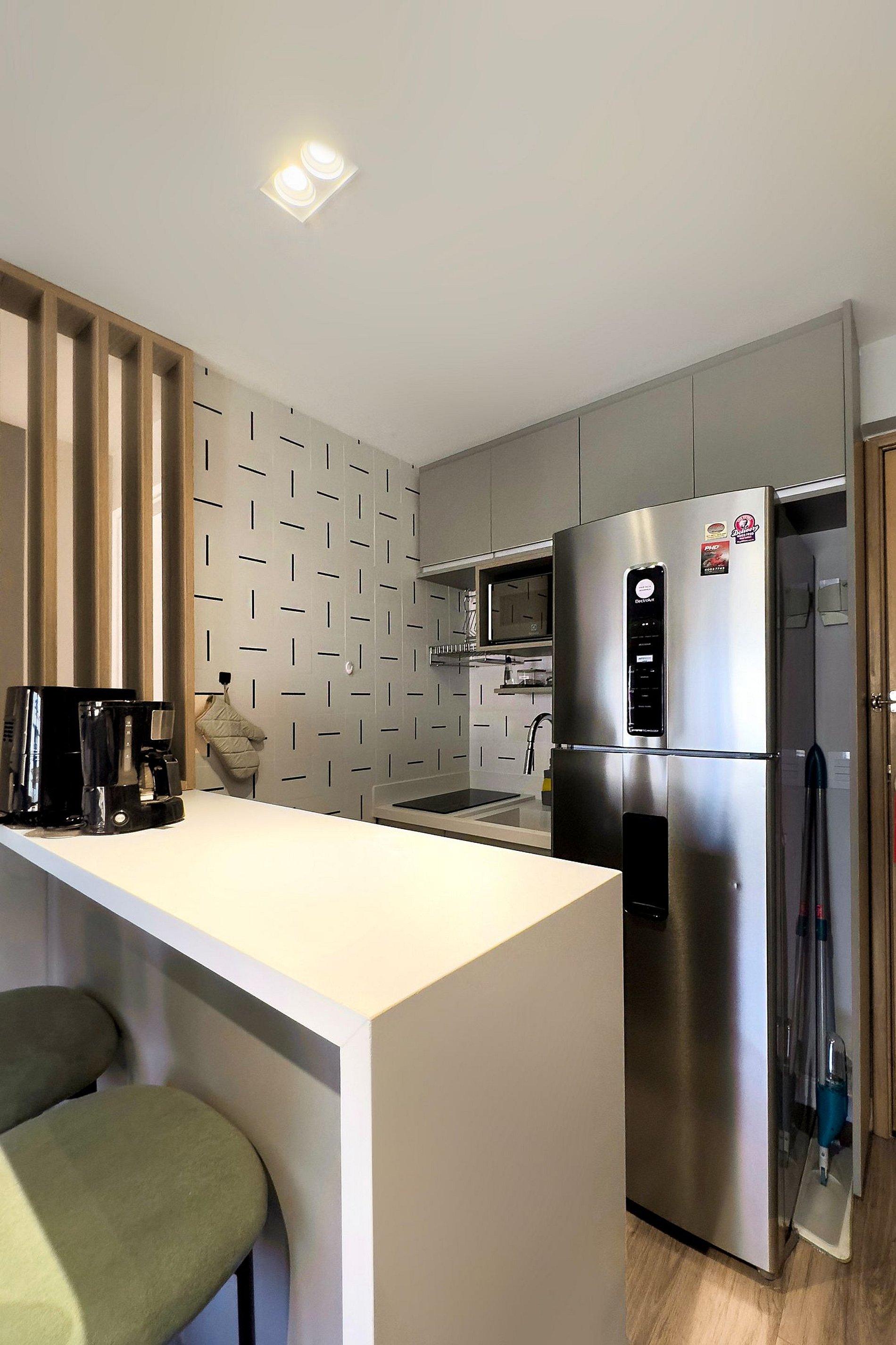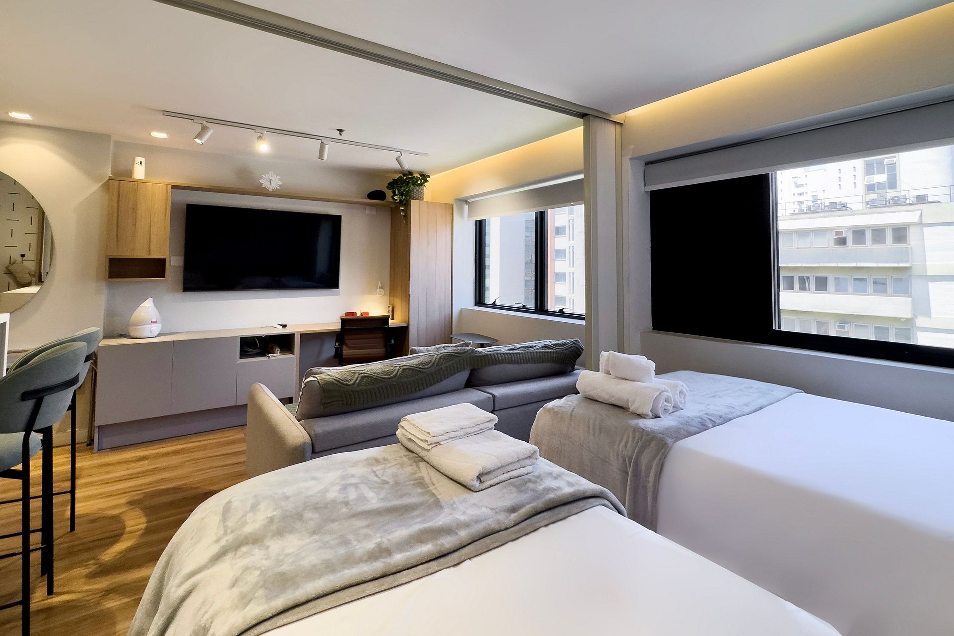 O apartamento possui 1 cama de casal (1,38x1,88), 1 cama de solteiro . Cozinha completa com geladeira, freezer, micro-ondas, fogão de (2 bocas), Nespresso, bancada para home office, guarda-roupa, secador de cabelo, ferro de passar, TV e banheiro com ótimo chuveiro (água quente e fria). Será fornecido um jogo de enxoval (lençóis, travesseiros, fronhas e toalhas de banho e rosto) por hóspede. Não há trocas durante a permanência.
