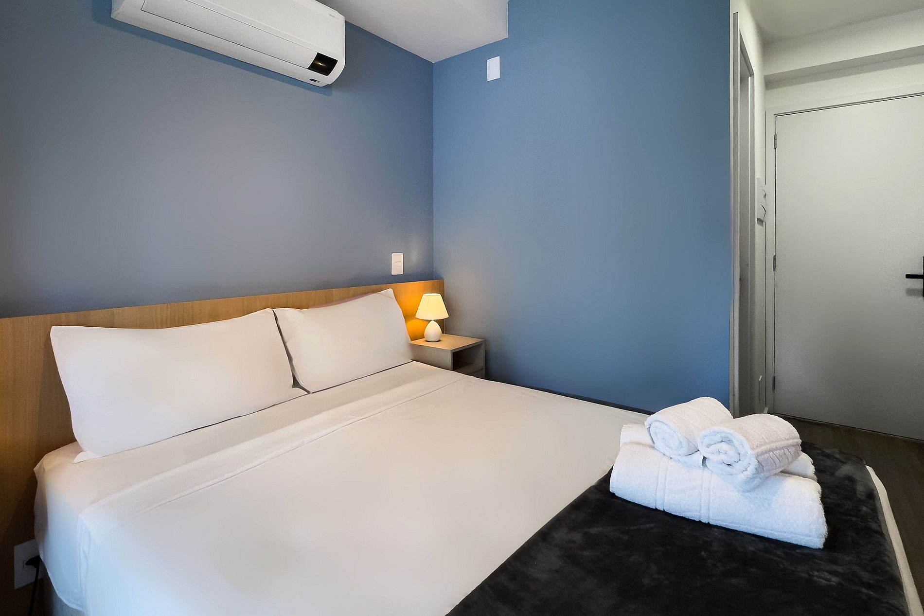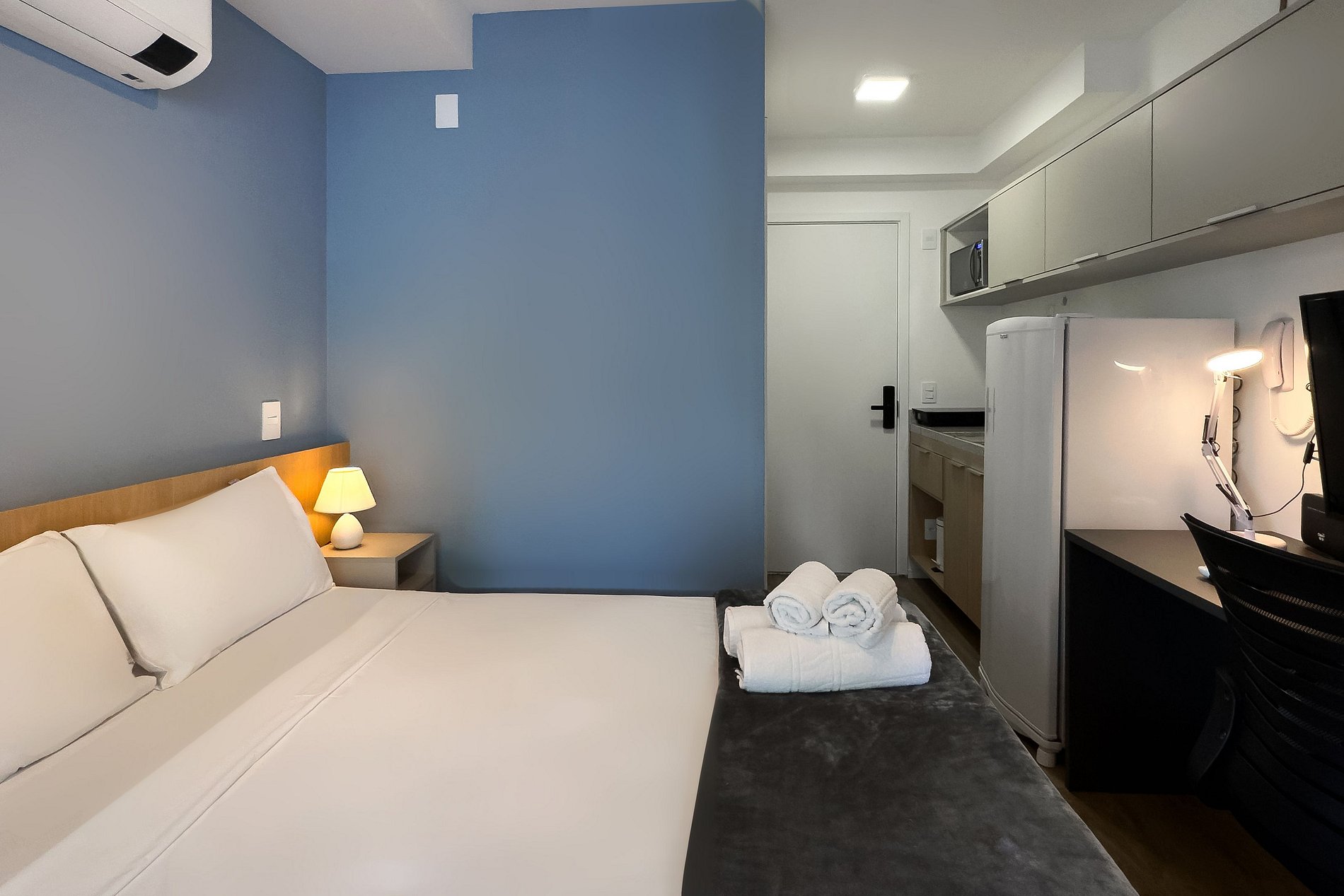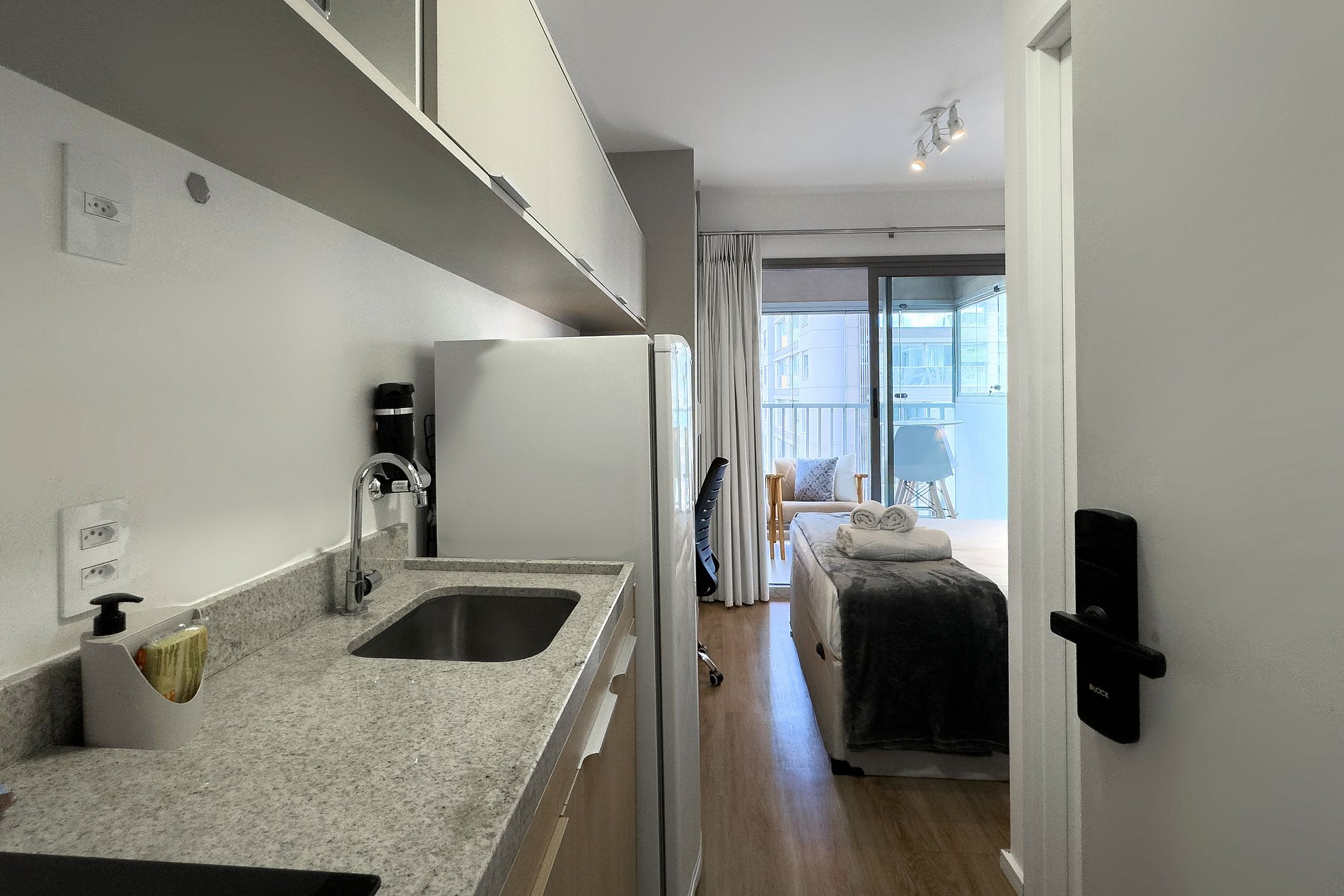 O apartamento possui 1 cama de casal (1,38x1,88) Cozinha completa com geladeira, freezer, micro-ondas, fogão de (2 bocas), Nespresso, bancada para home office, guarda-roupa, secador de cabelo, ferro de passar, TV e banheiro com ótimo chuveiro (água quente e fria). Será fornecido um jogo de enxoval (lençóis, travesseiros, fronhas e toalhas de banho e rosto) por hóspede. Não há trocas durante a permanência.