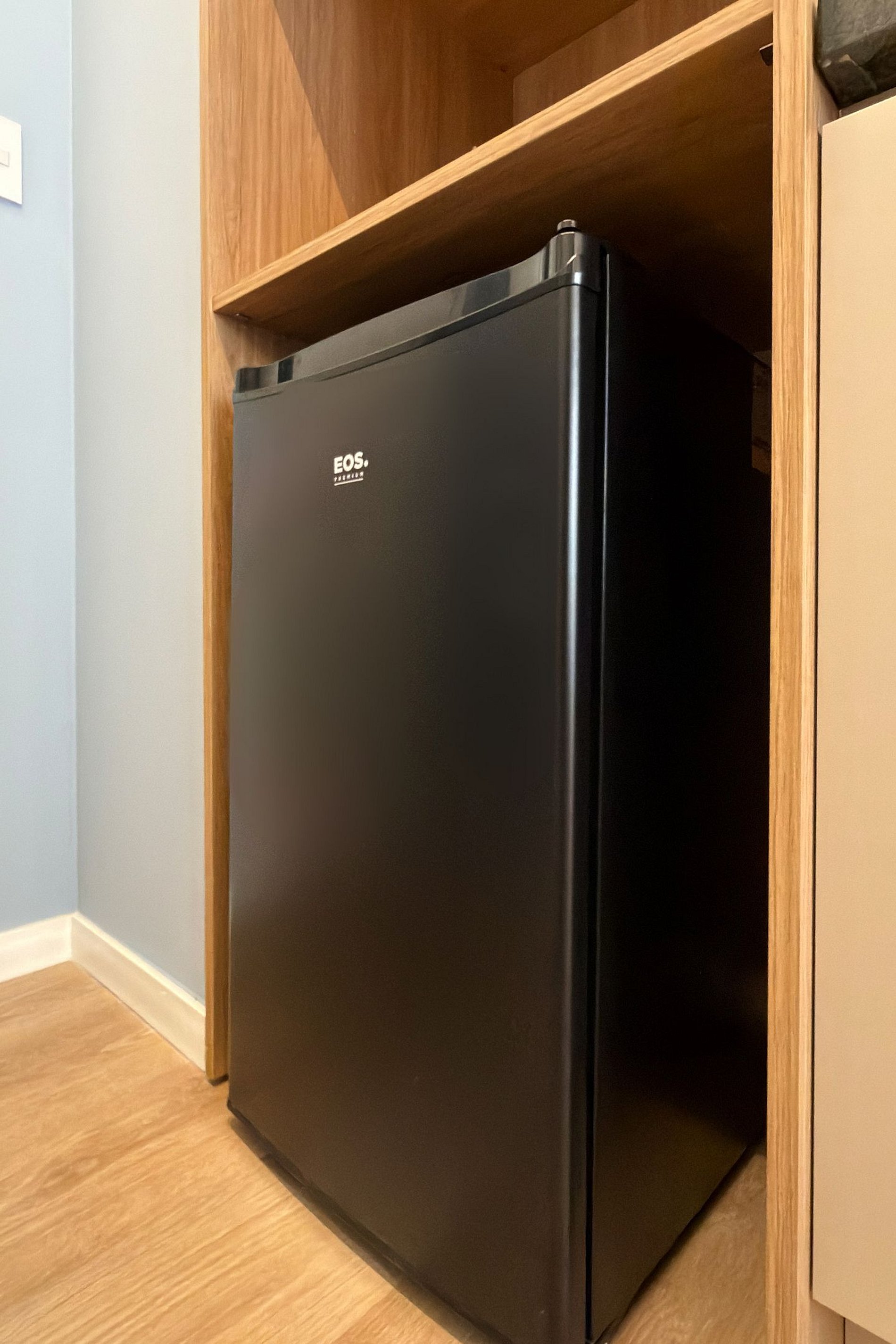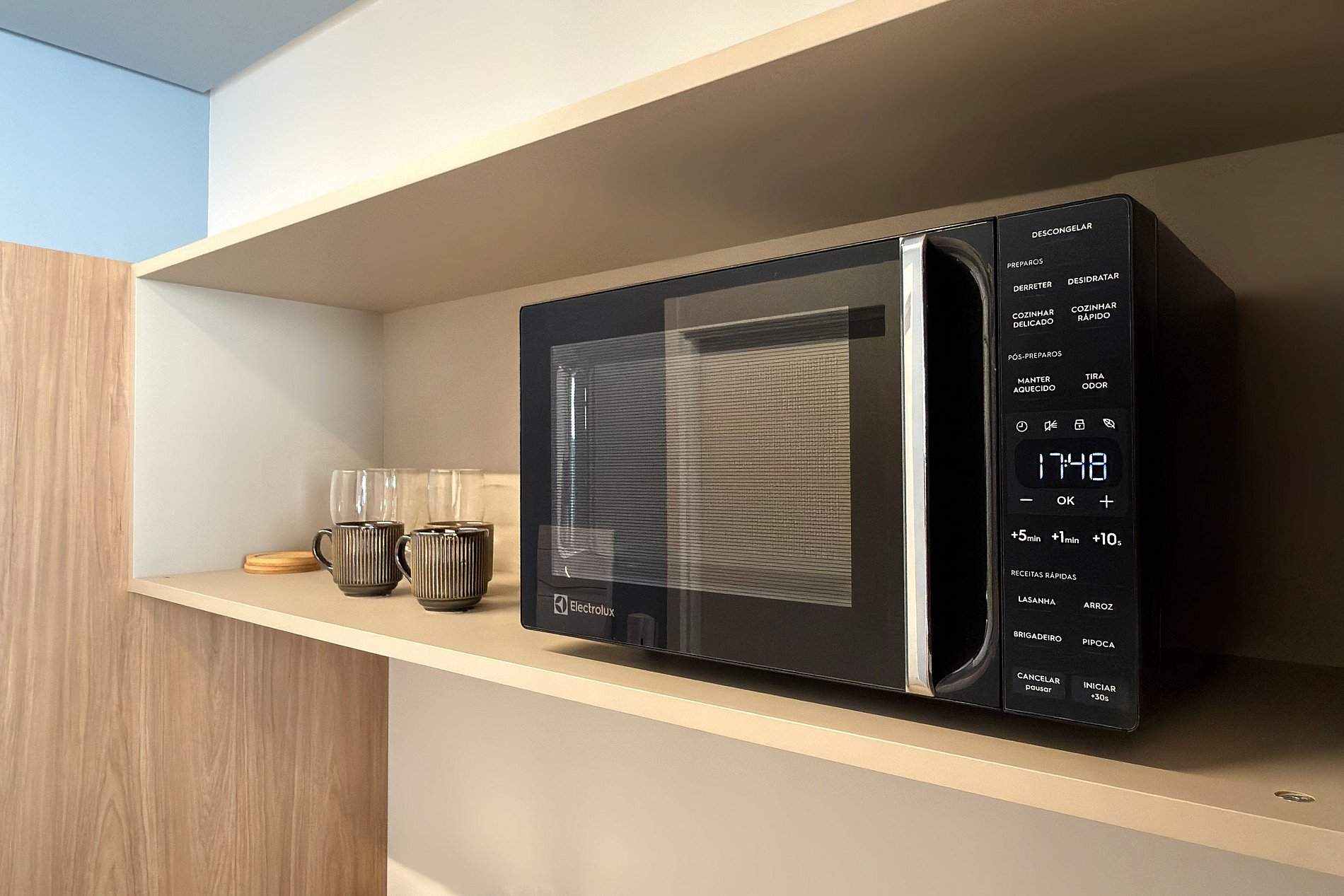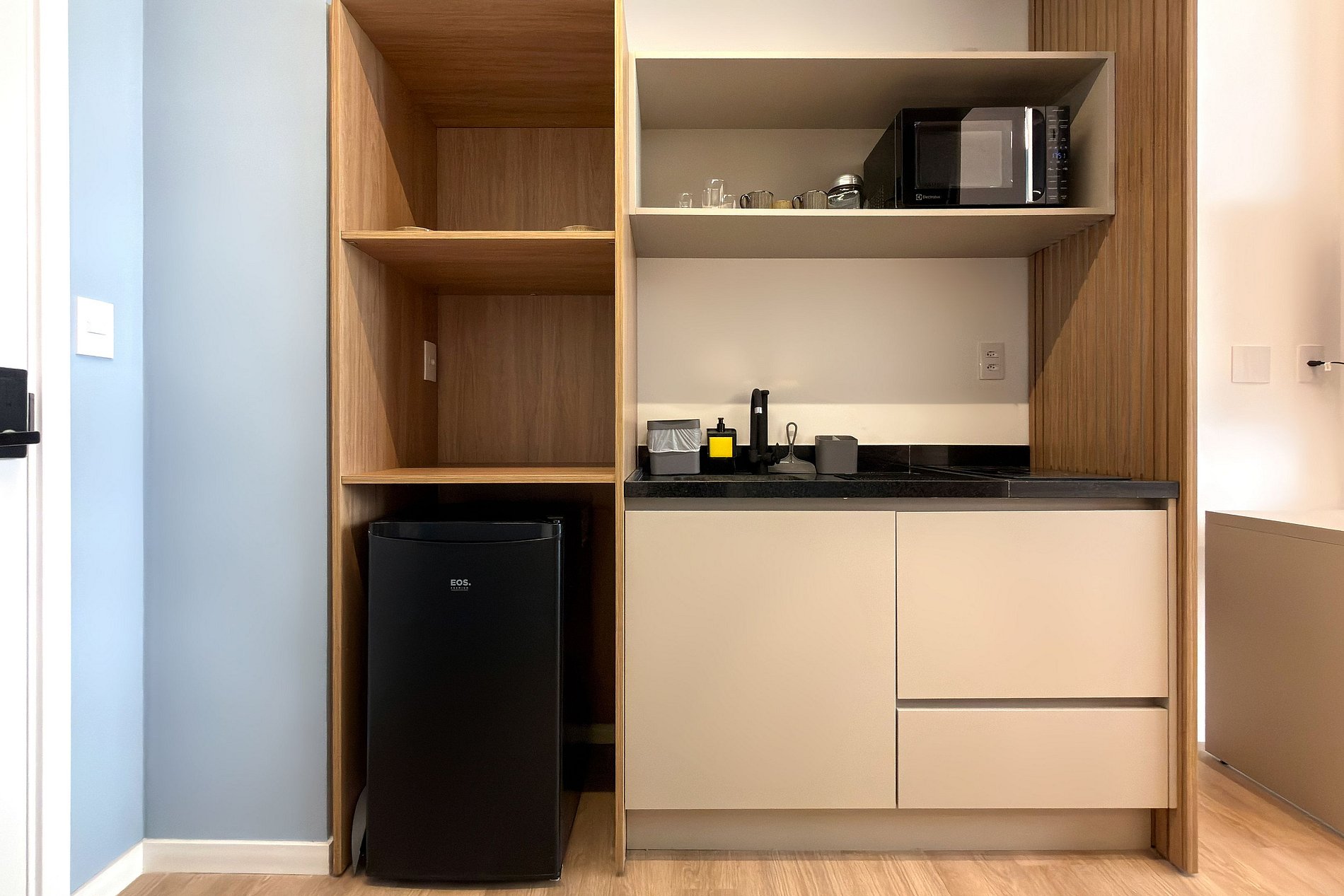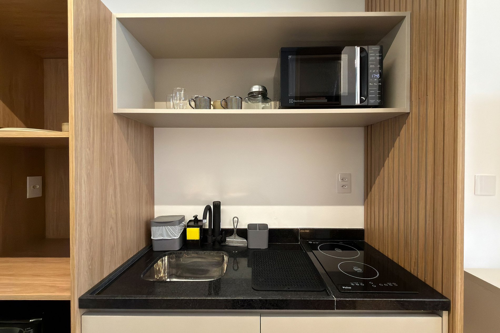 1 Mini Cozinha com frigobar, micro-ondas, cooktop e utensílios básicos.