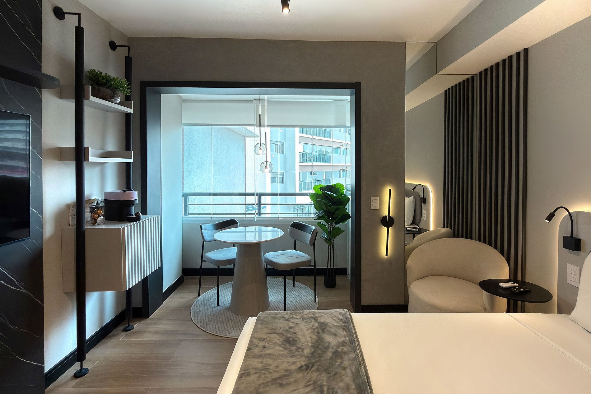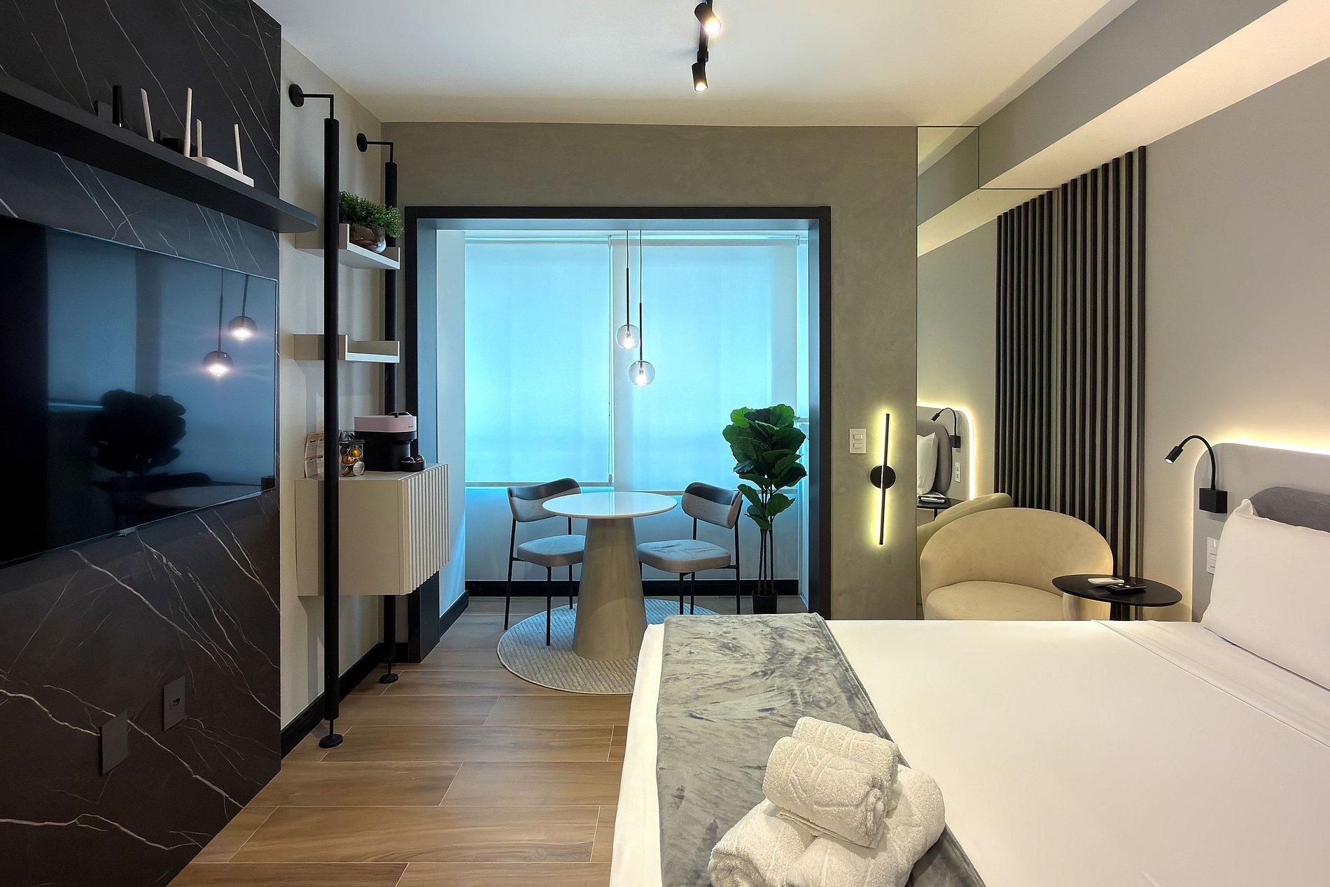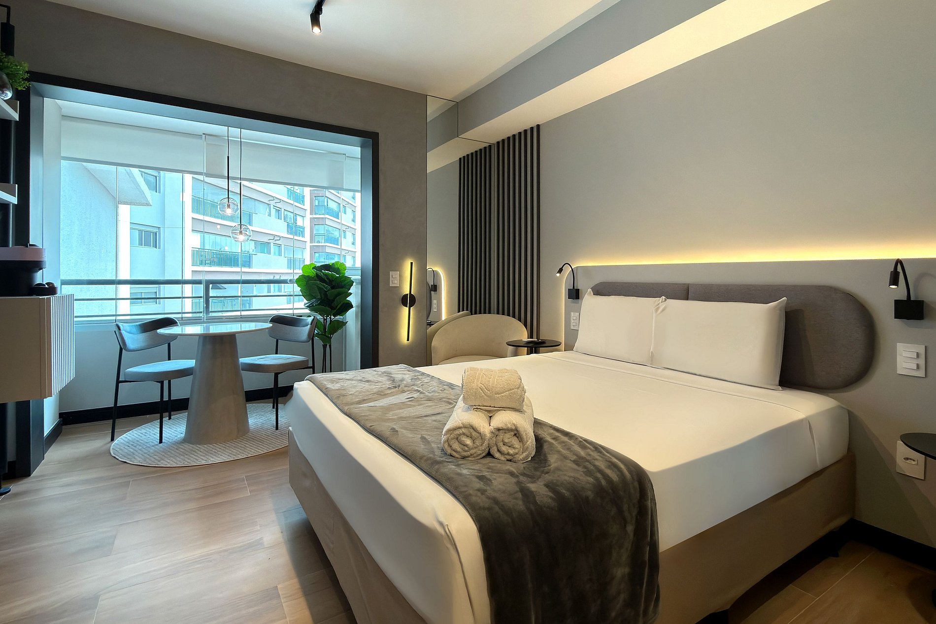 Este estúdio moderno e funcional oferece tudo o que você precisa para uma estadia confortável. O ambiente conta com uma cama de casal aconchegante, decoração contemporânea e uma cozinha compacta equipada para refeições práticas. Além da mesa de jantar que também funciona como área de trabalho, o espaço inclui: