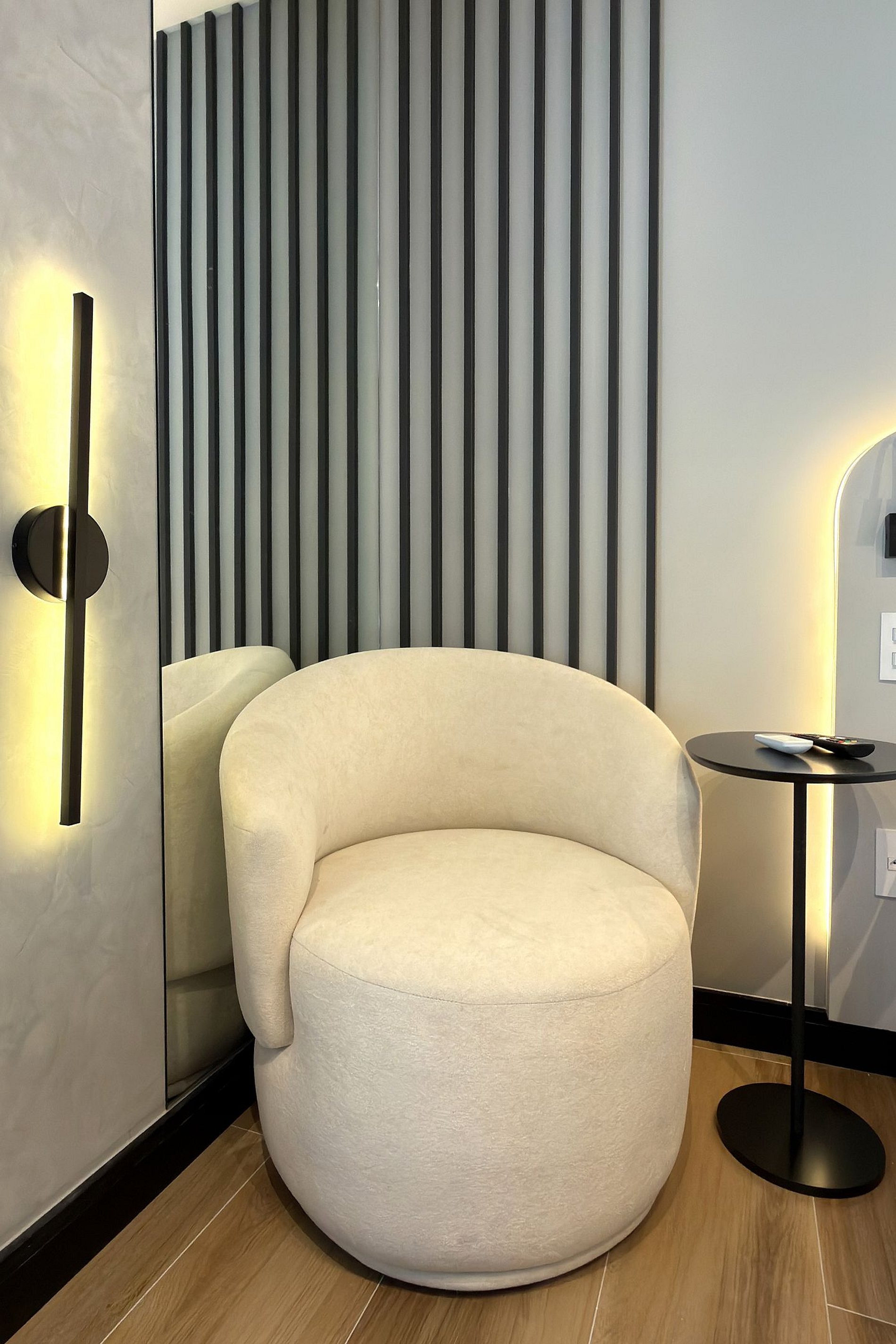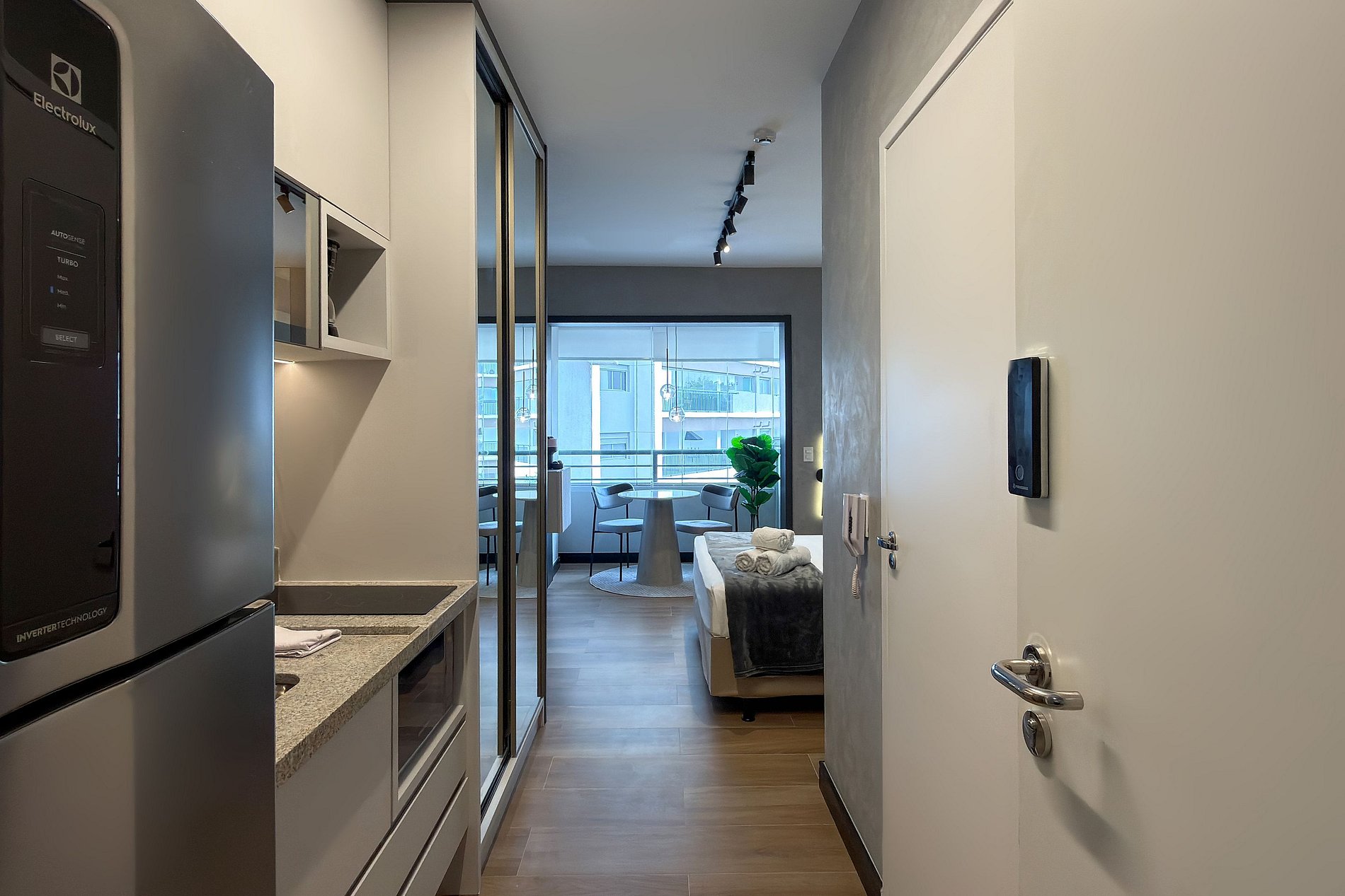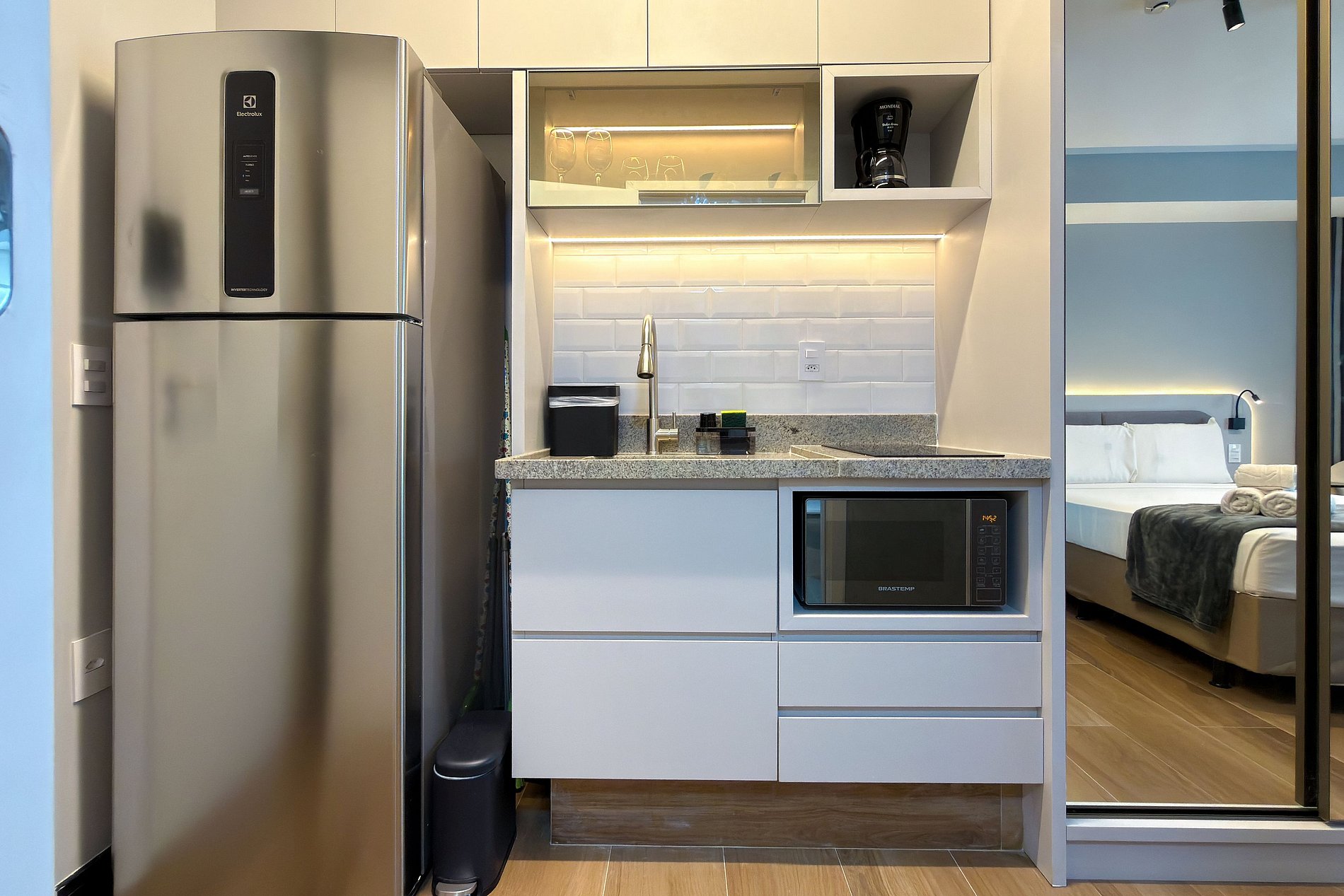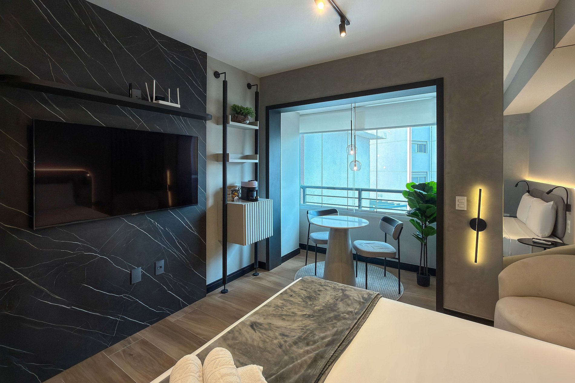 Este estúdio moderno e funcional oferece tudo o que você precisa para uma estadia confortável. O ambiente conta com uma cama de casal aconchegante, decoração contemporânea e uma cozinha compacta equipada para refeições práticas. Além da mesa de jantar que também funciona como área de trabalho, o espaço inclui: