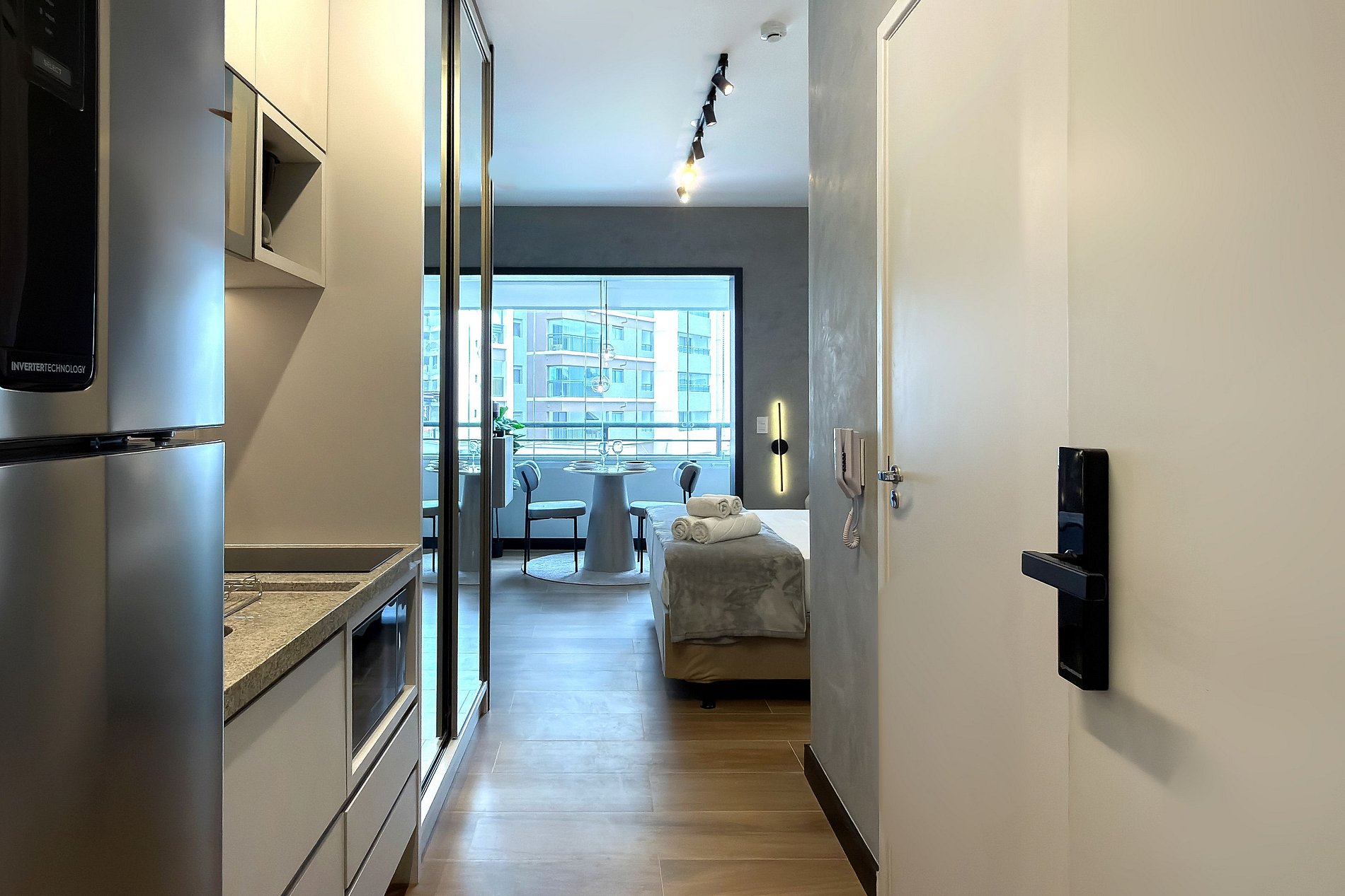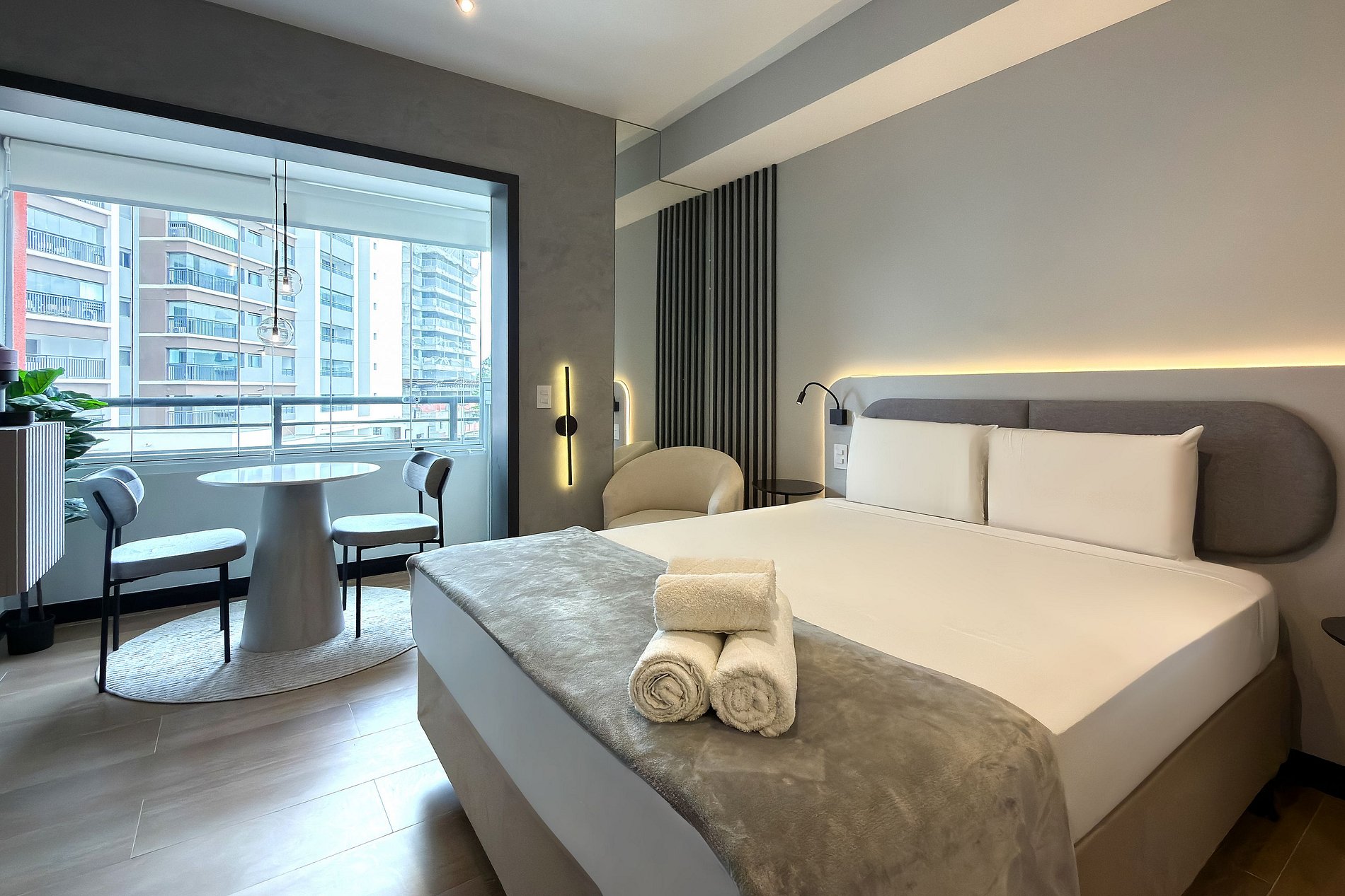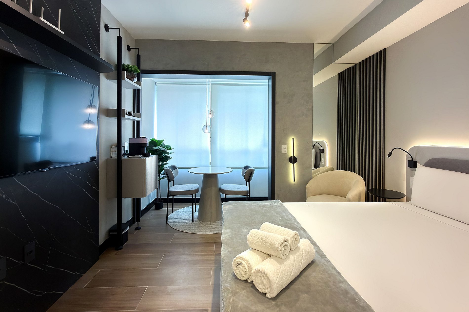 Este estúdio moderno e funcional oferece tudo o que você precisa para uma estadia confortável. O ambiente conta com uma cama de casal aconchegante, decoração contemporânea e uma cozinha compacta equipada para refeições práticas. Além da mesa de jantar que também funciona como área de trabalho, o espaço inclui:
