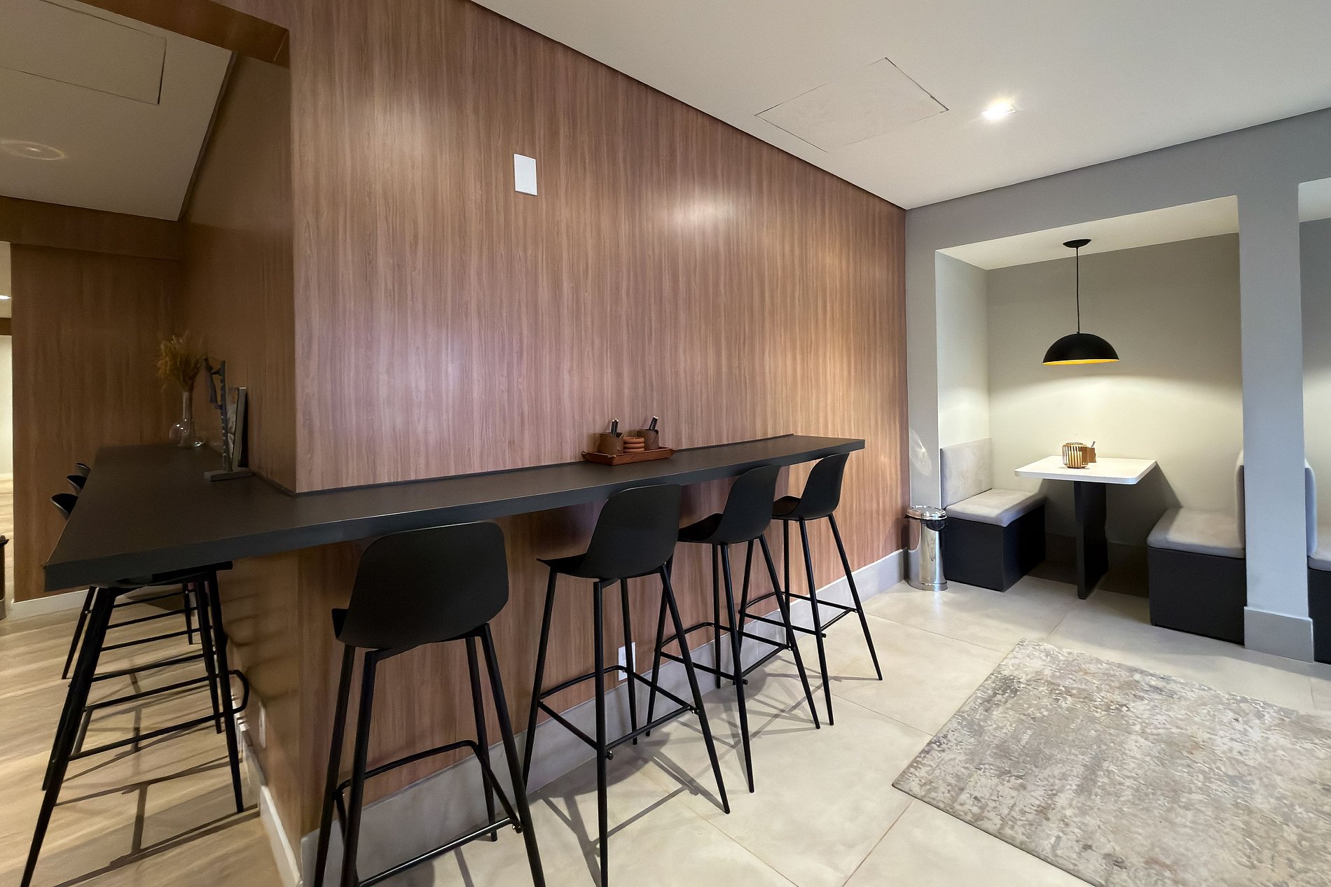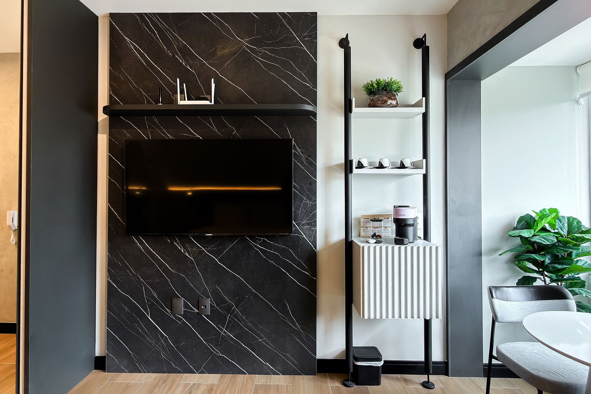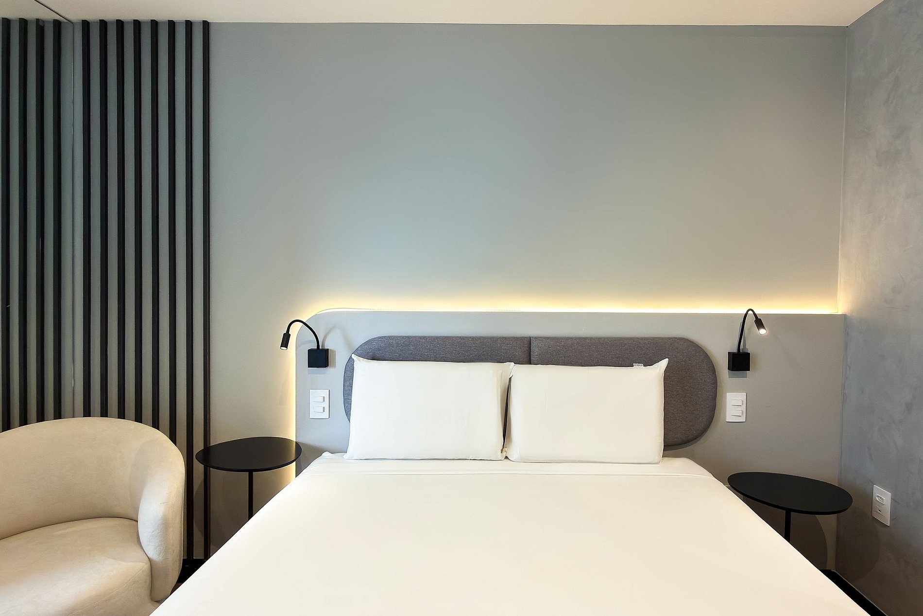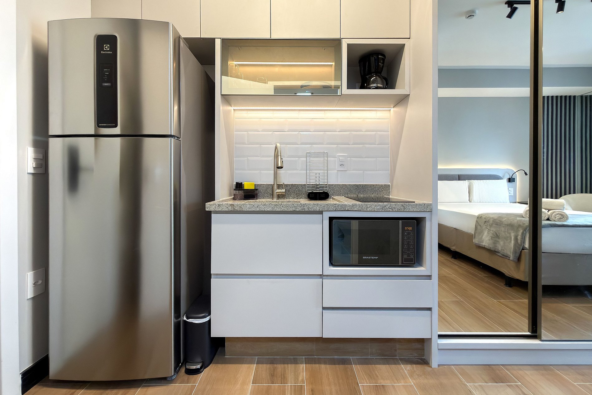Este estúdio moderno e funcional oferece tudo o que você precisa para uma estadia confortável. O ambiente conta com uma cama de casal aconchegante, decoração contemporânea e uma cozinha compacta equipada para refeições práticas. Além da mesa de jantar que também funciona como área de trabalho, o espaço inclui: