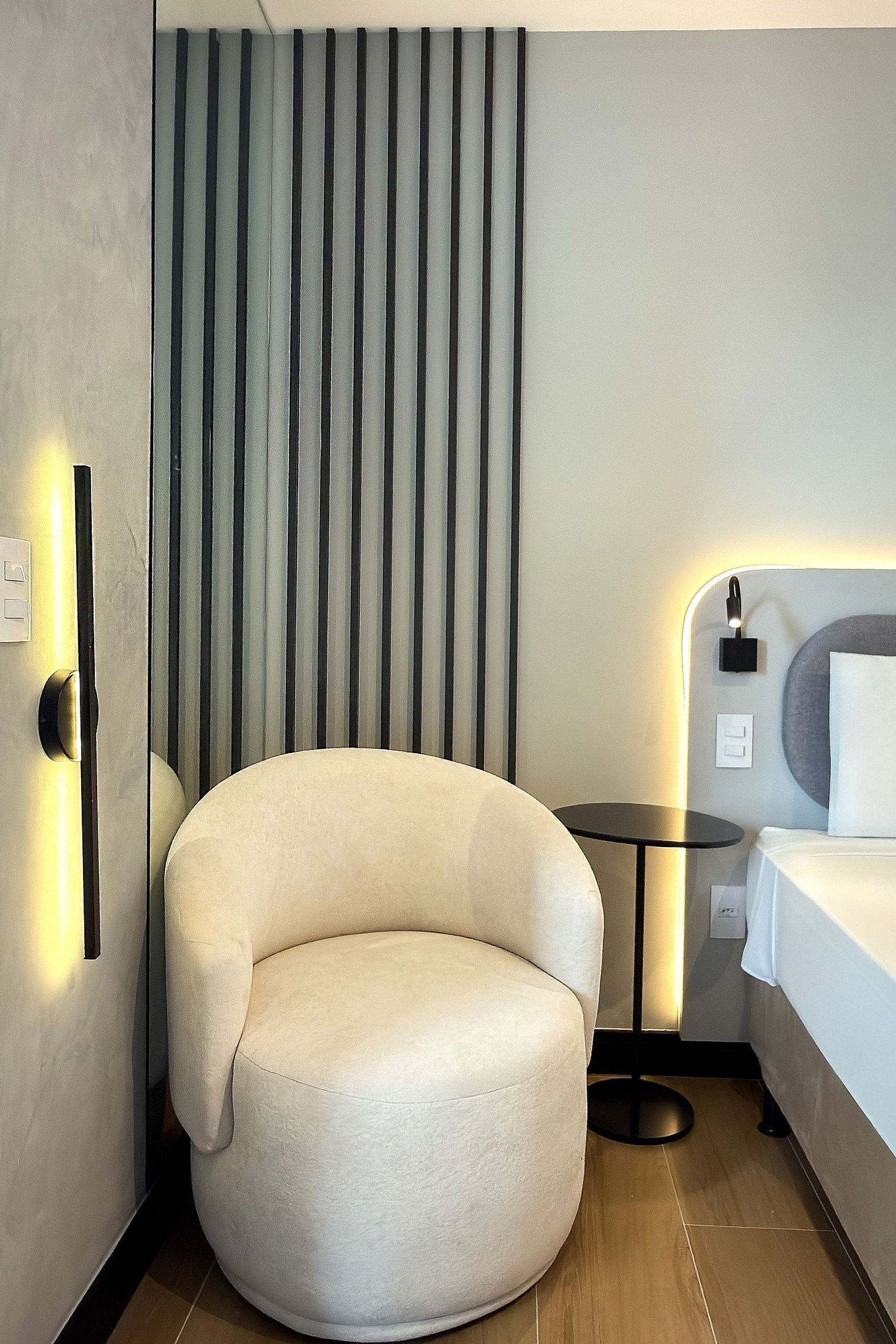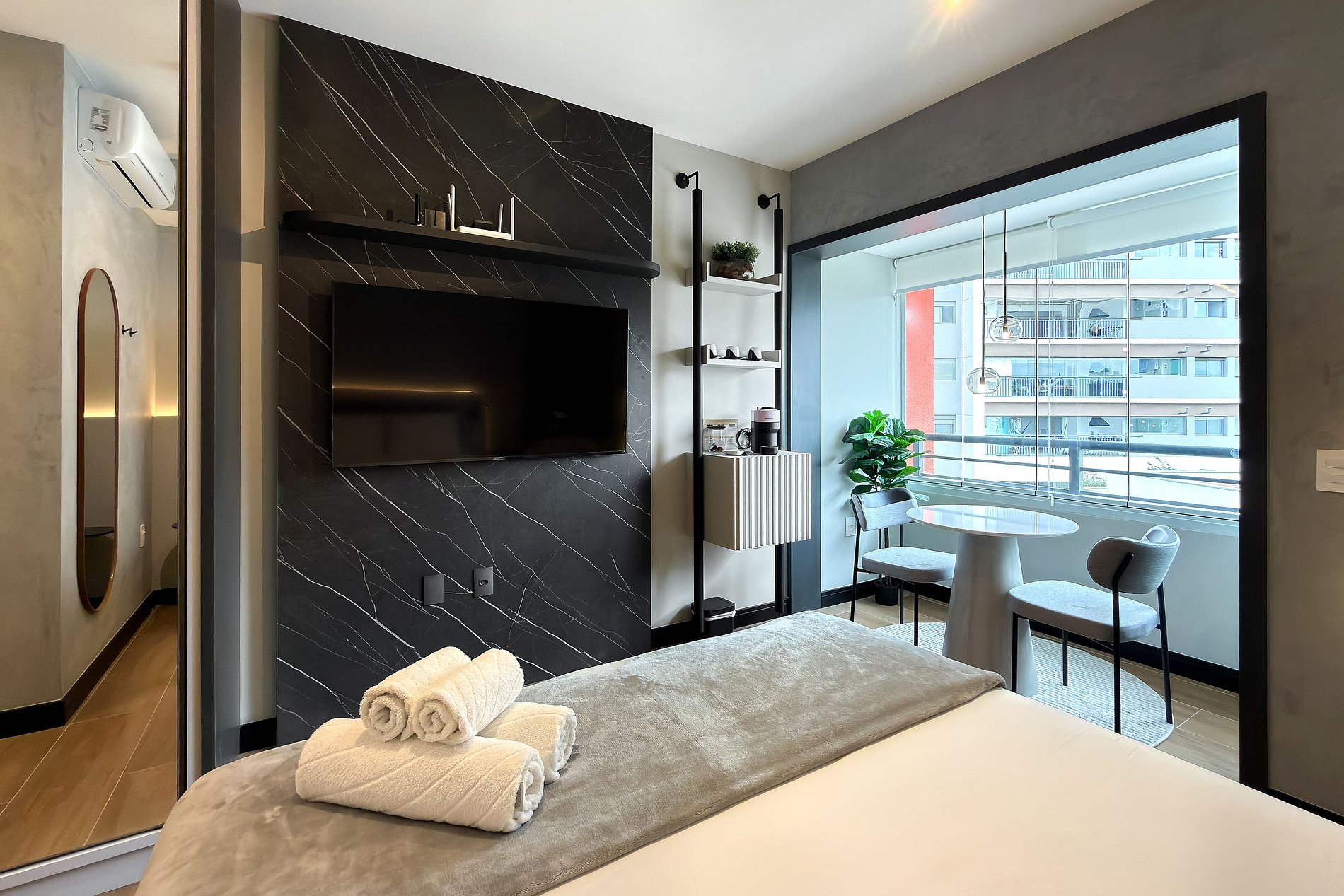 Este estúdio moderno e funcional oferece tudo o que você precisa para uma estadia confortável. O ambiente conta com uma cama de casal aconchegante, decoração contemporânea e uma cozinha compacta equipada para refeições práticas. Além da mesa de jantar que também funciona como área de trabalho, o espaço inclui: