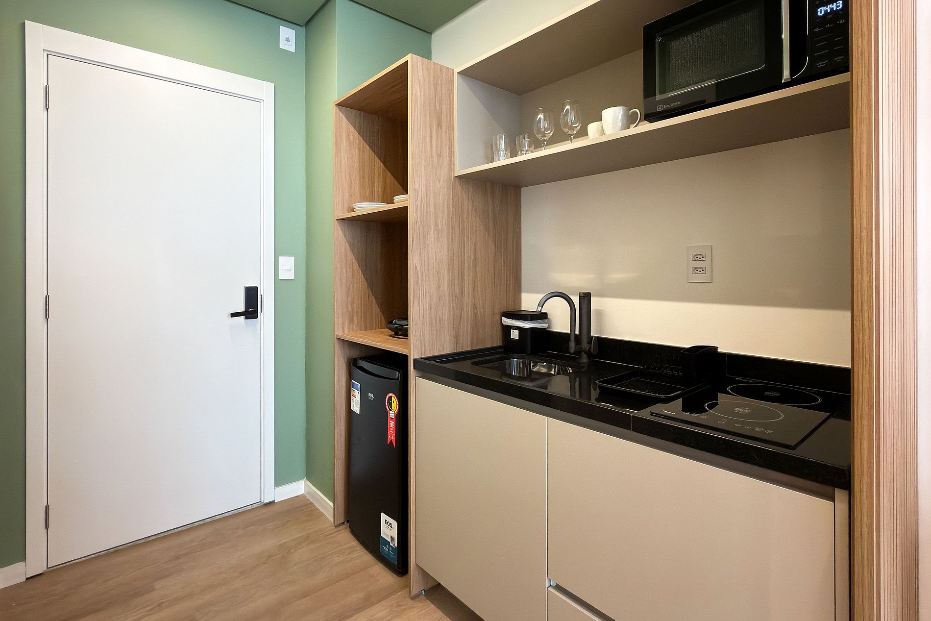O apartamento possui 1 cama de casal, 1 cozinha completa com geladeira, freezer, micro-ondas, fogão de (2 bocas), 1 bancada para home office, guarda-roupa, secador de cabelo, ferro de passar, TV e 1 banheiro com ótimo chuveiro (água quente e fria). Será fornecido um jogo de enxoval (lençóis, travesseiros, fronhas e toalhas de banho e rosto) por hóspede. Não há trocas durante a permanência. O lixo deve ser colocado nas lixeiras que se encontram nas escadas e sobre a torneira da pia que tem filtro com água potável. Coworking nas comodidades do predio, sendo proibido fumar.