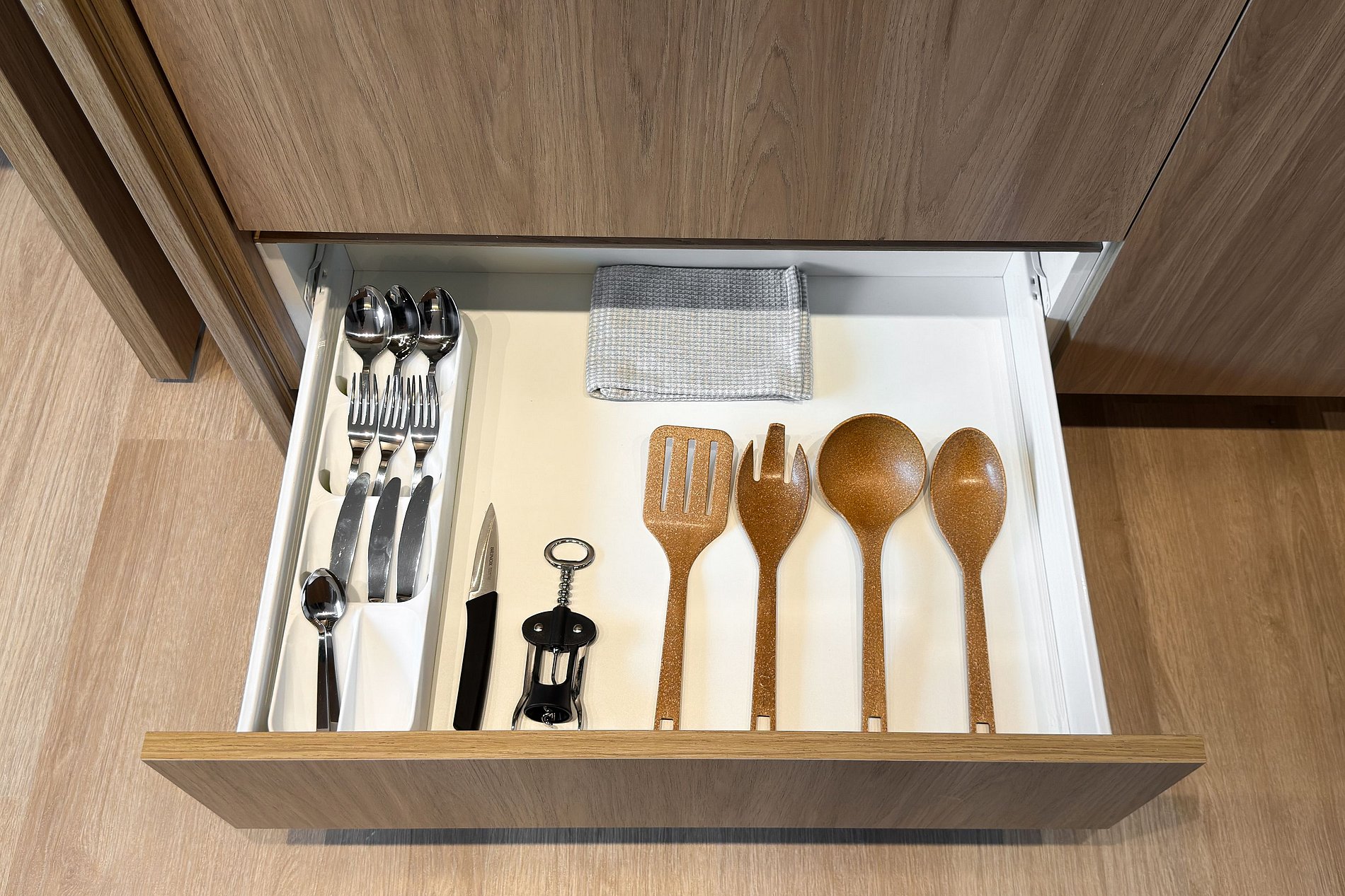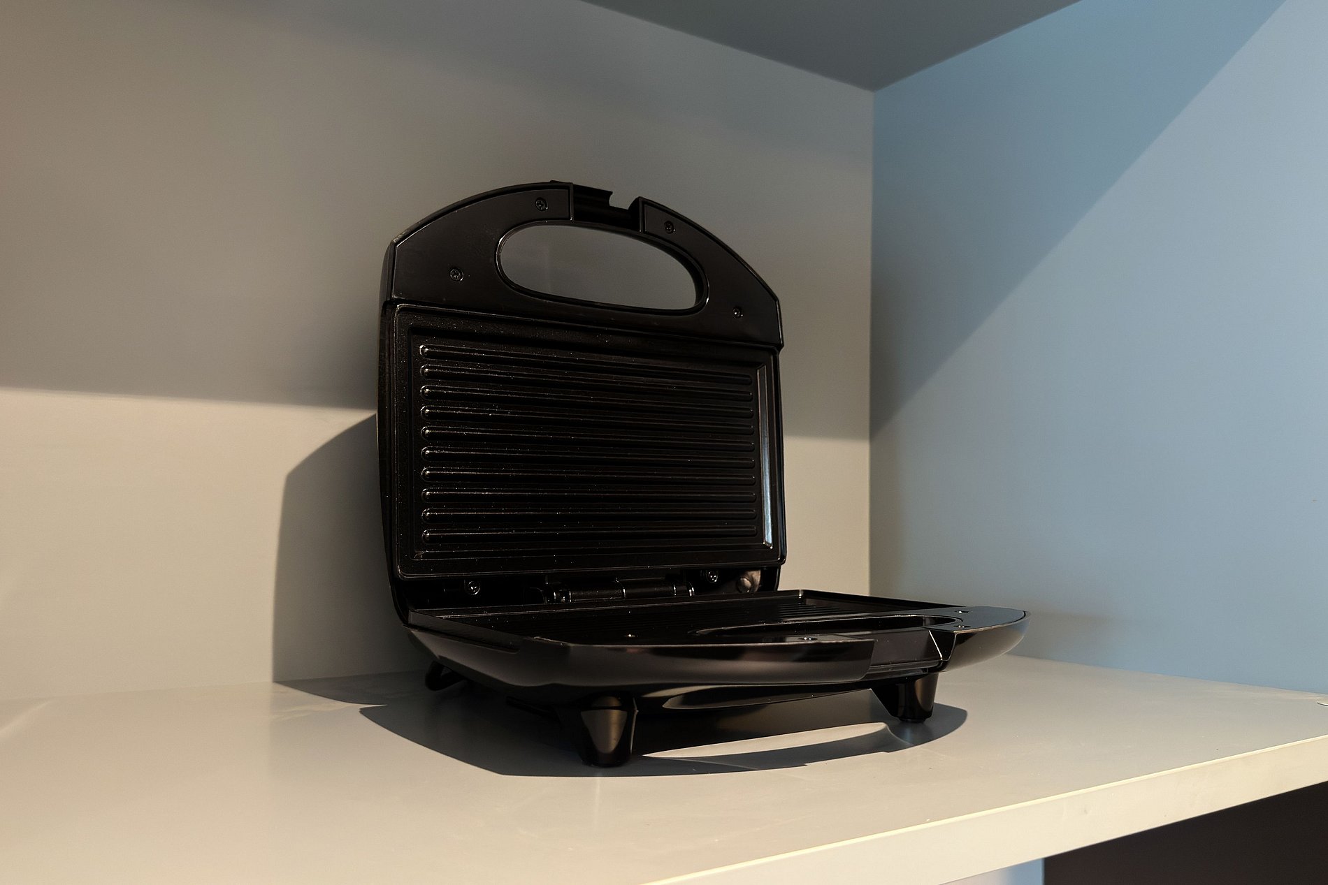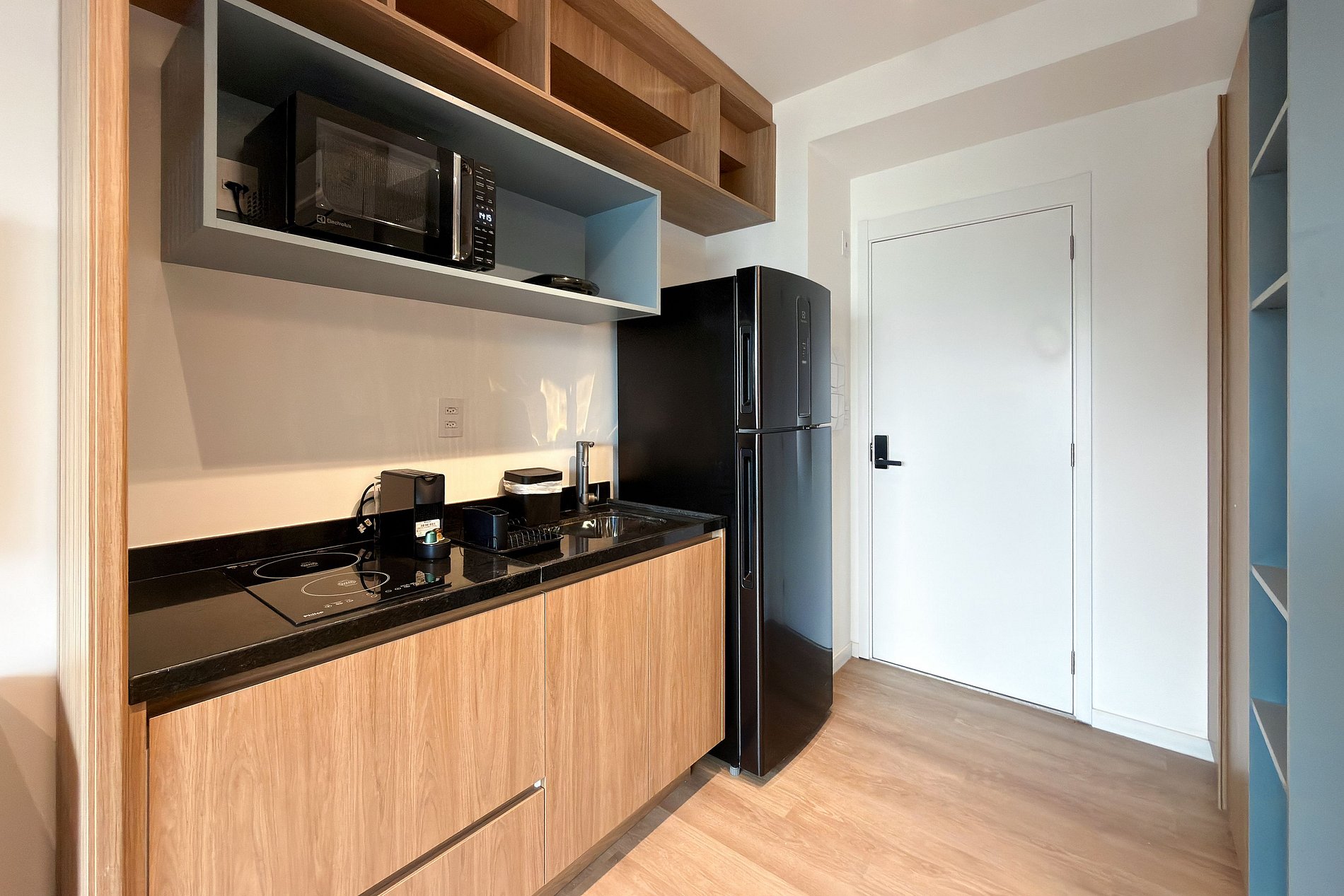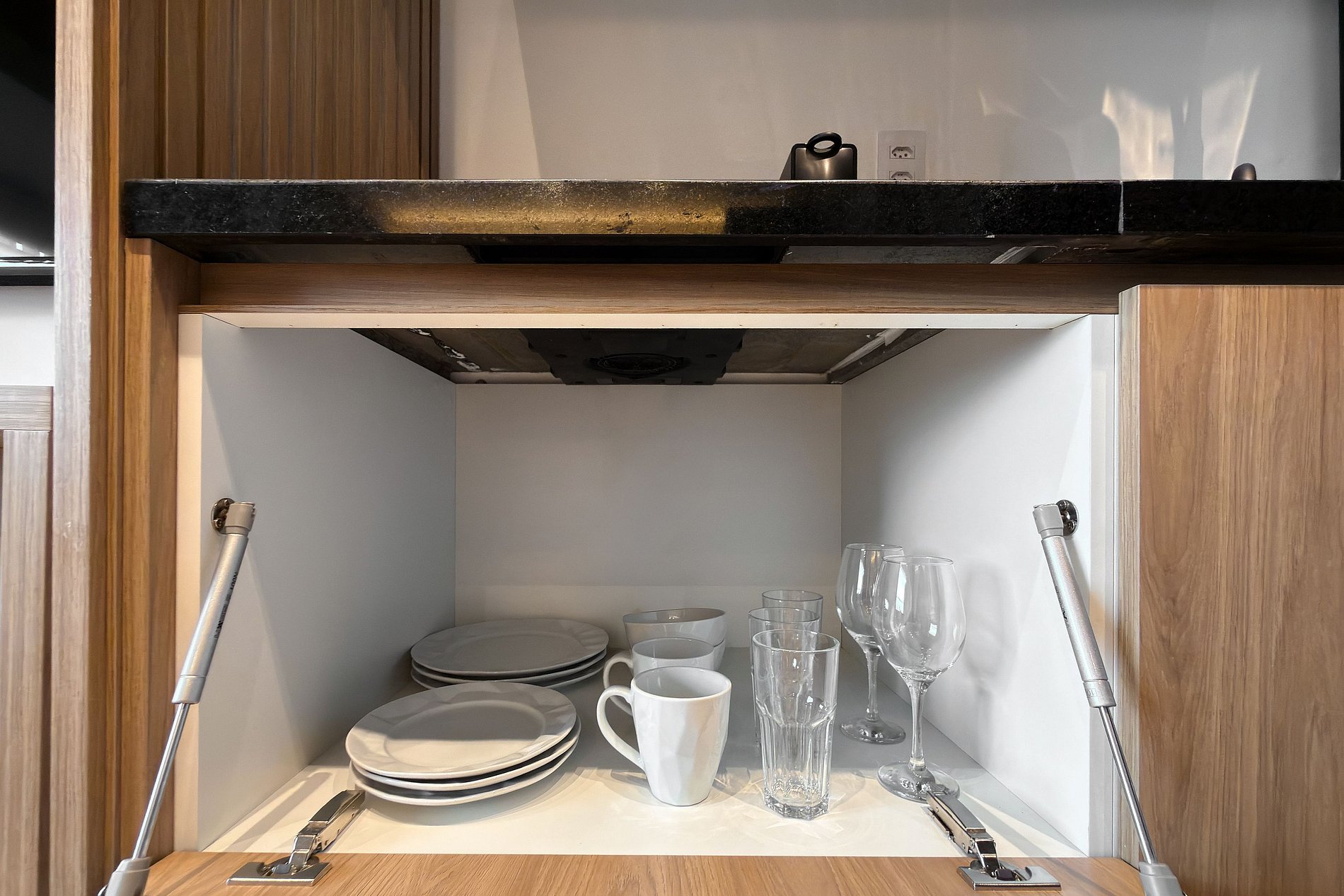1 Mini Cozinha com frigobar, micro-ondas, cooktop e utensílios básicos.