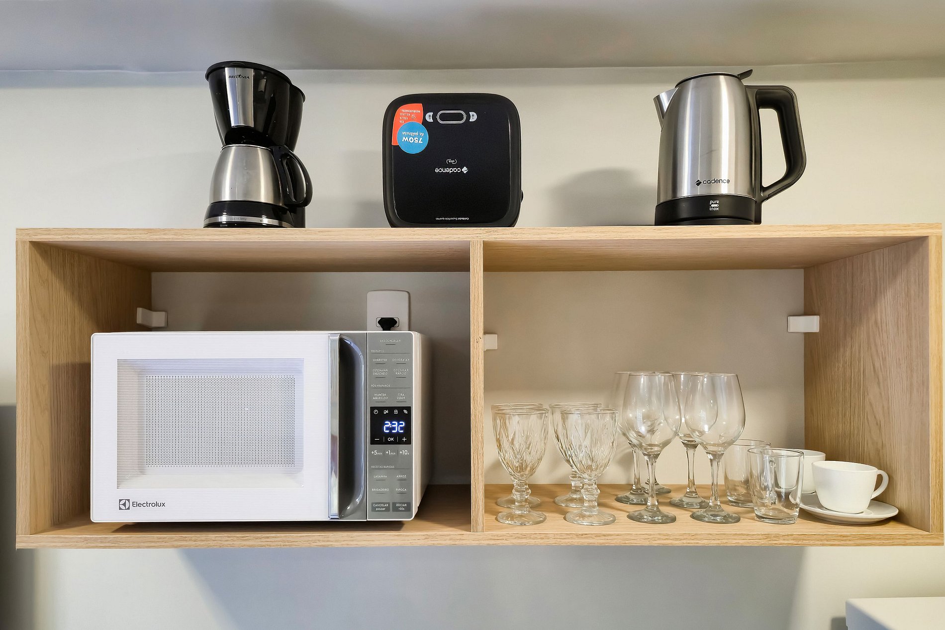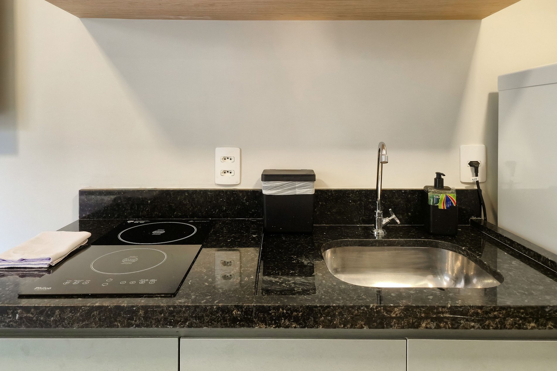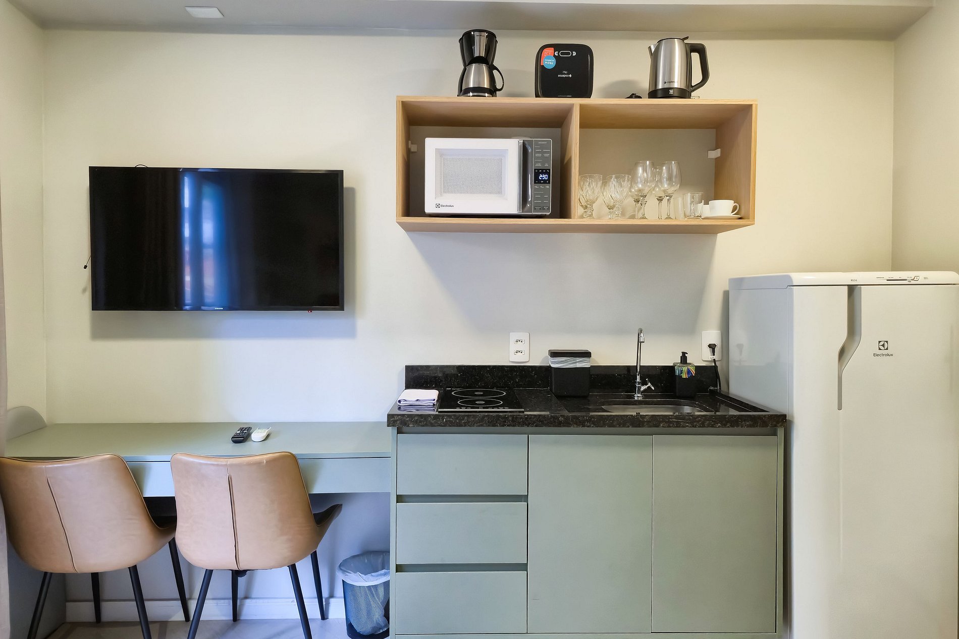 O espaço conta com cama de casal confortável, enxoval completo e decoração contemporânea, criando um clima acolhedor para descanso ou trabalho. A cozinha compacta é equipada com cooktop, micro-ondas, geladeira, cafeteira, chaleira elétrica, utensílios e taças, ideal para o dia a dia.