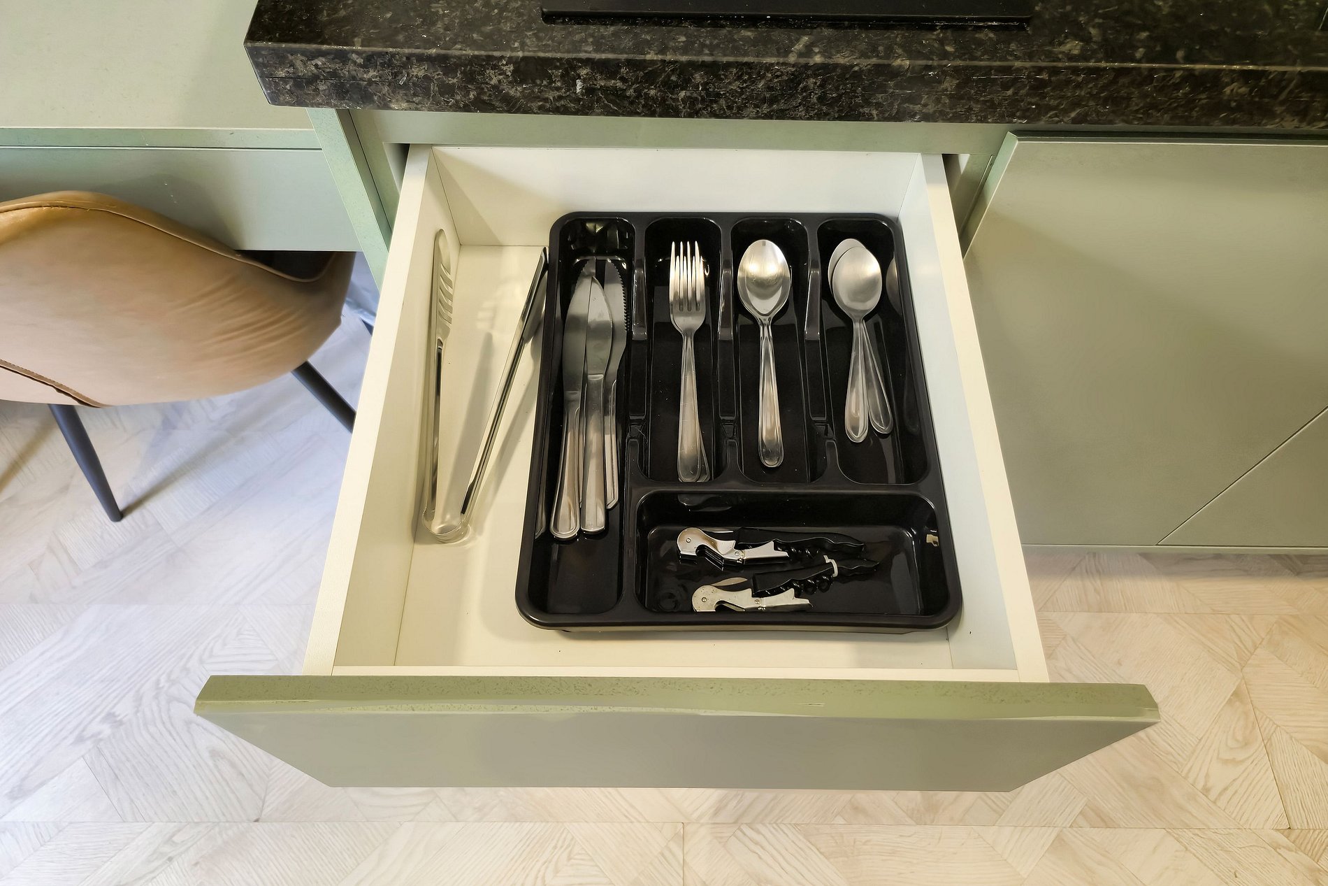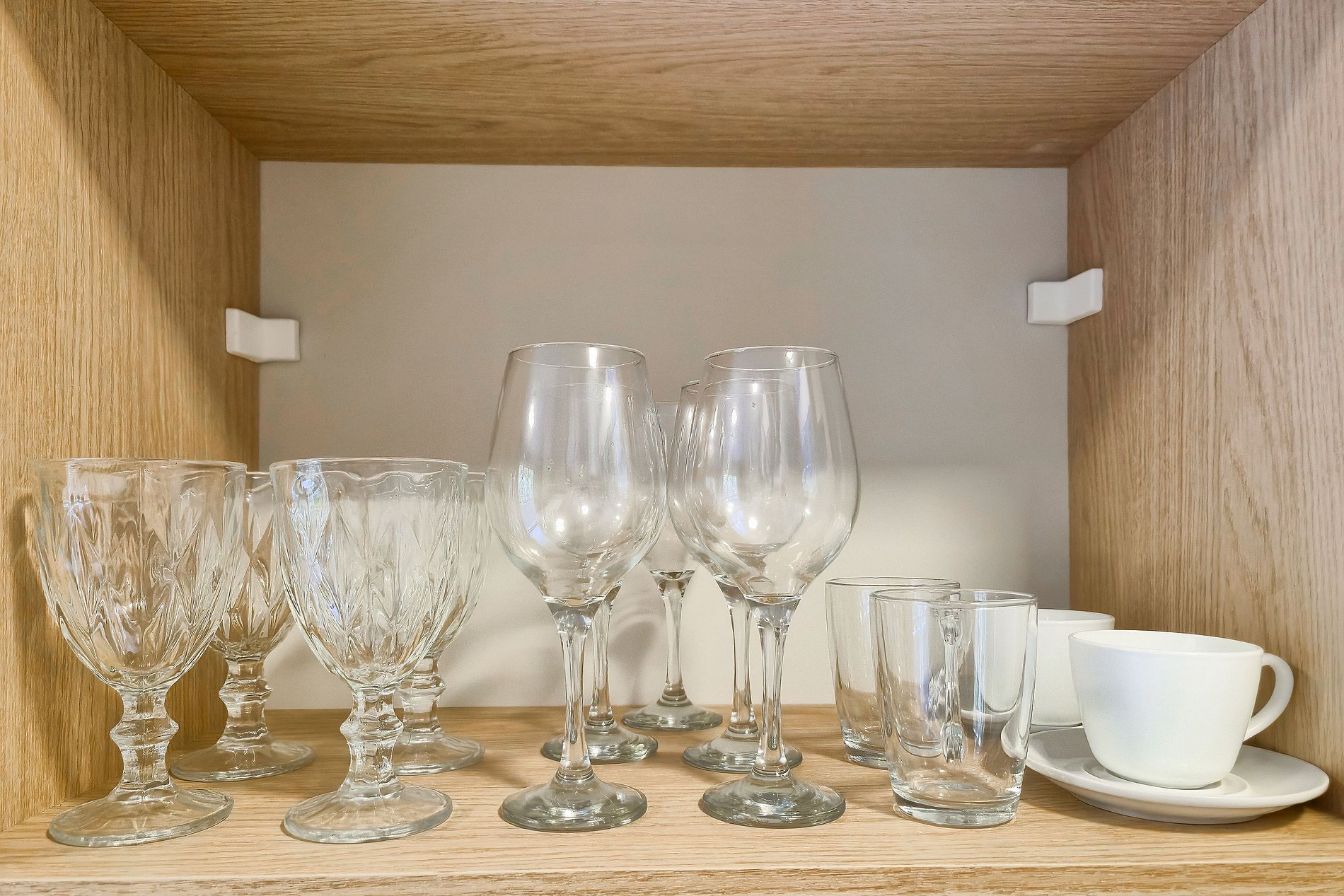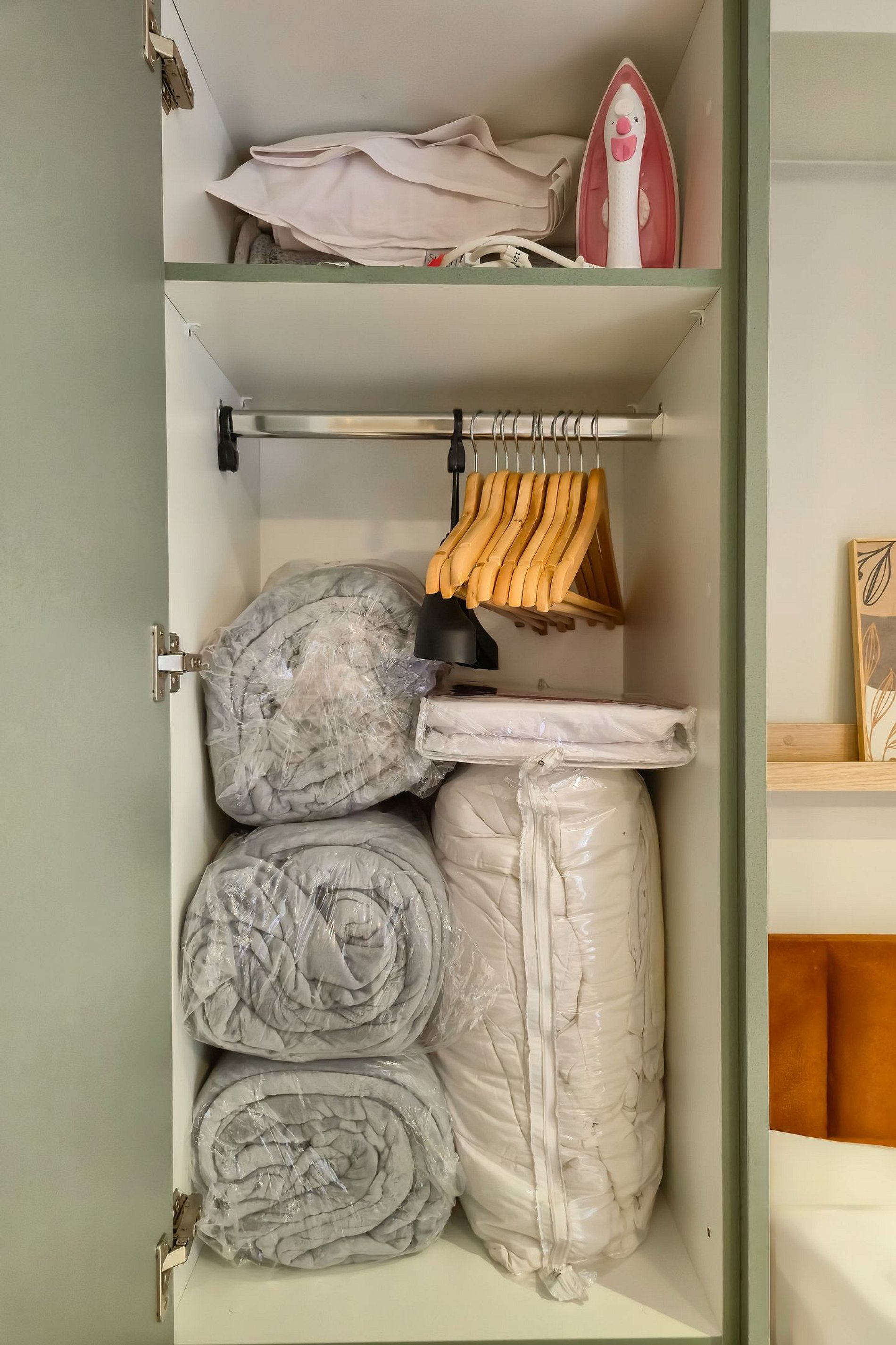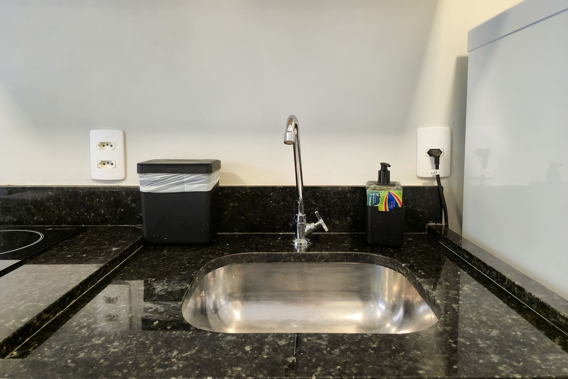 O espaço conta com cama de casal confortável, enxoval completo e decoração contemporânea, criando um clima acolhedor para descanso ou trabalho. A cozinha compacta é equipada com cooktop, micro-ondas, geladeira, cafeteira, chaleira elétrica, utensílios e taças, ideal para o dia a dia.