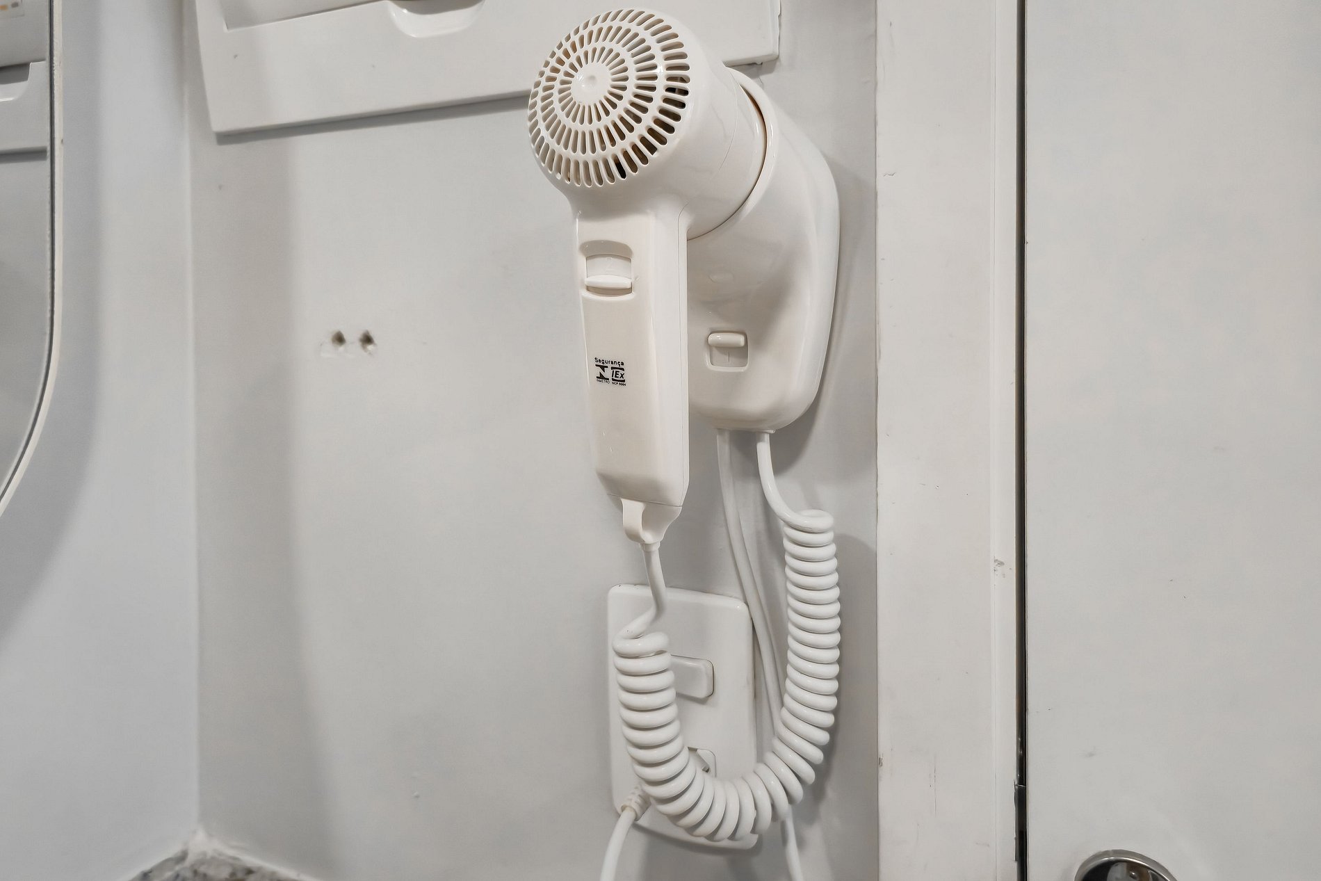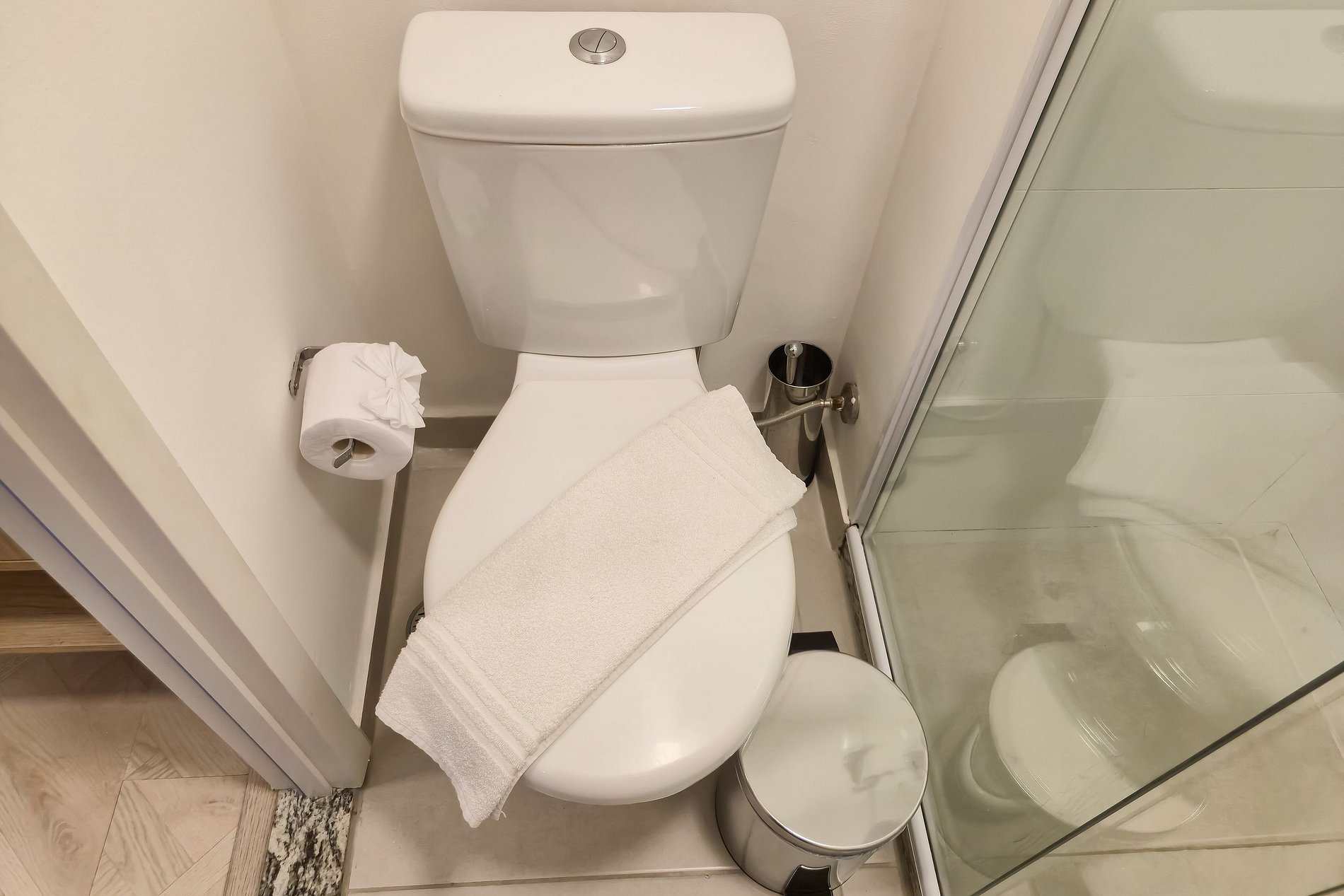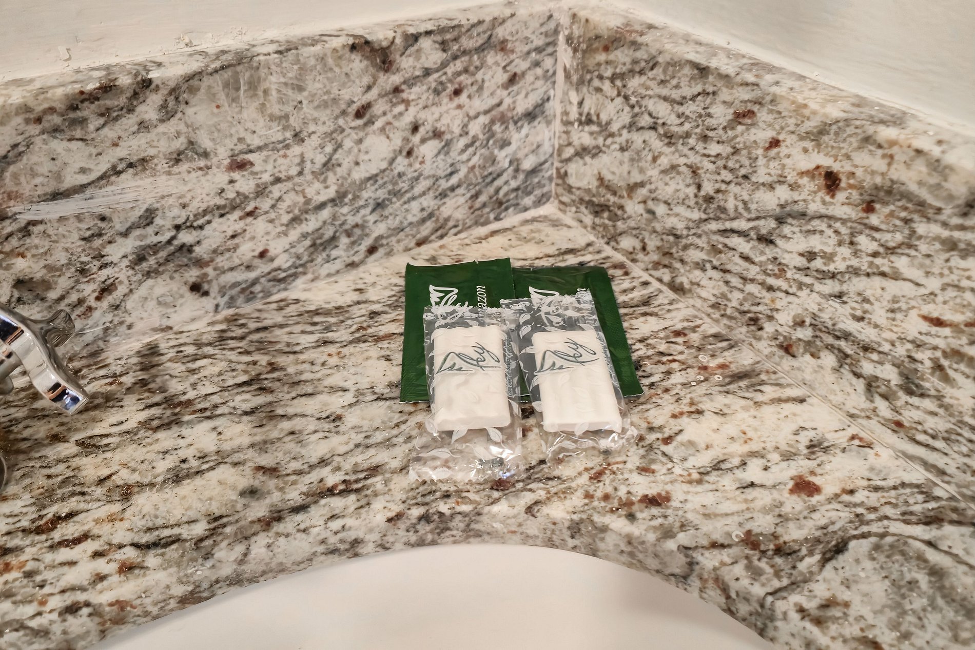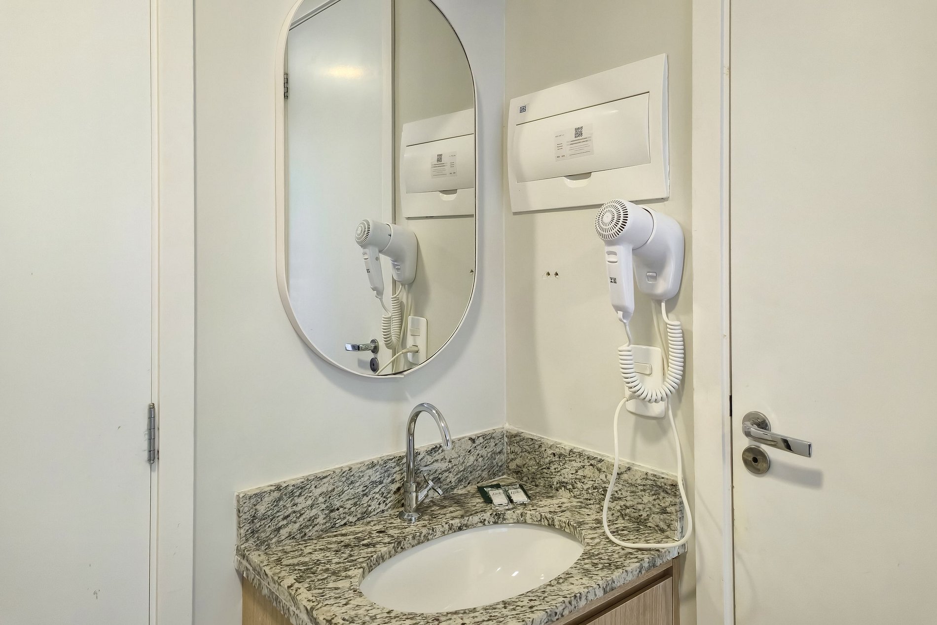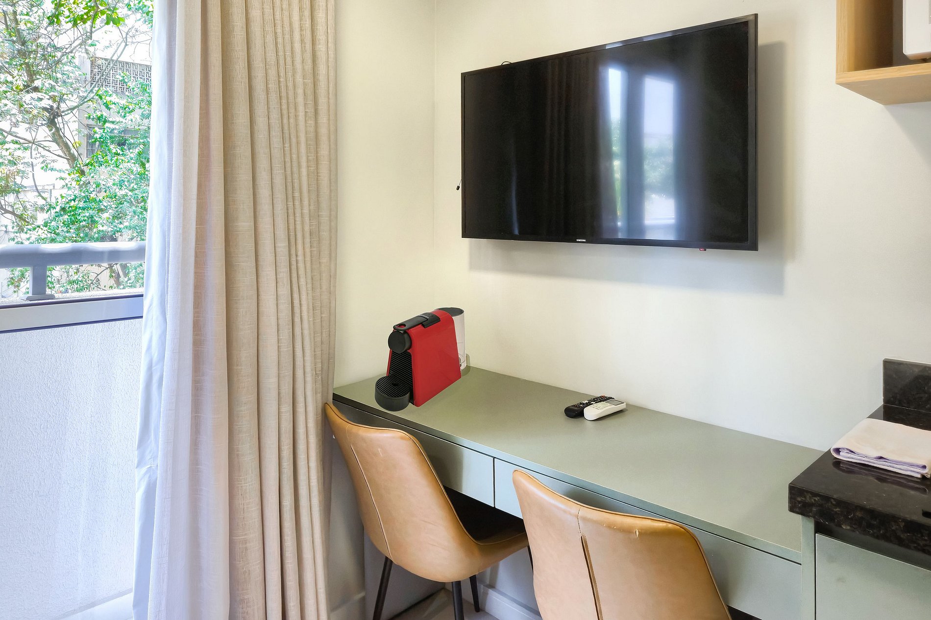 O estúdio oferece ainda TV de tela plana, Wi-Fi, mesa de trabalho/refeições, armário com cabides, ferro de passar e itens essenciais. O banheiro é moderno, com bancada em granito, secador de cabelo e amenities, mantendo padrão hoteleiro.