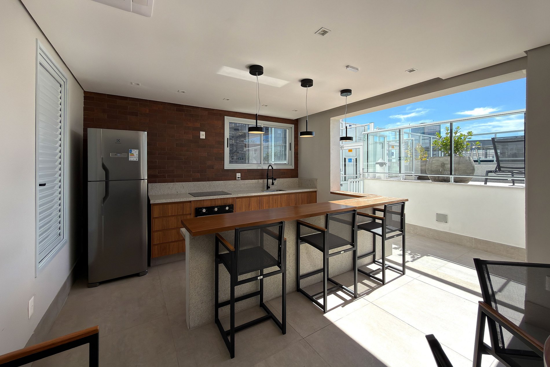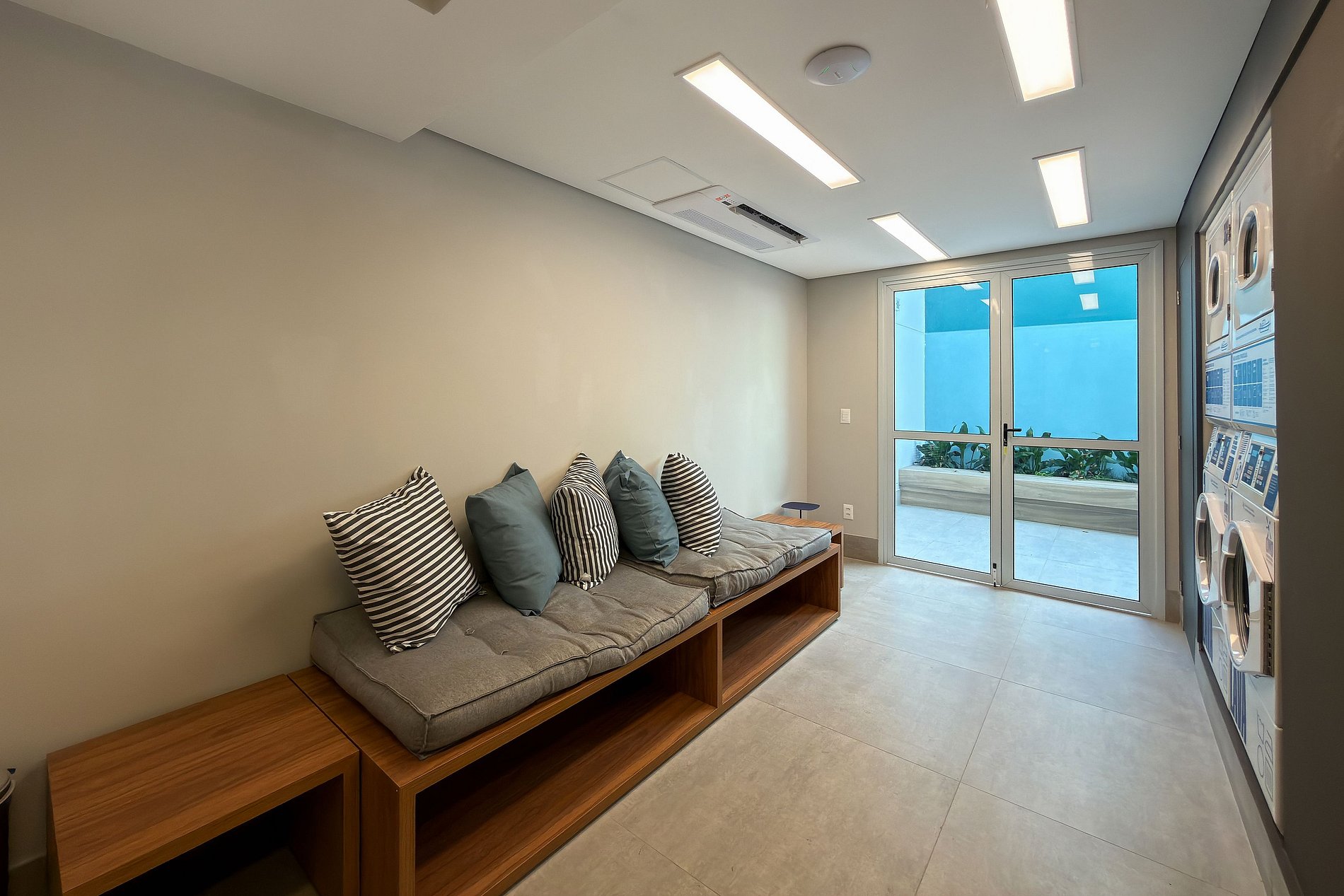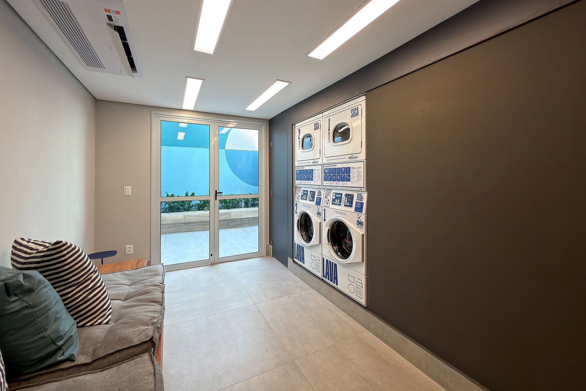 O condomínio possui área de lazer completa, com piscina, área gourmet, churrasqueira, salão de festas, espaço pet e copa, proporcionando conforto, lazer e conveniência durante a estadia. Também conta com lavanderia compartilhada com máquinas lava e seca.