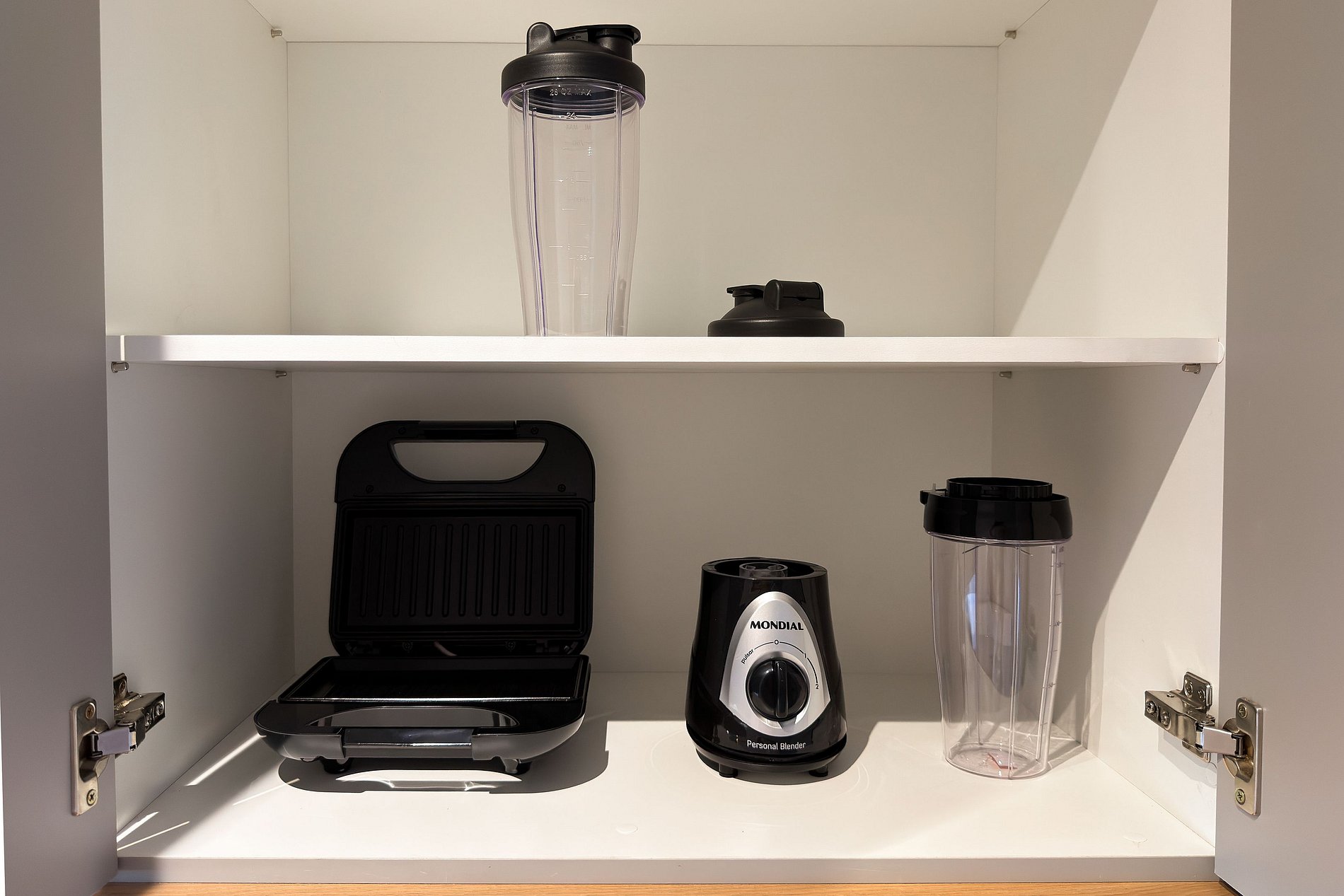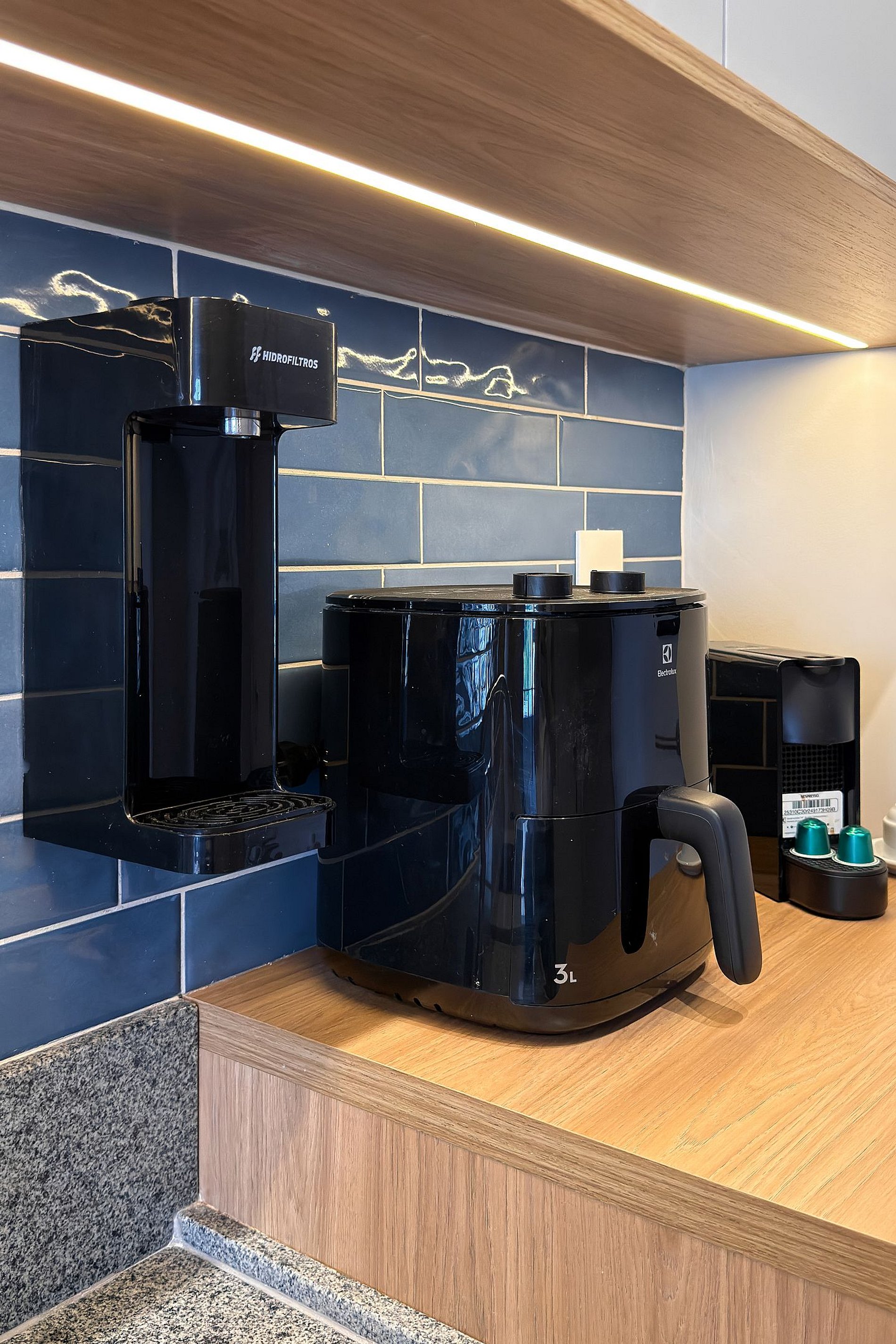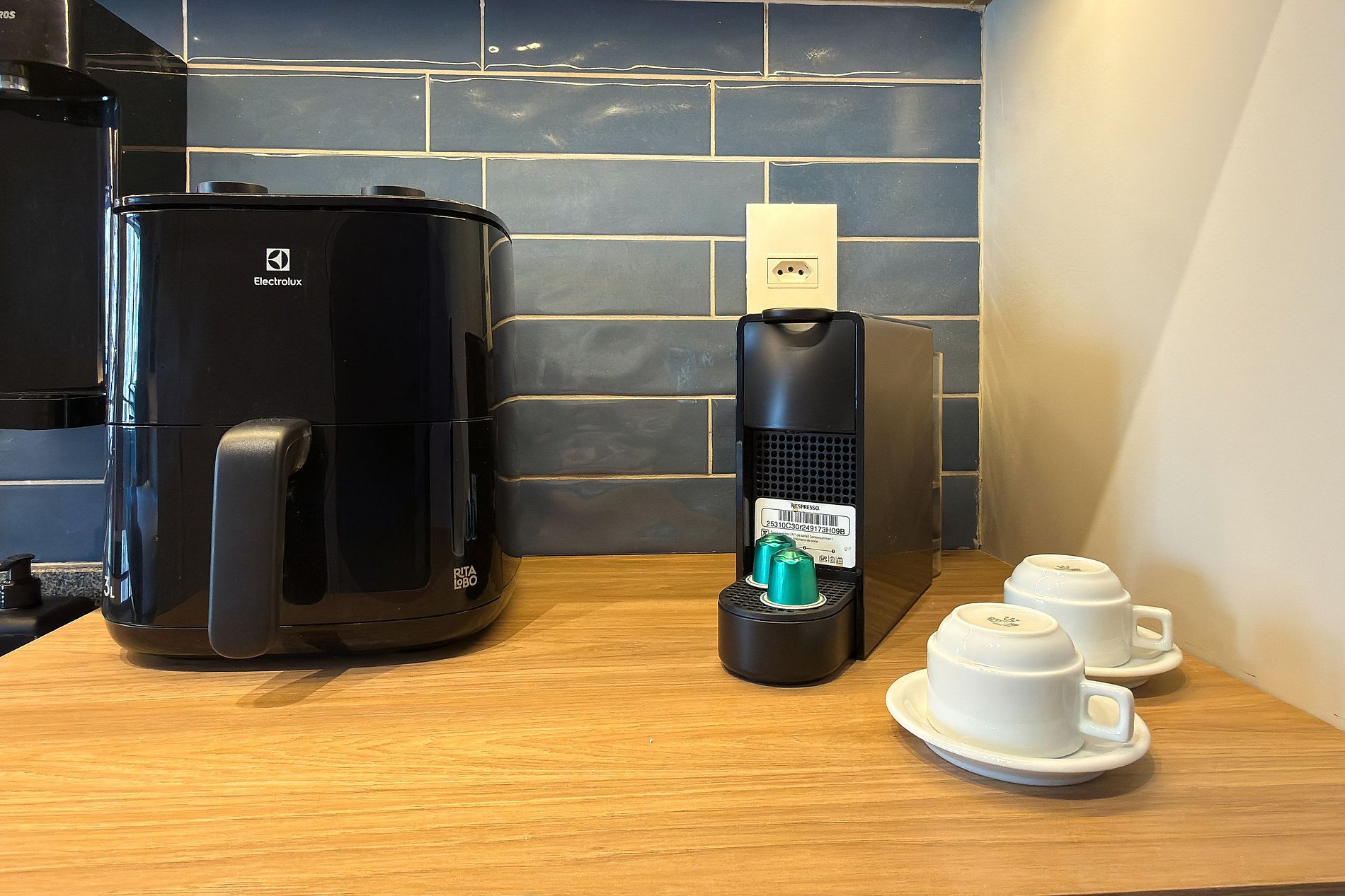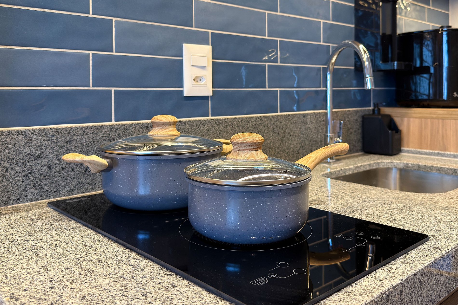 Cozinha: cooktop, micro-ondas, airfryer, cafeteira, frigobar e utensílios completos (panelas, pratos, talheres e taças)