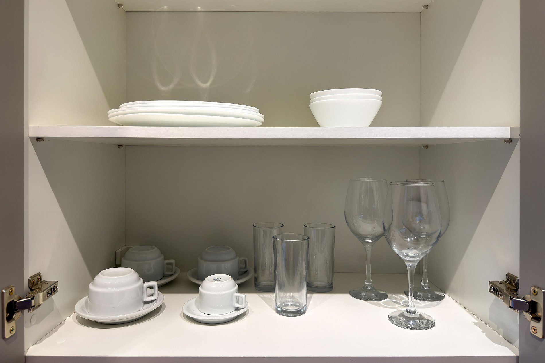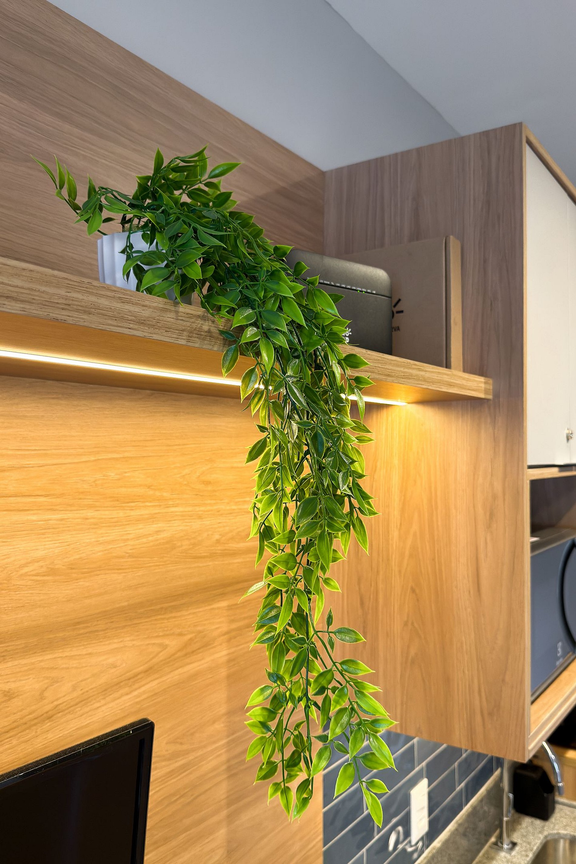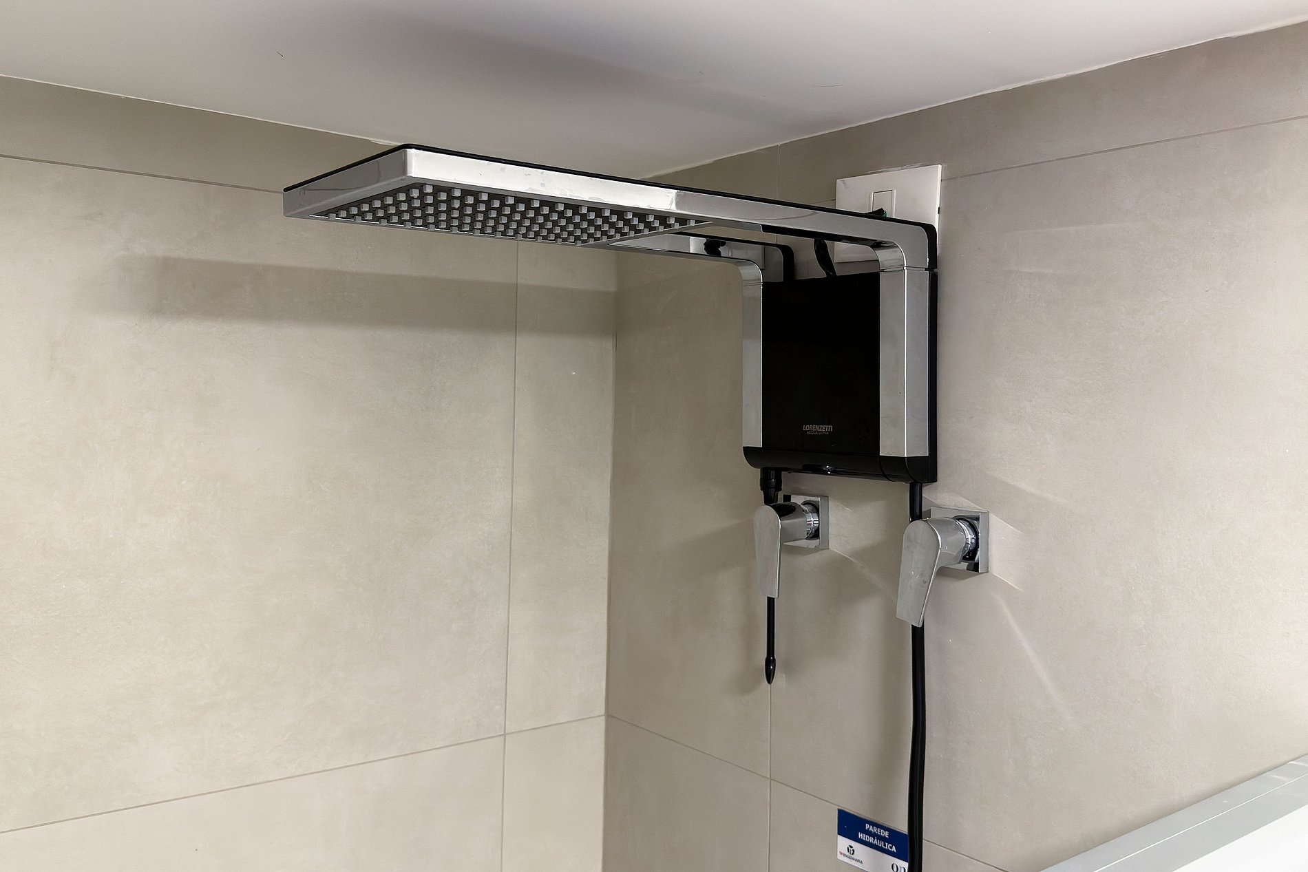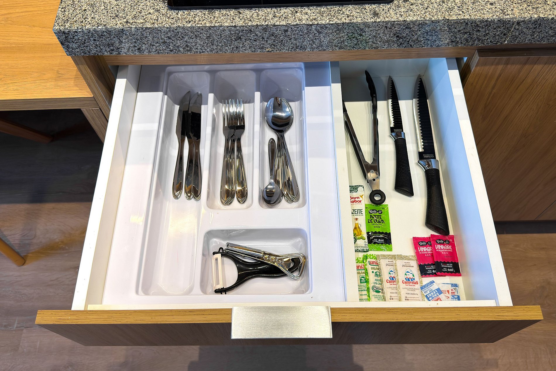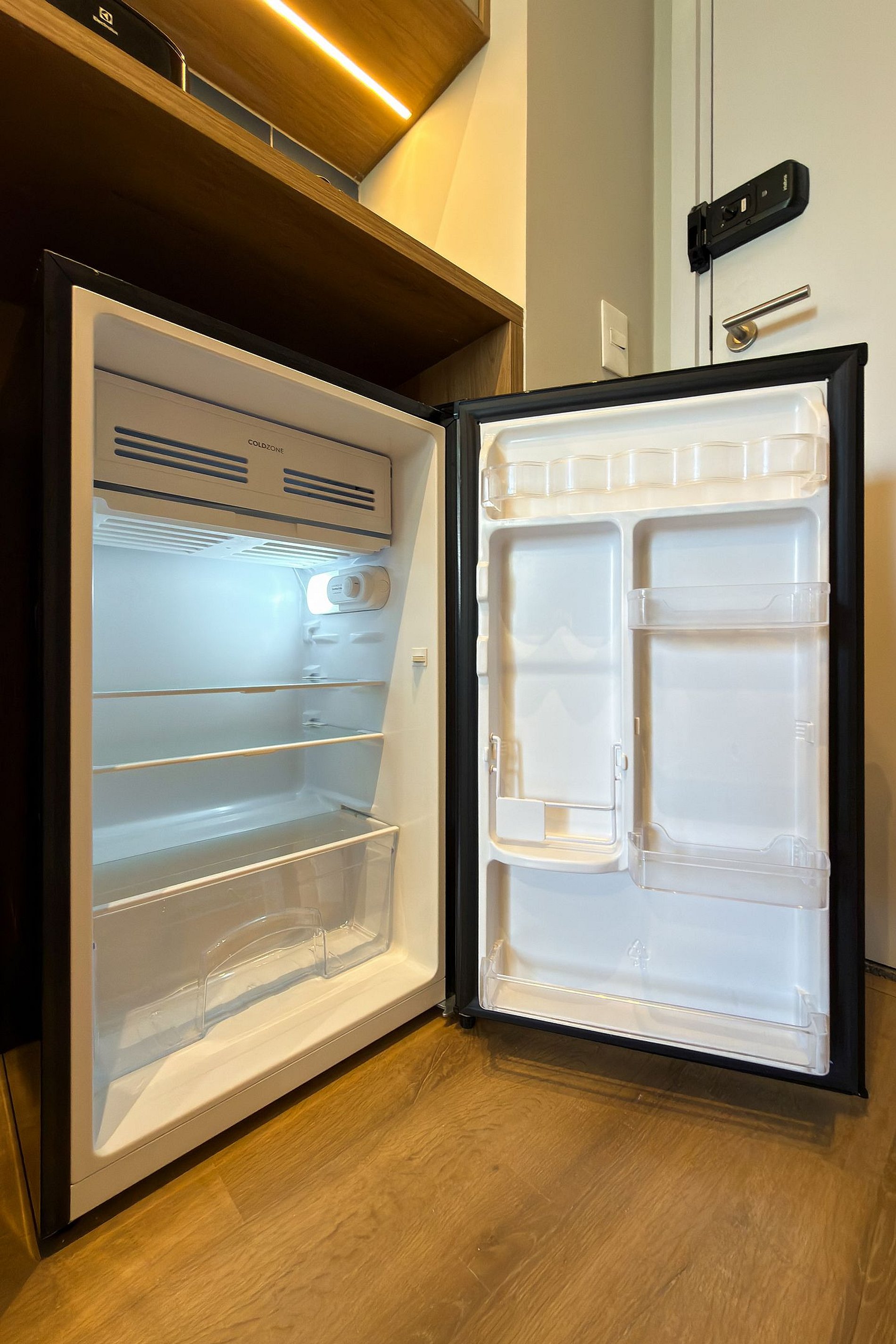 Cozinha: cooktop, micro-ondas, airfryer, cafeteira, frigobar e utensílios completos (panelas, pratos, talheres e taças)