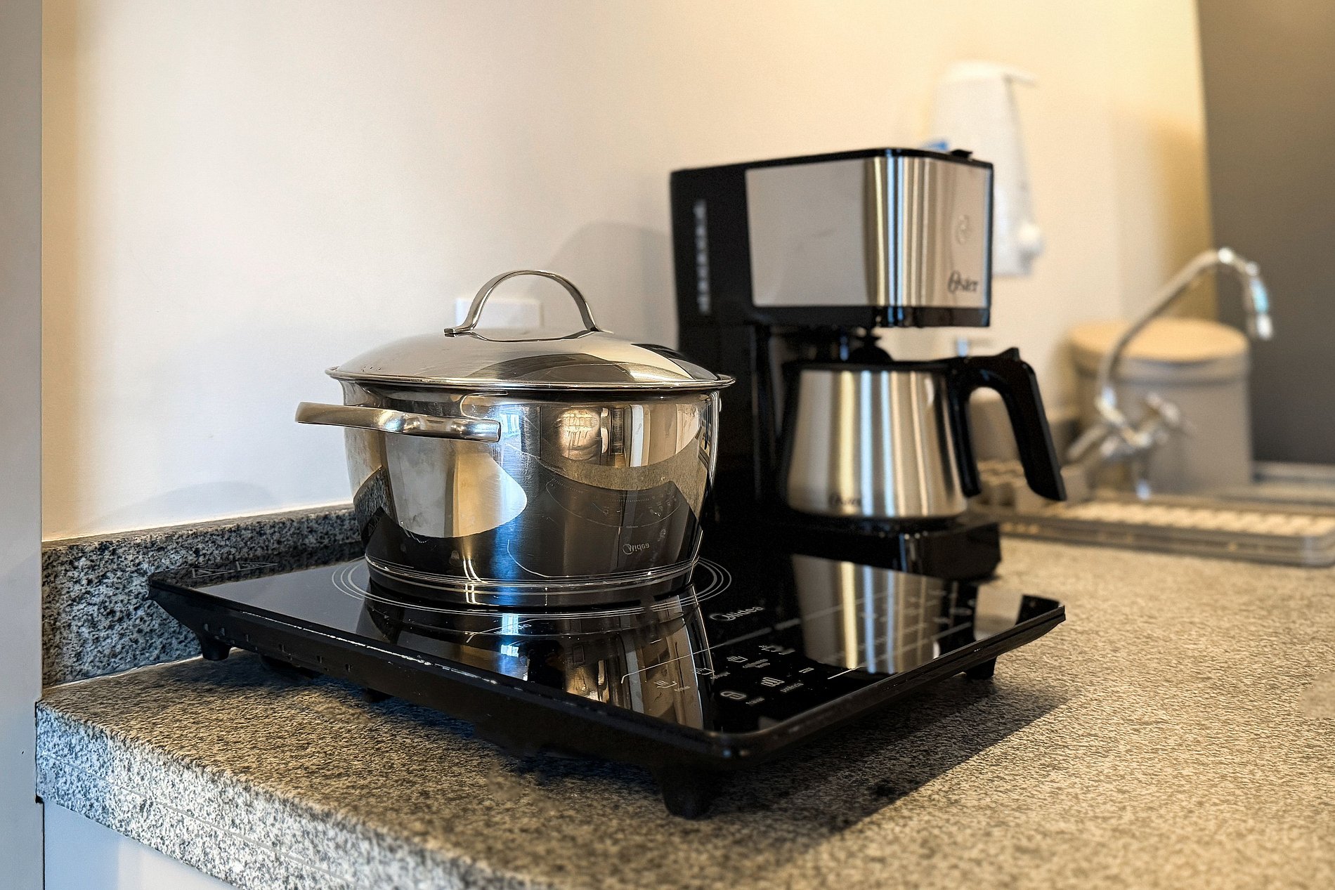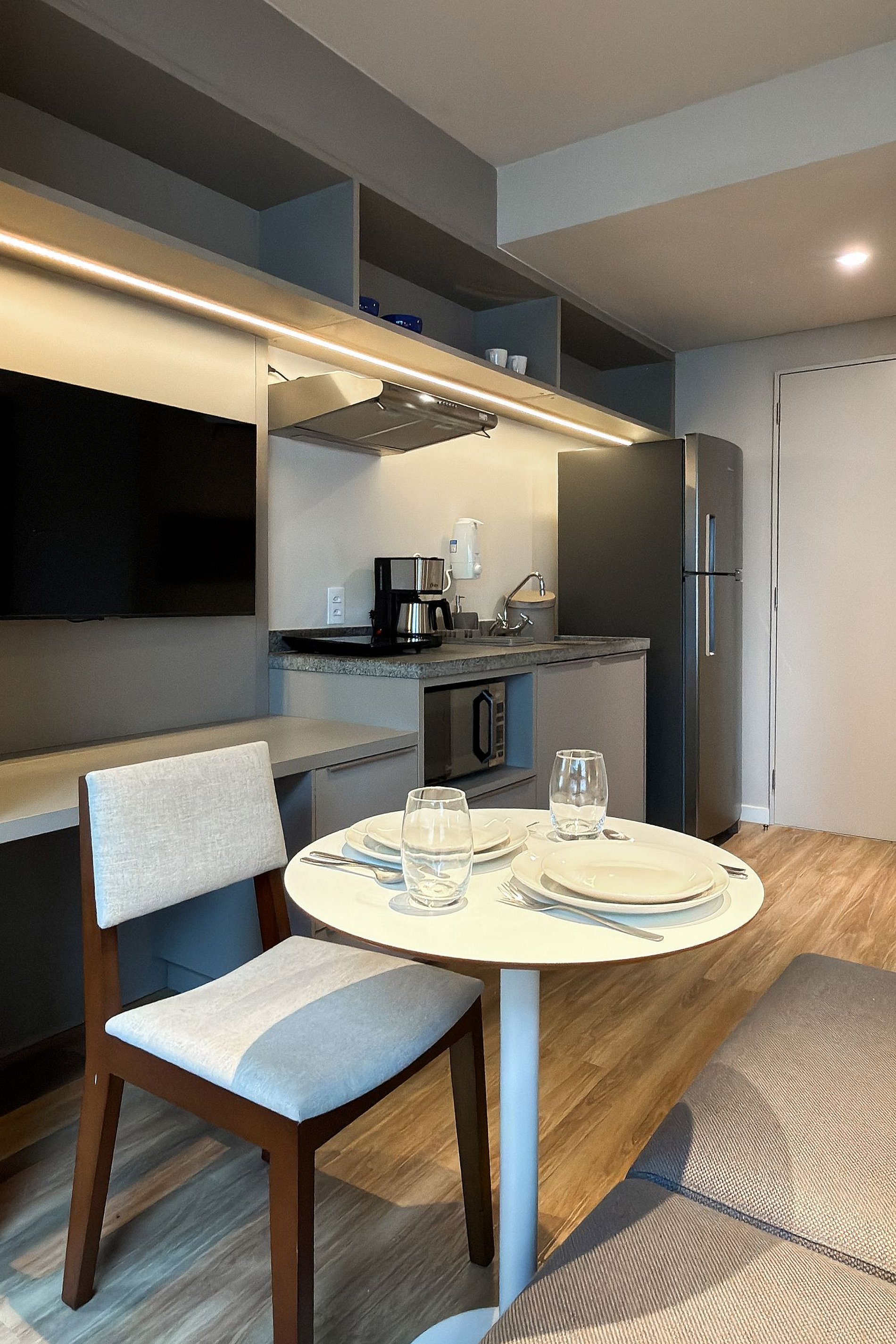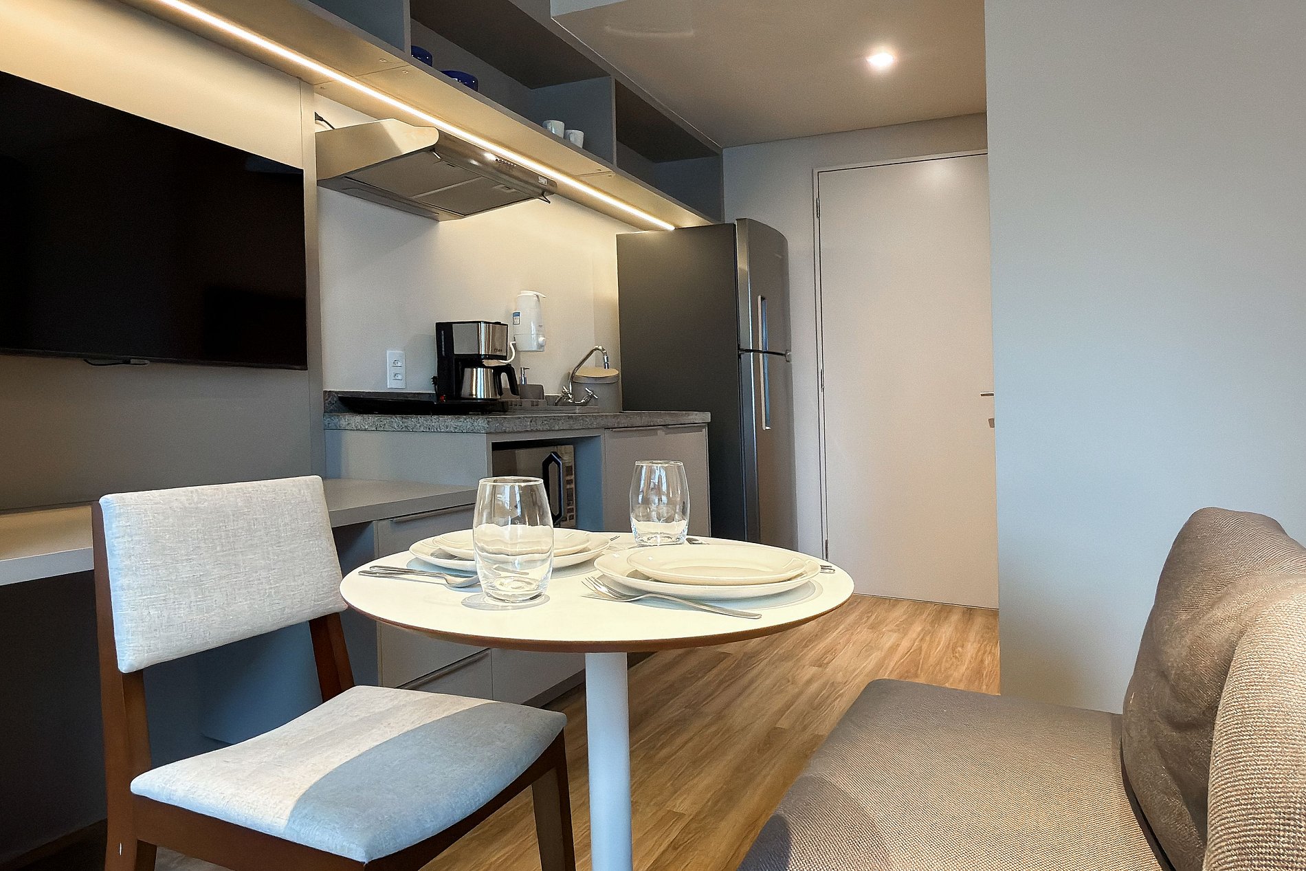 Cozinha completa: cooktop, micro-ondas, geladeira, cafeteira, panelas, utensílios, talheres e filtro de água