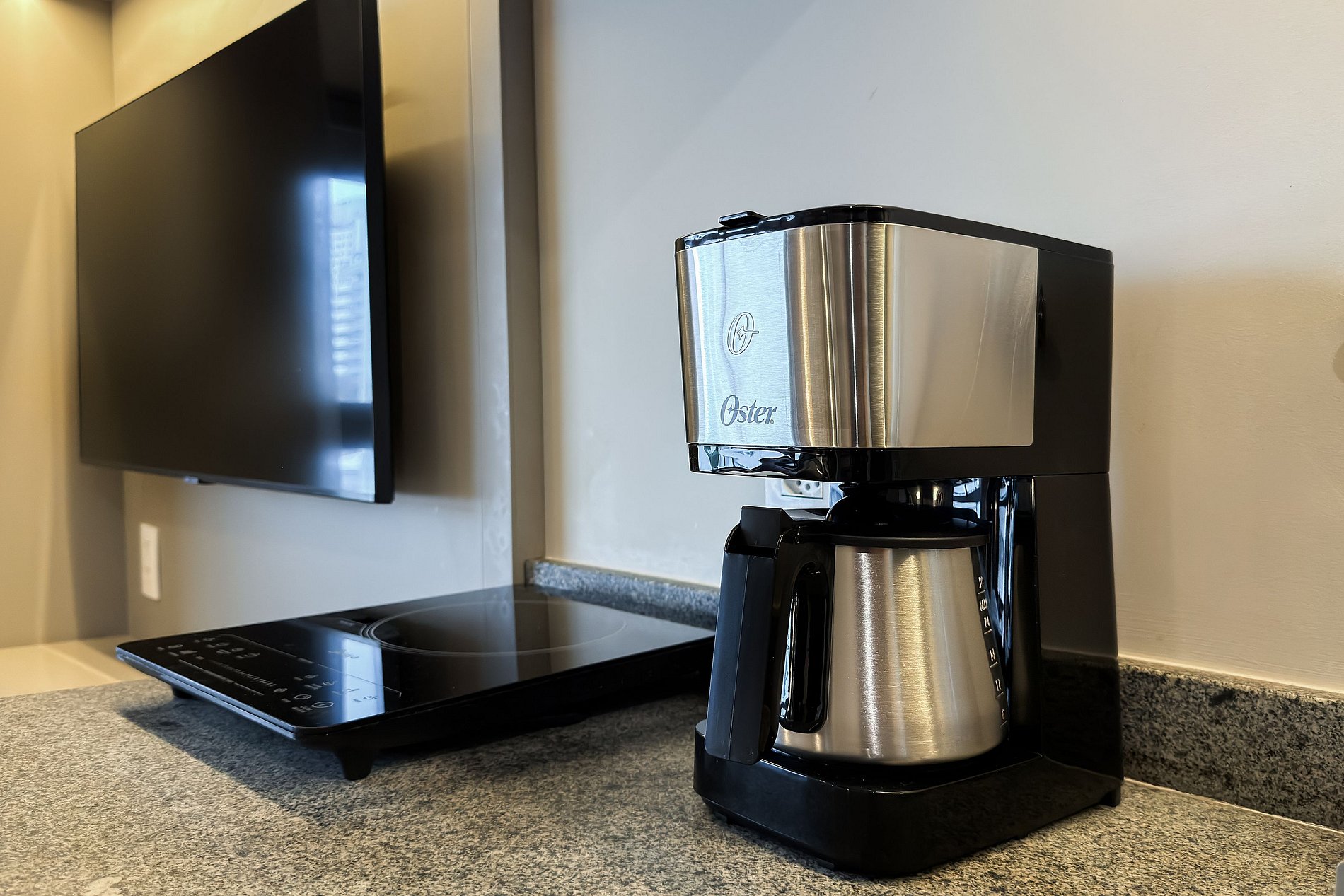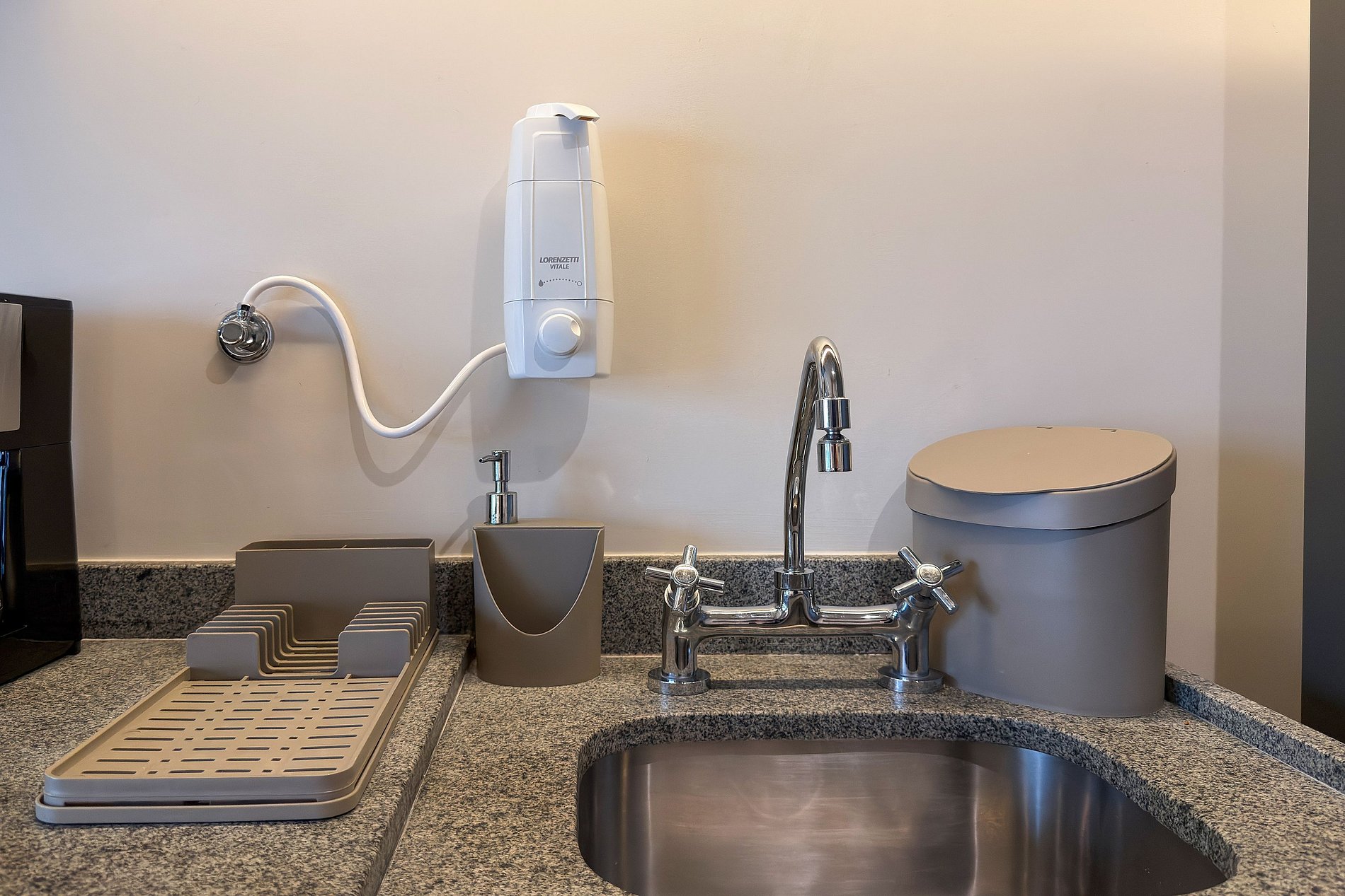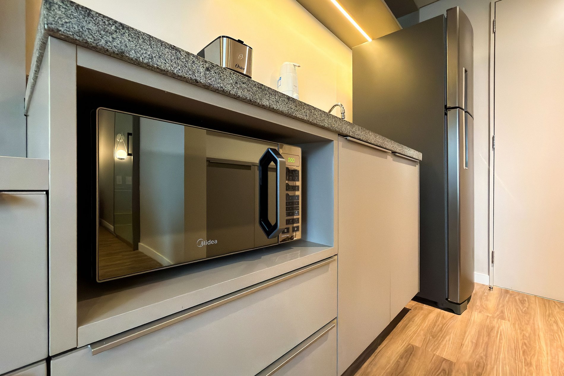 Cozinha completa: cooktop, micro-ondas, geladeira, cafeteira, panelas, utensílios, talheres e filtro de água
