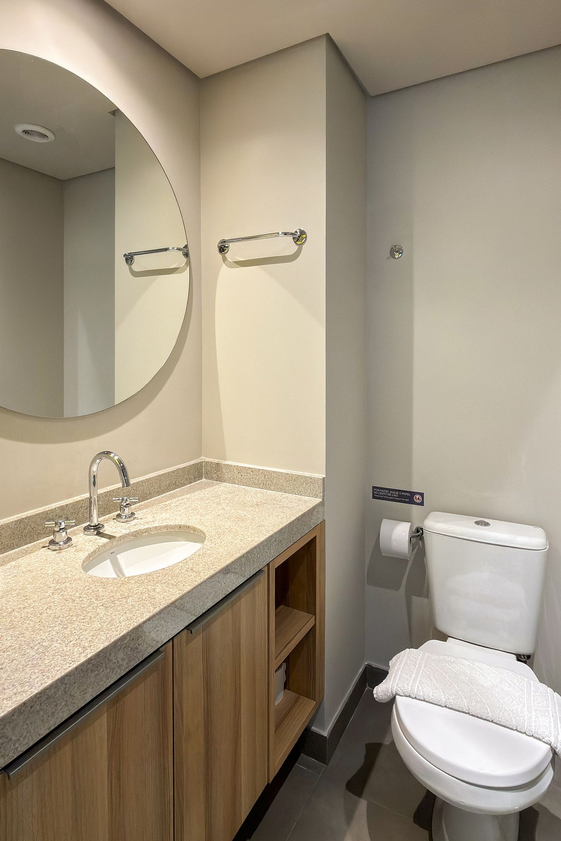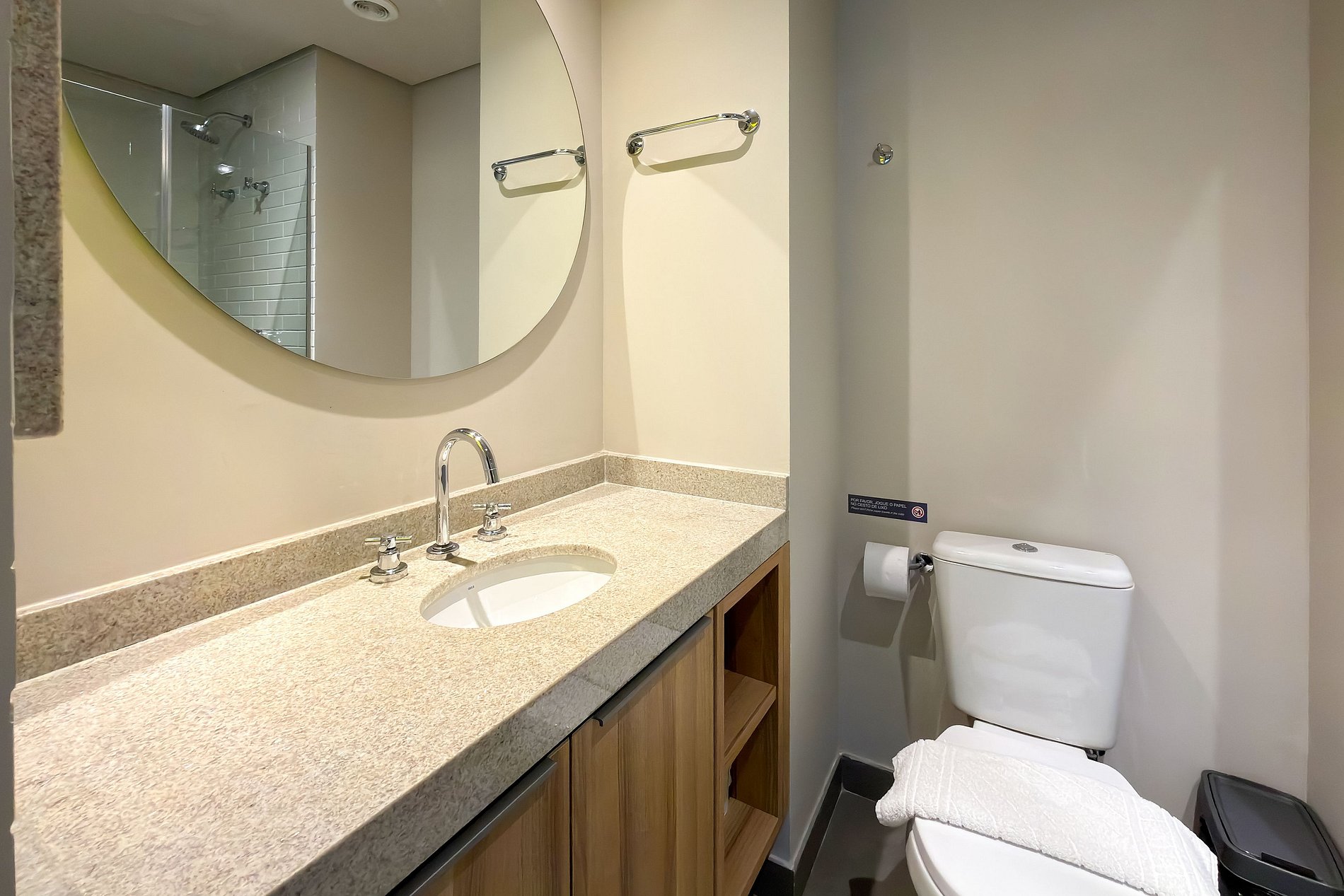 Banheiro com secador de cabelo, utensílios básicos e toalhas inclusas