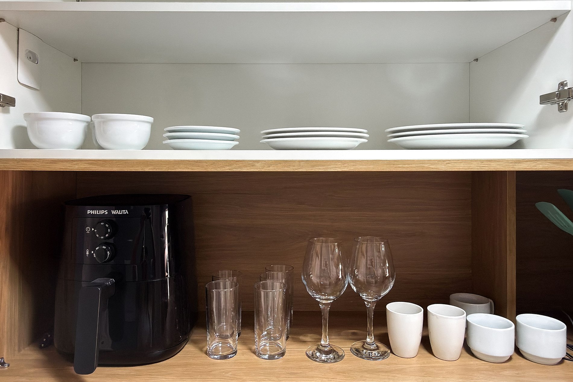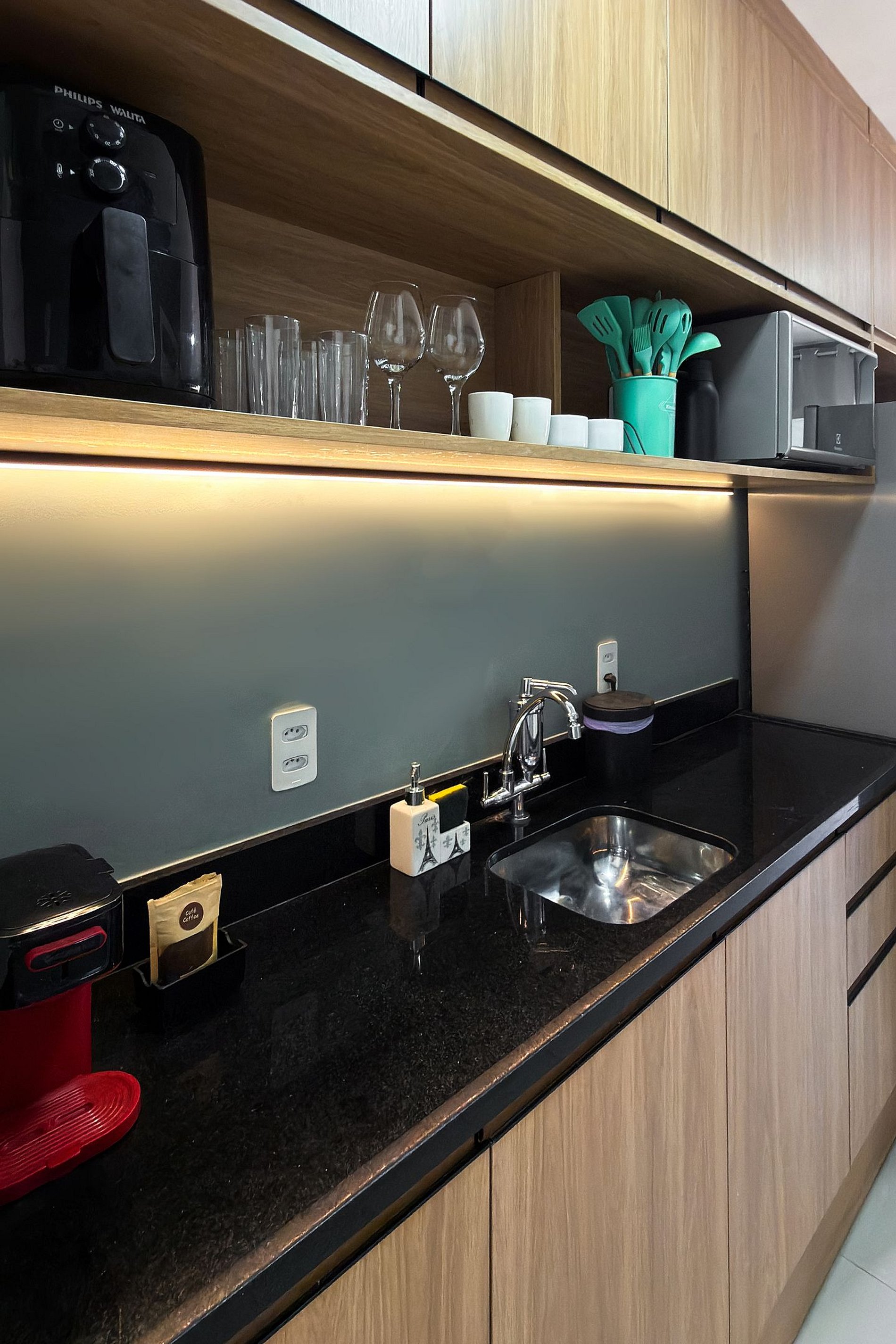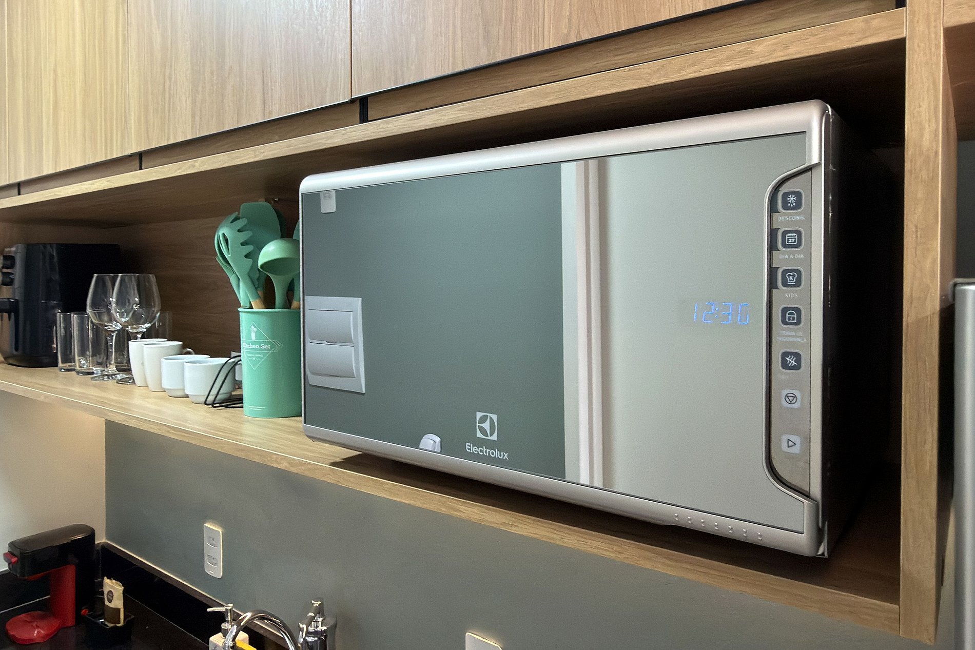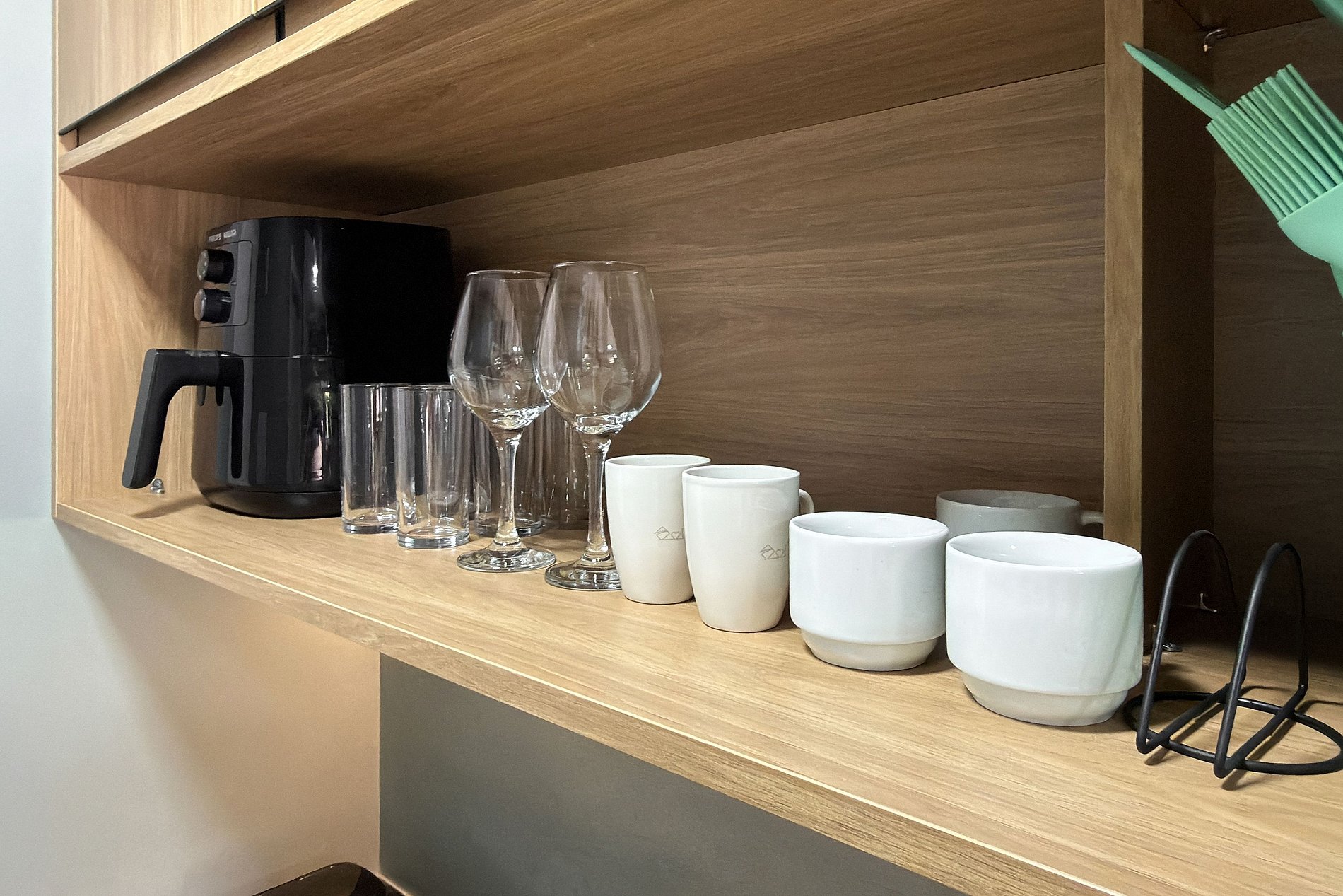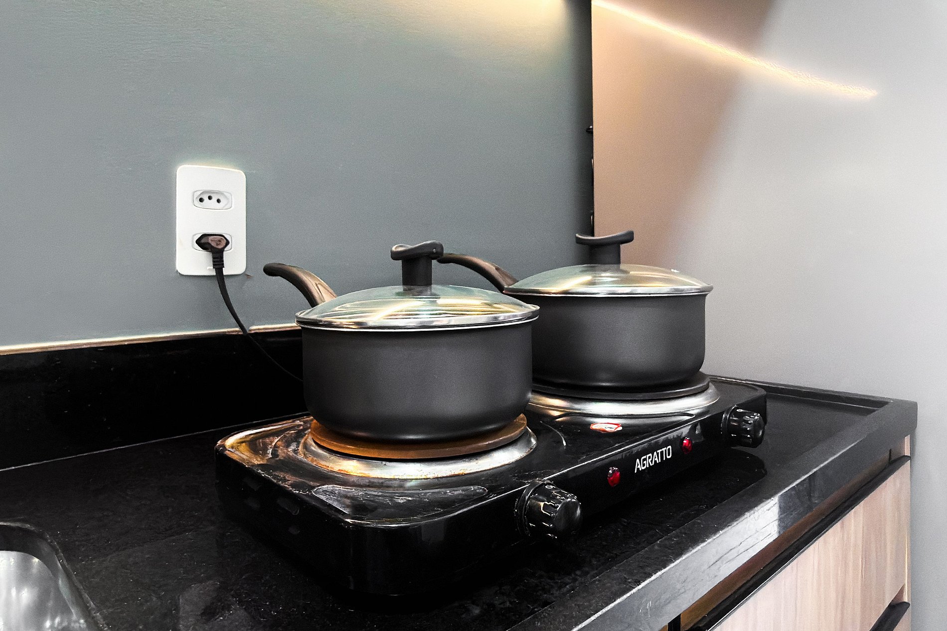 Cozinha equipada: cooktop, micro-ondas, cafeteira, geladeira e utensílios completos (panelas, talheres, taças e pratos)