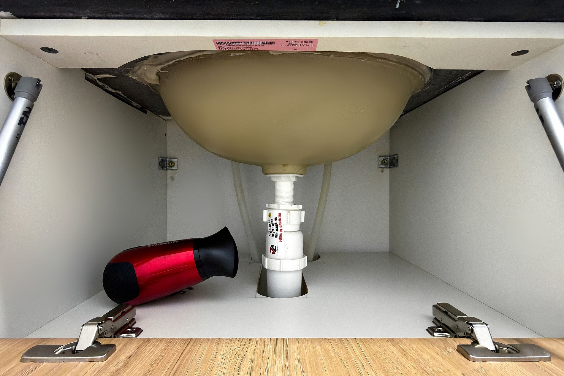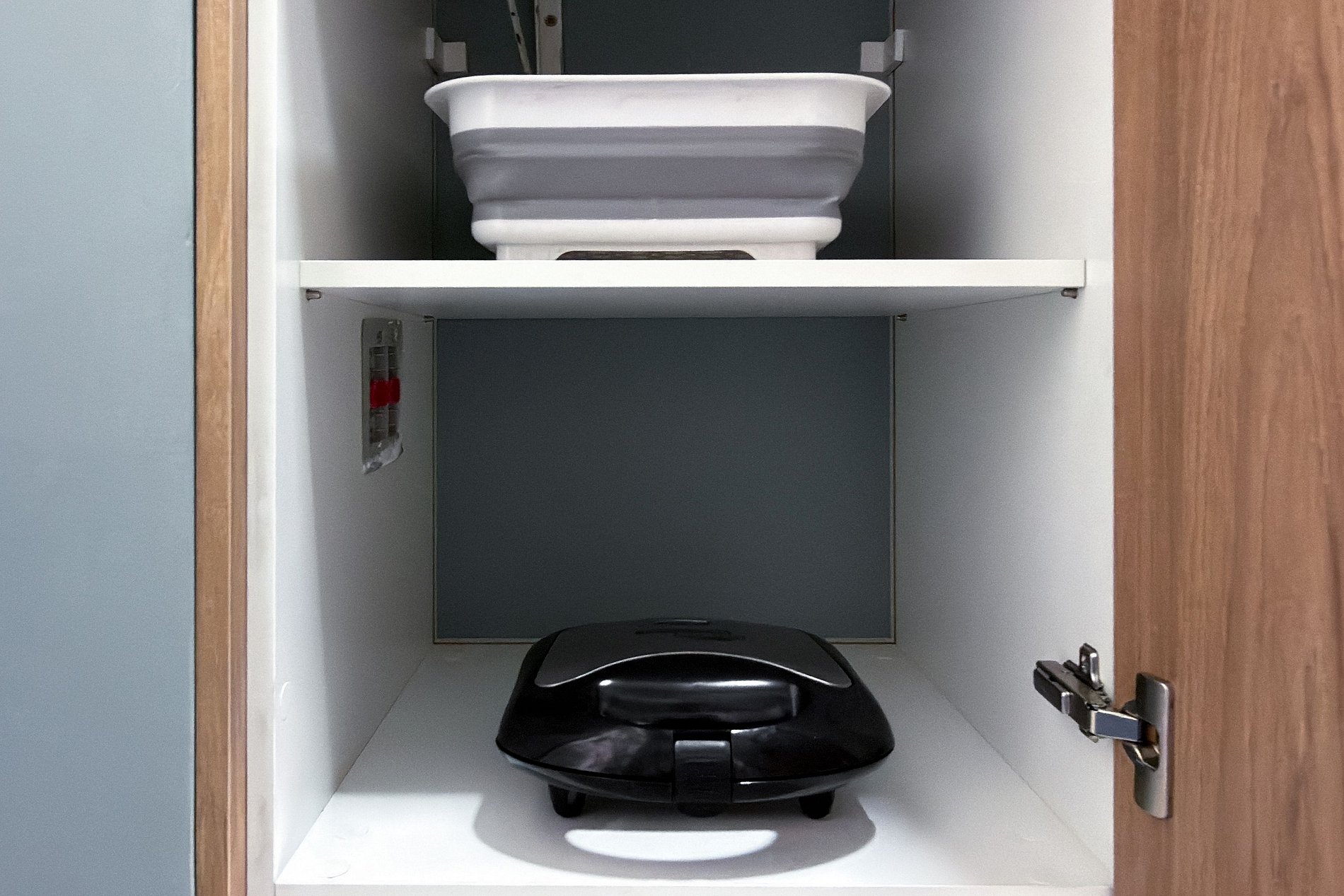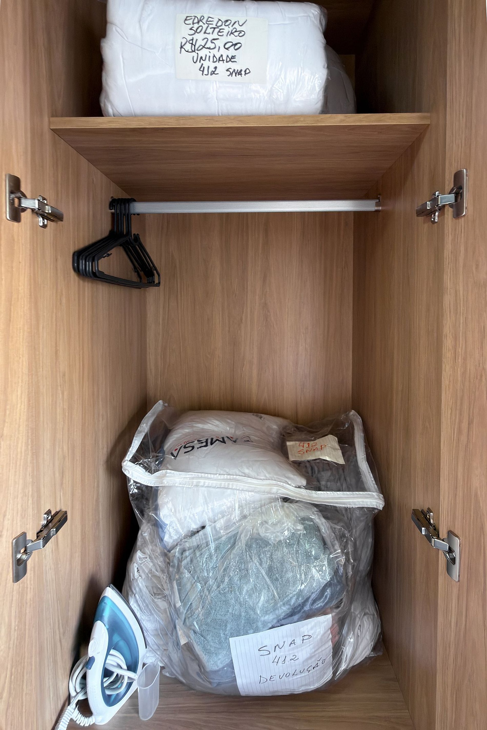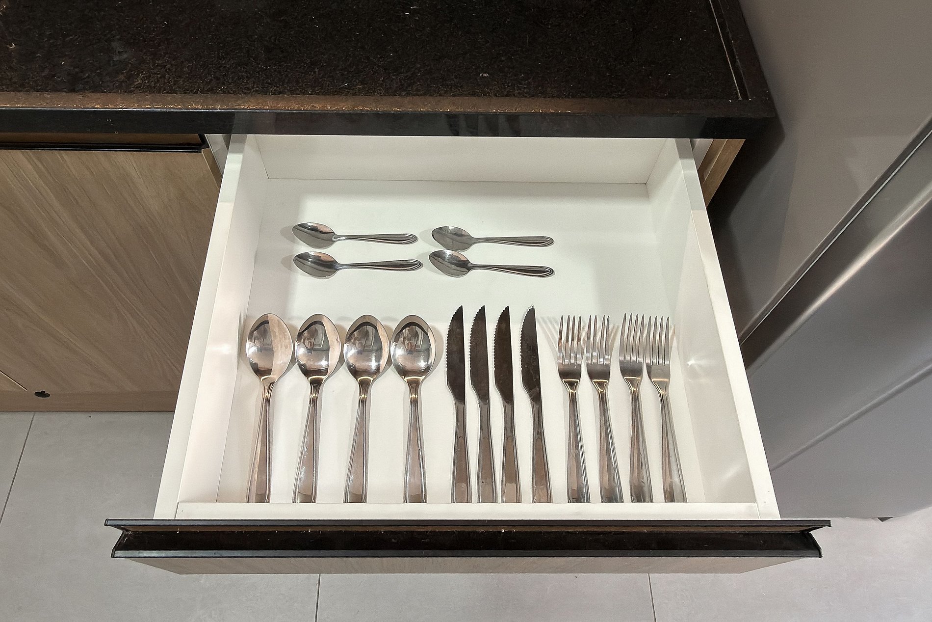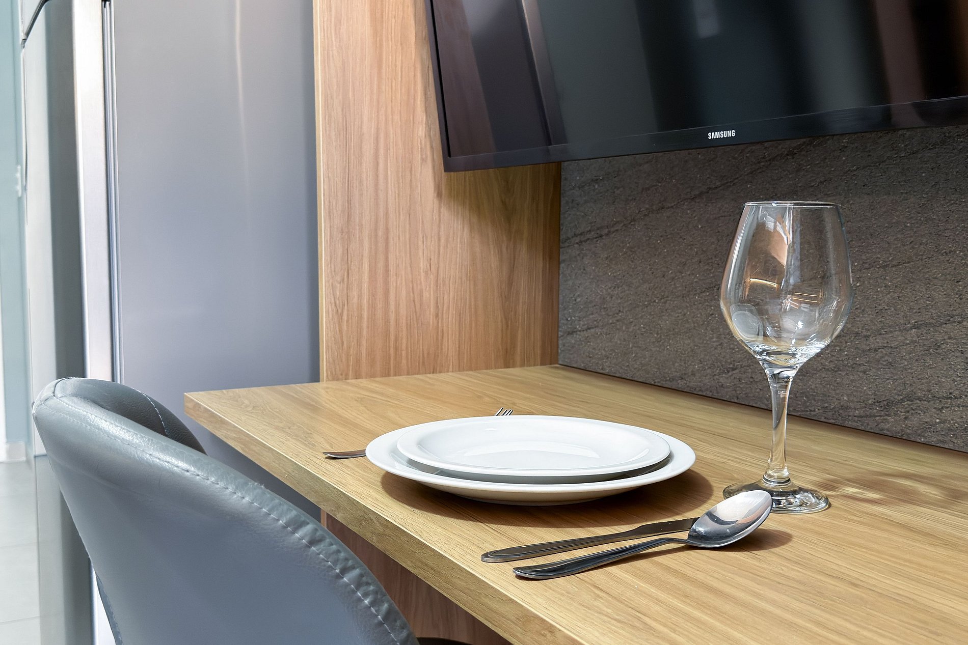Cozinha equipada: cooktop, micro-ondas, cafeteira, geladeira e utensílios completos (panelas, talheres, taças e pratos)