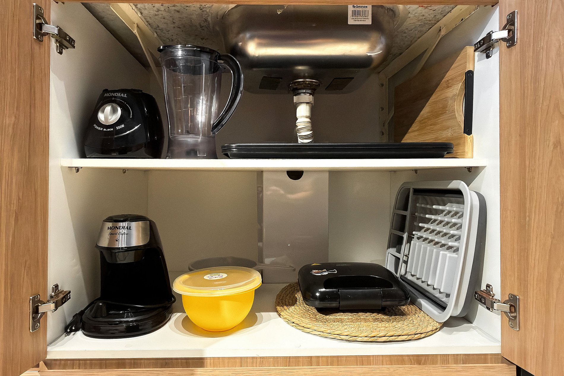 Cafeteira, airfryer, sanduicheira, panelas, talheres, copos e taças