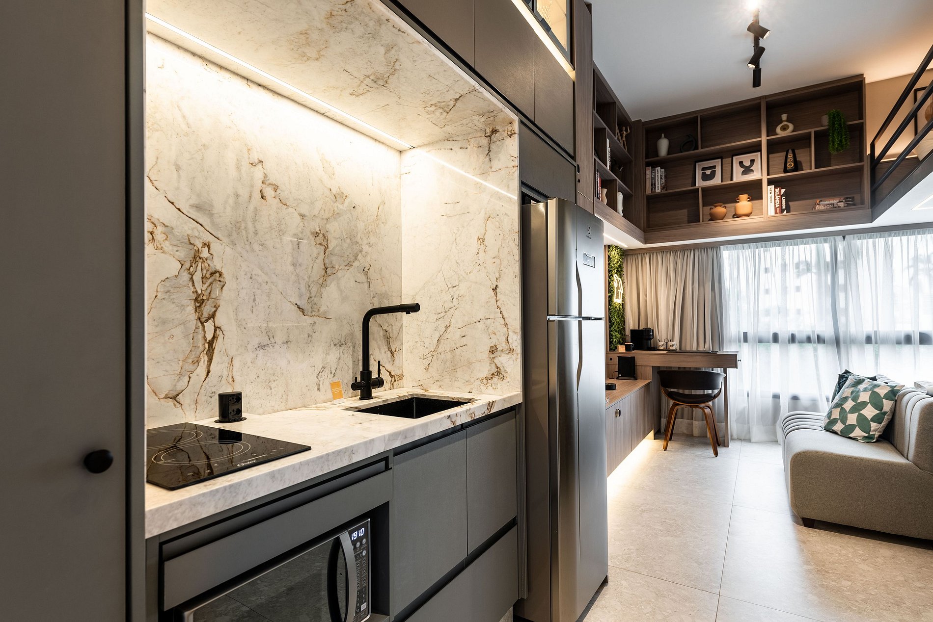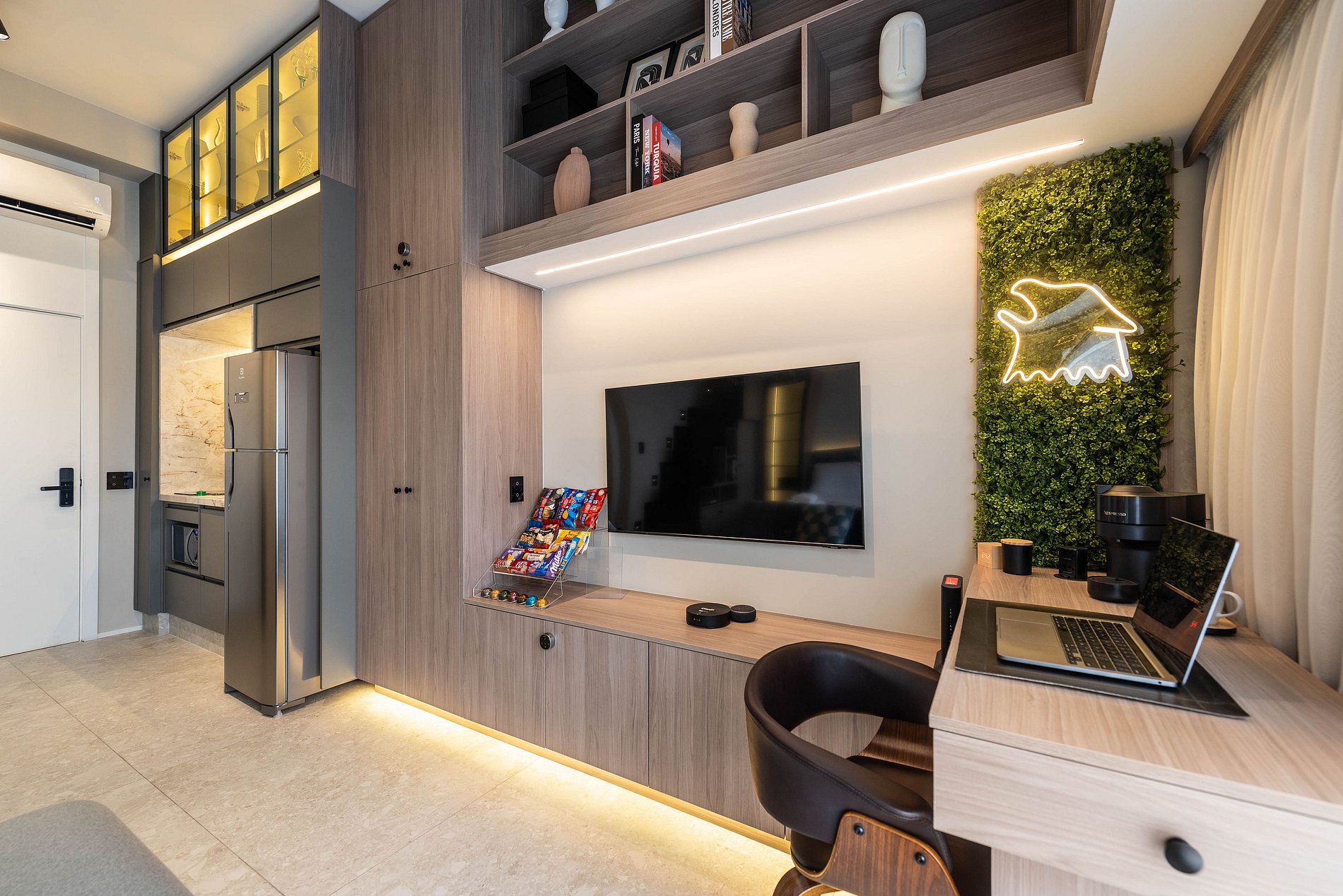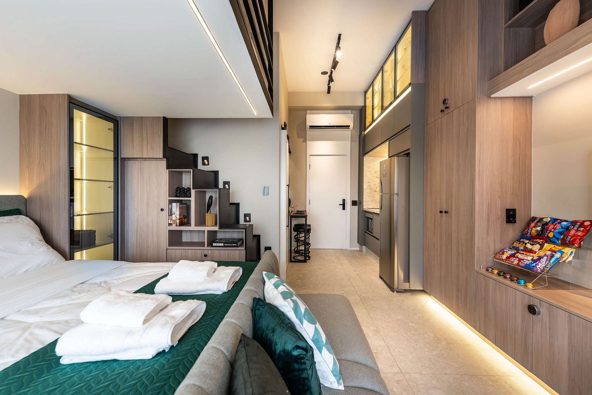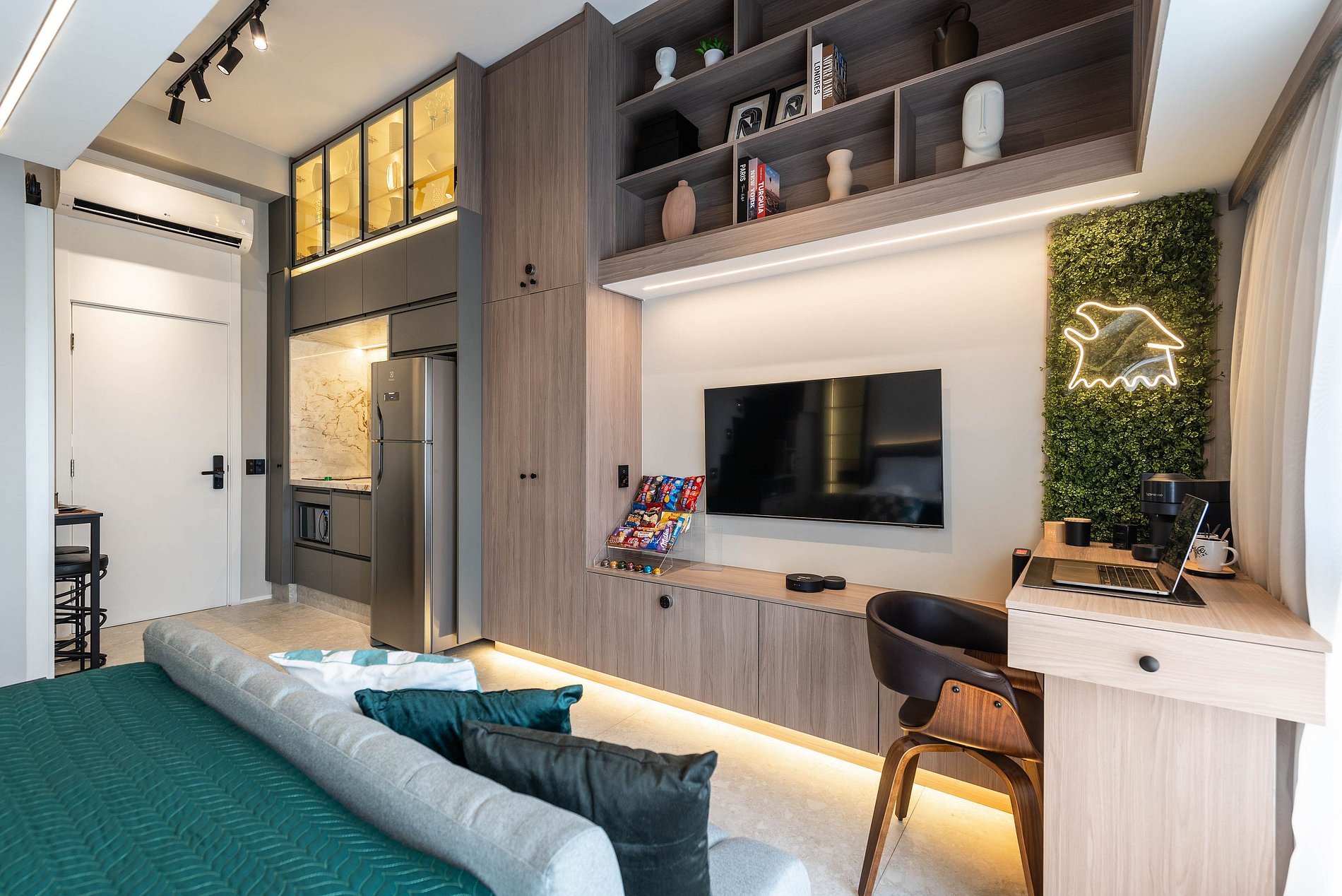 Apartamento automatizado com Alexa e snack bar para melhorar sua experiência. O espaço O estúdio é automatizado com a Alexa, oferecendo várias facilidades, como acender as luzes de forma prática com apenas um comando de voz.