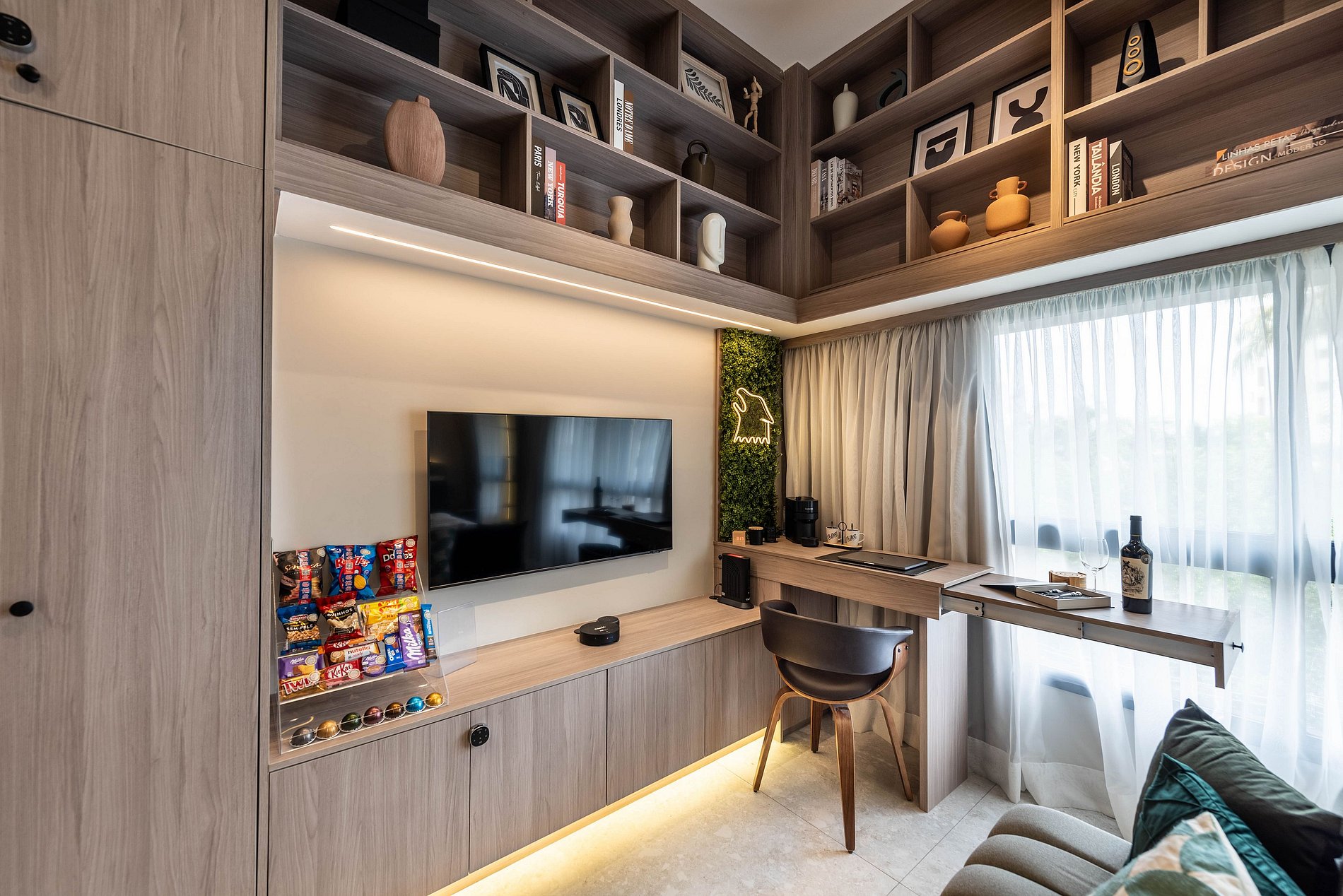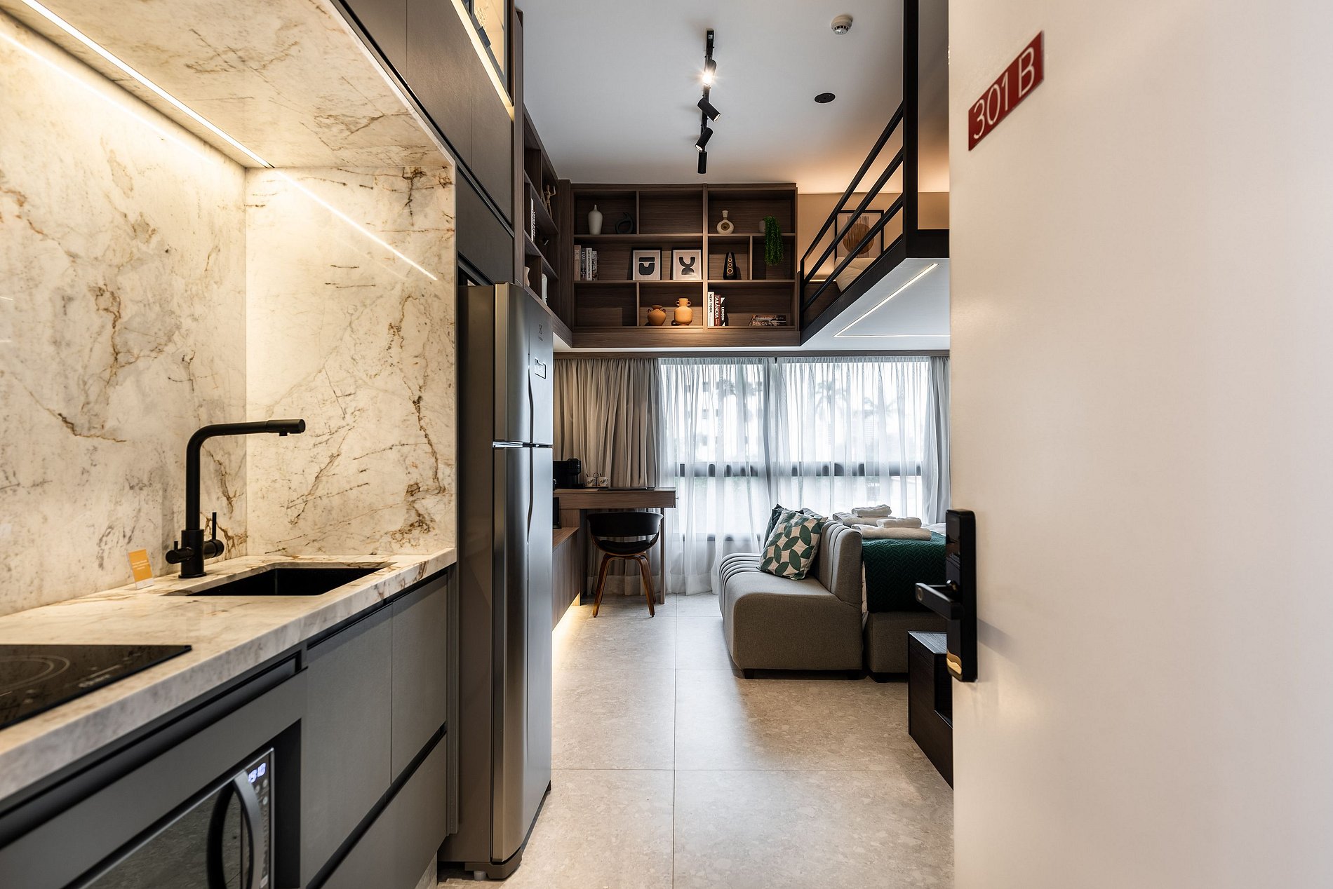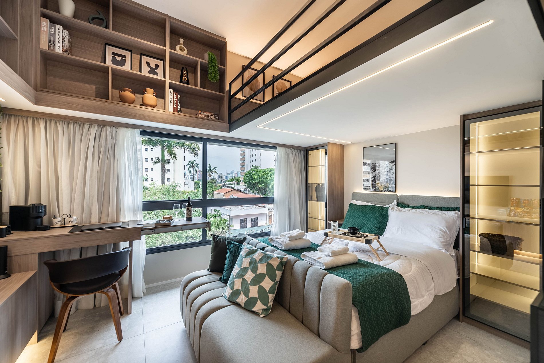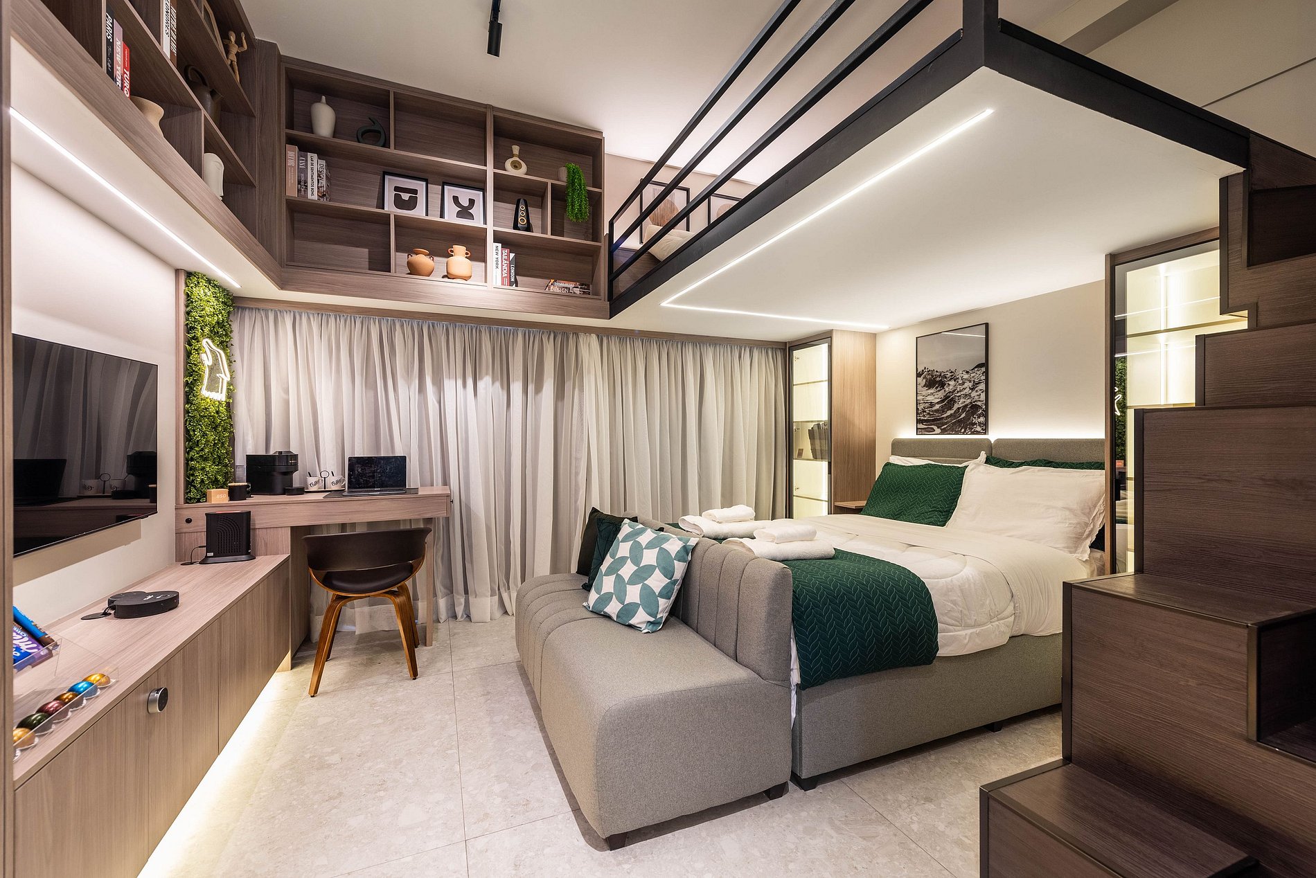 Apartamento automatizado com Alexa e snack bar para melhorar sua experiência. O espaço O estúdio é automatizado com a Alexa, oferecendo várias facilidades, como acender as luzes de forma prática com apenas um comando de voz.