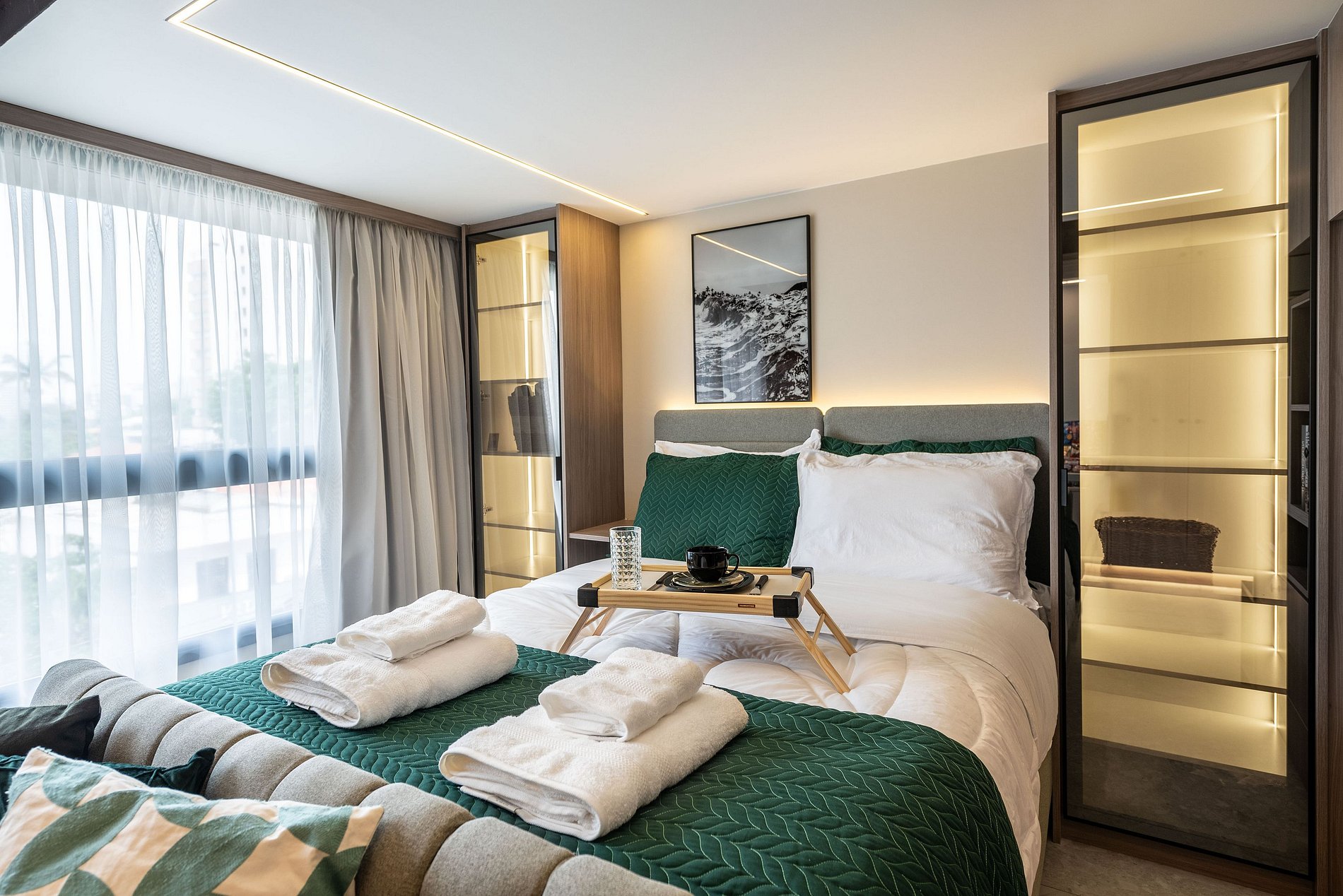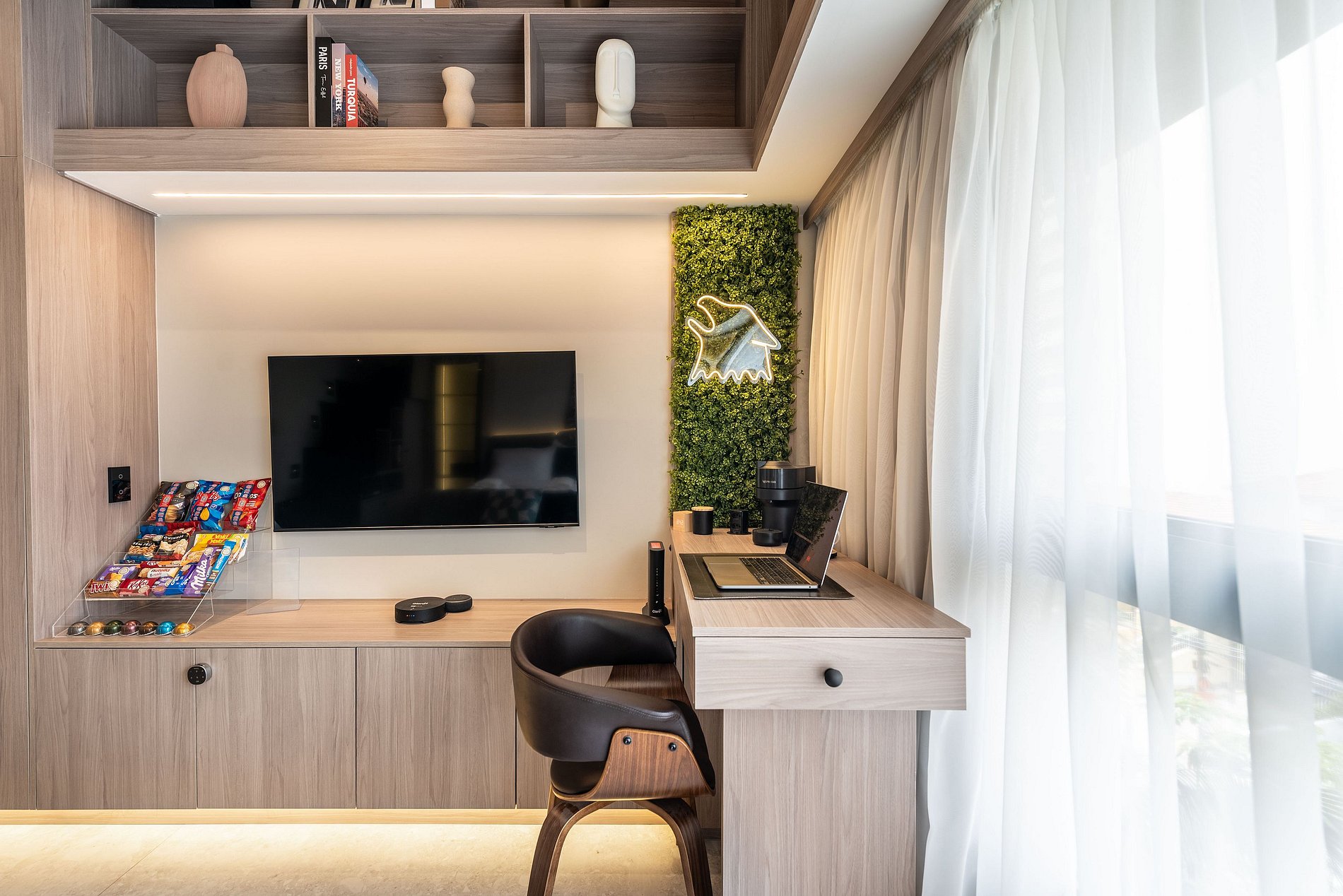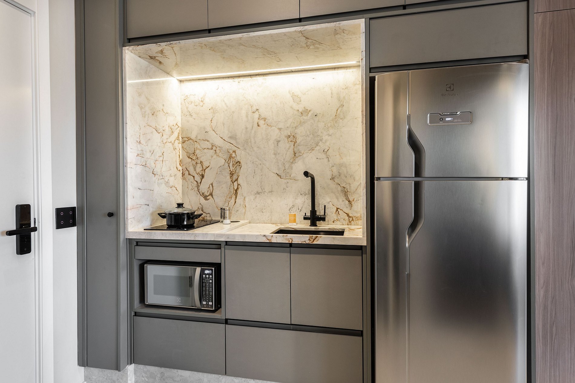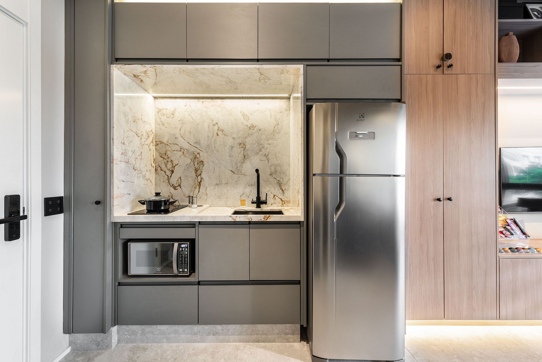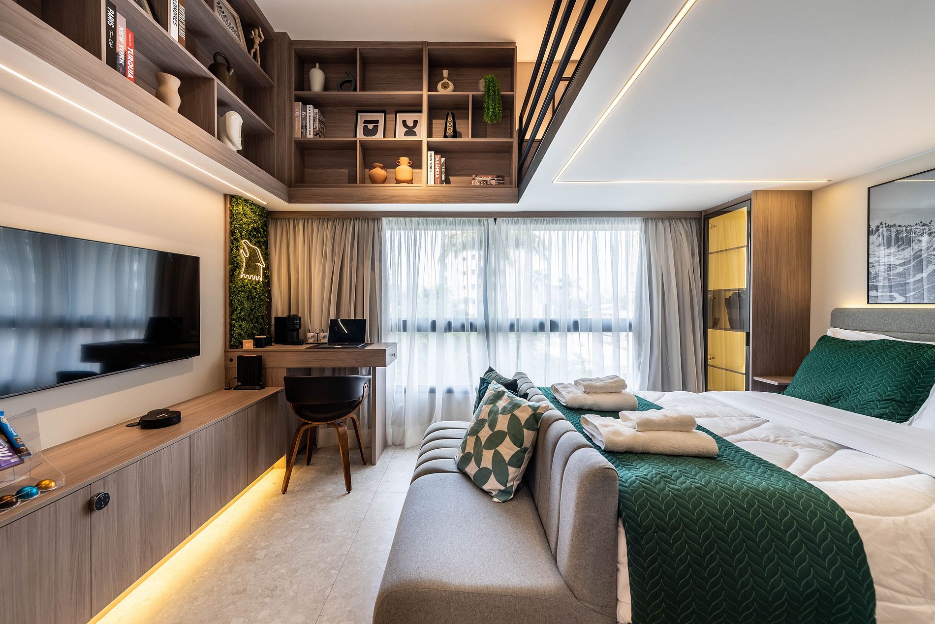 Apartamento automatizado com Alexa e snack bar para melhorar sua experiência. O espaço O estúdio é automatizado com a Alexa, oferecendo várias facilidades, como acender as luzes de forma prática com apenas um comando de voz.