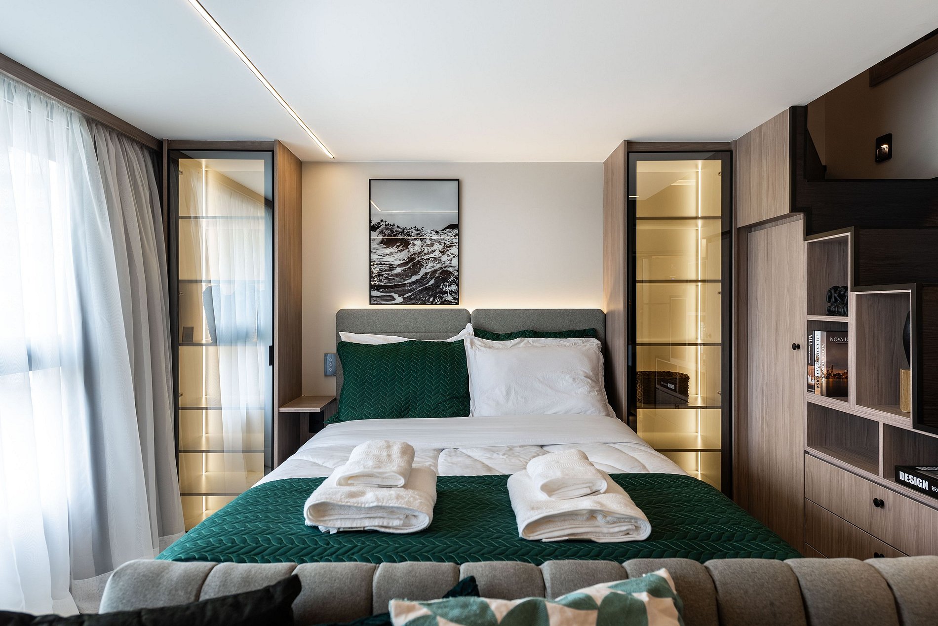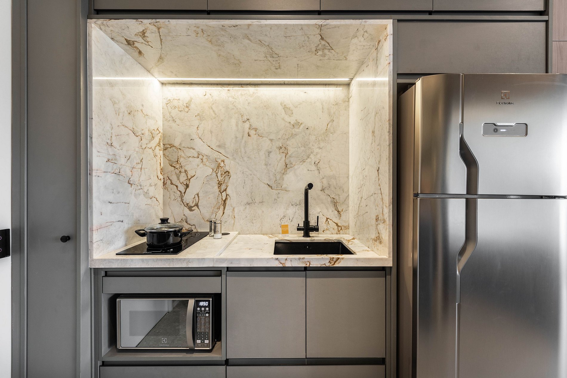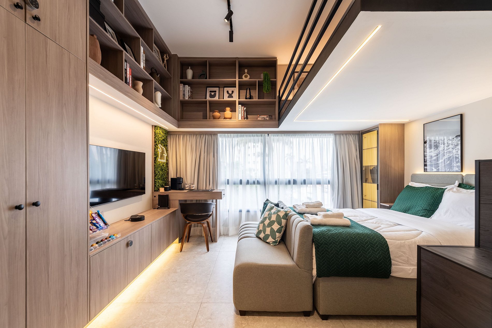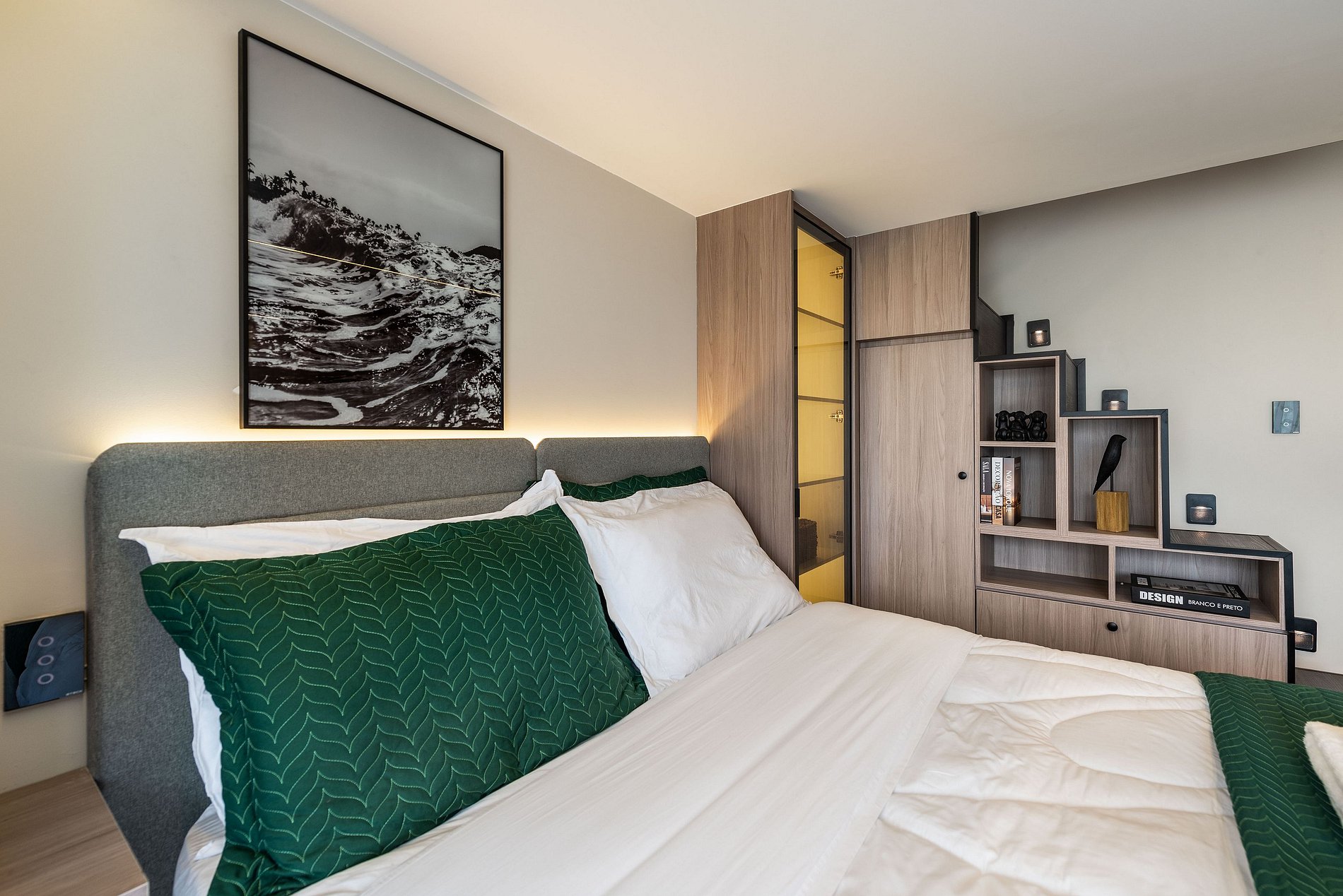 Apartamento automatizado com Alexa e snack bar para melhorar sua experiência. O espaço O estúdio é automatizado com a Alexa, oferecendo várias facilidades, como acender as luzes de forma prática com apenas um comando de voz.