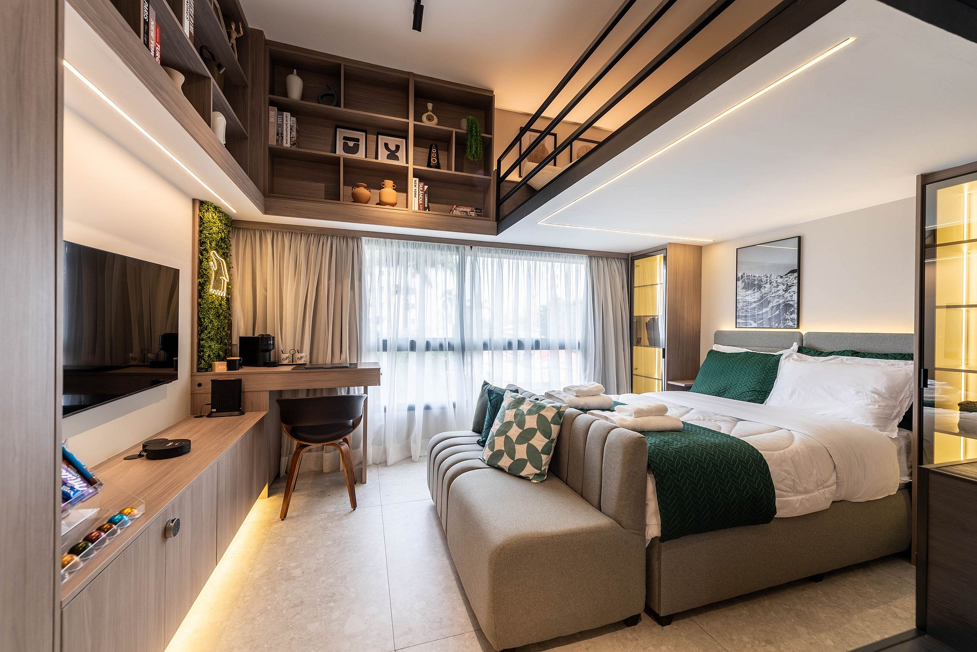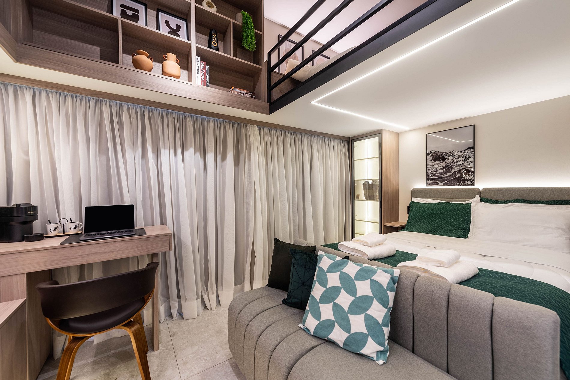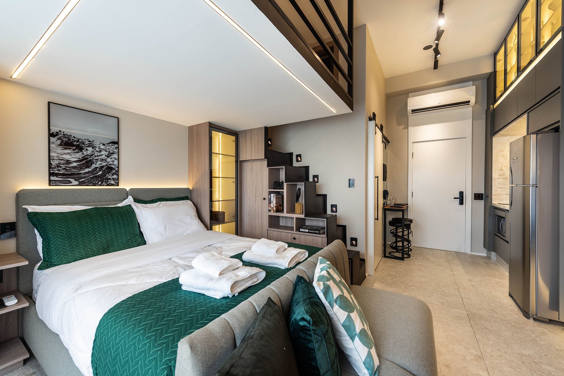 O apartamento possui 1 cama de casal padrão (1,38x1,88) e um mezanino com futon de casal para acomodar o terceiro/quarto hóspede. Cozinha completa com geladeira, freezer, micro-ondas, fogão de indução (2 bocas), taças de vinho, cafeteira elétrica de pó e Nespresso, bancada para home office, guarda-roupa, TV e banheiro com ótimo chuveiro (água quente e fria). Será fornecido um jogo de enxoval (lençóis, travesseiros, fronhas e toalhas de banho e rosto) por hóspede. Não há trocas durante a permanência.