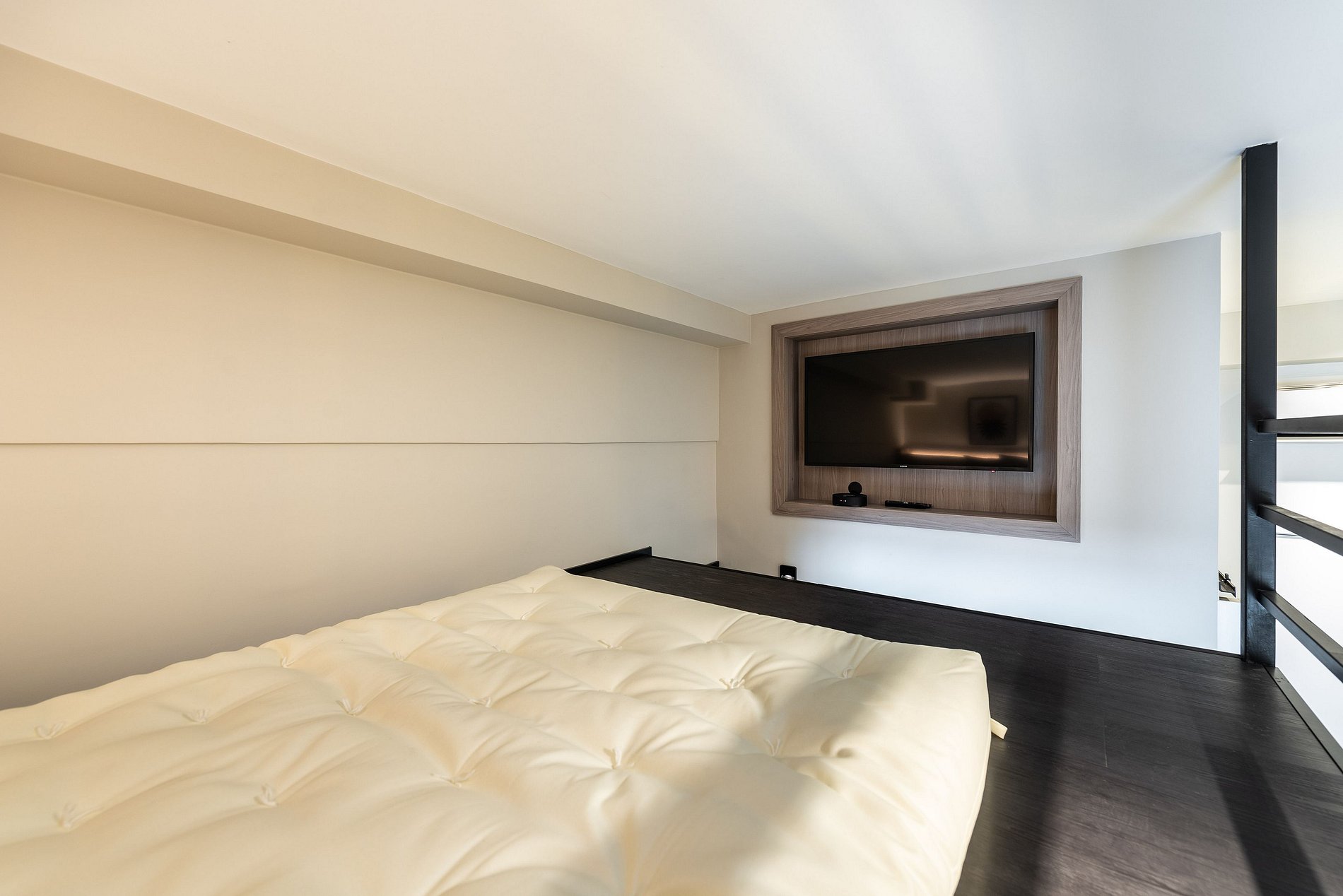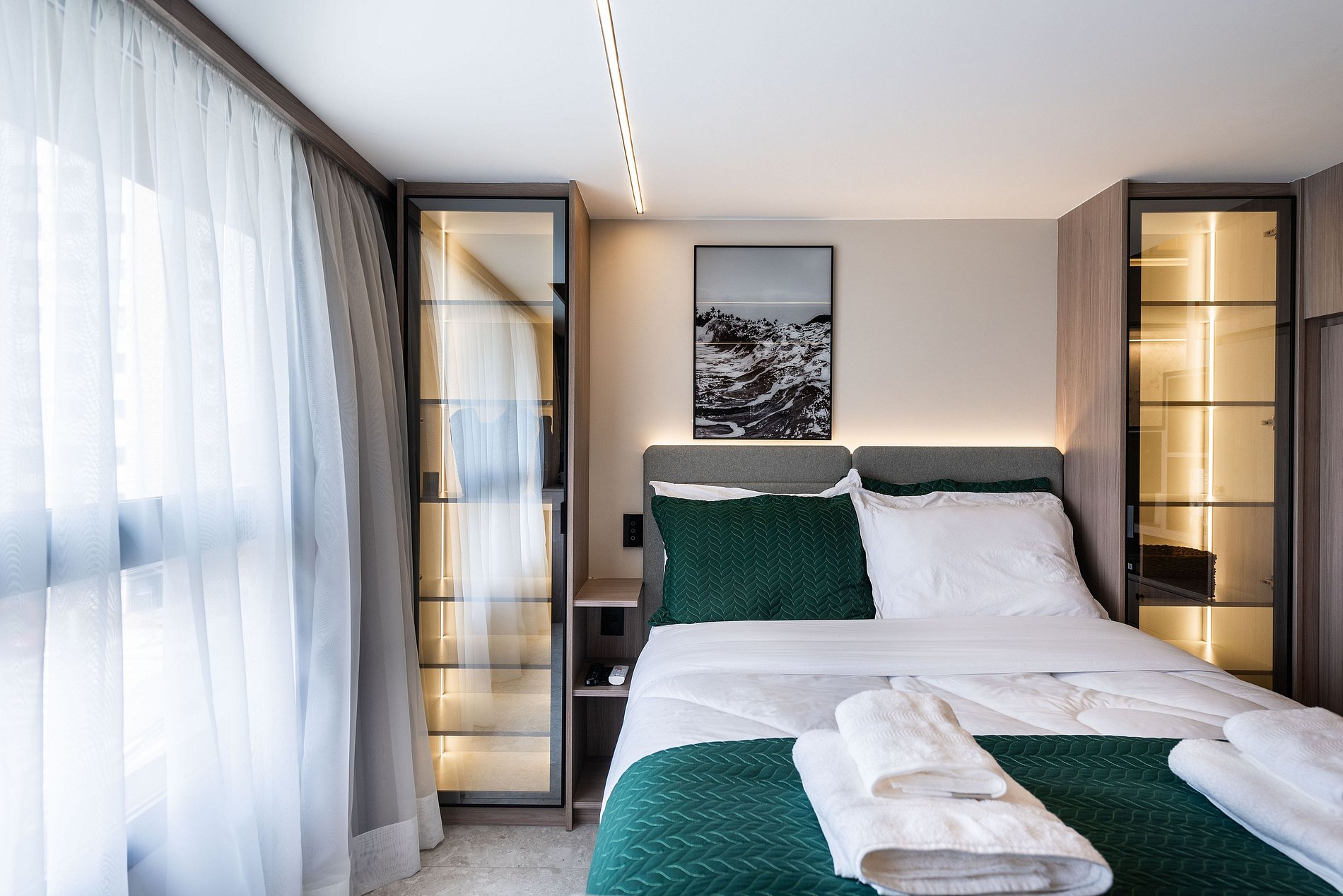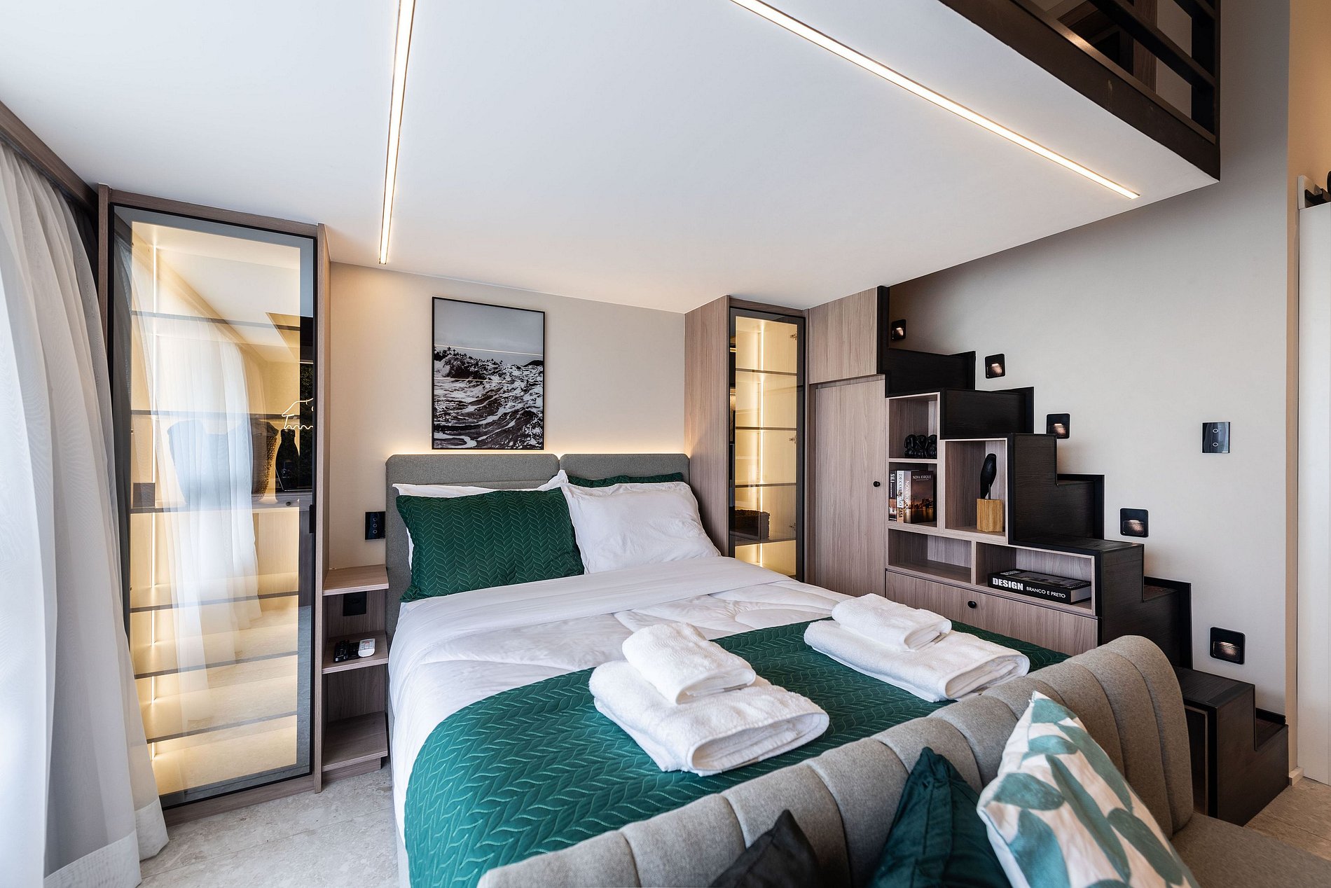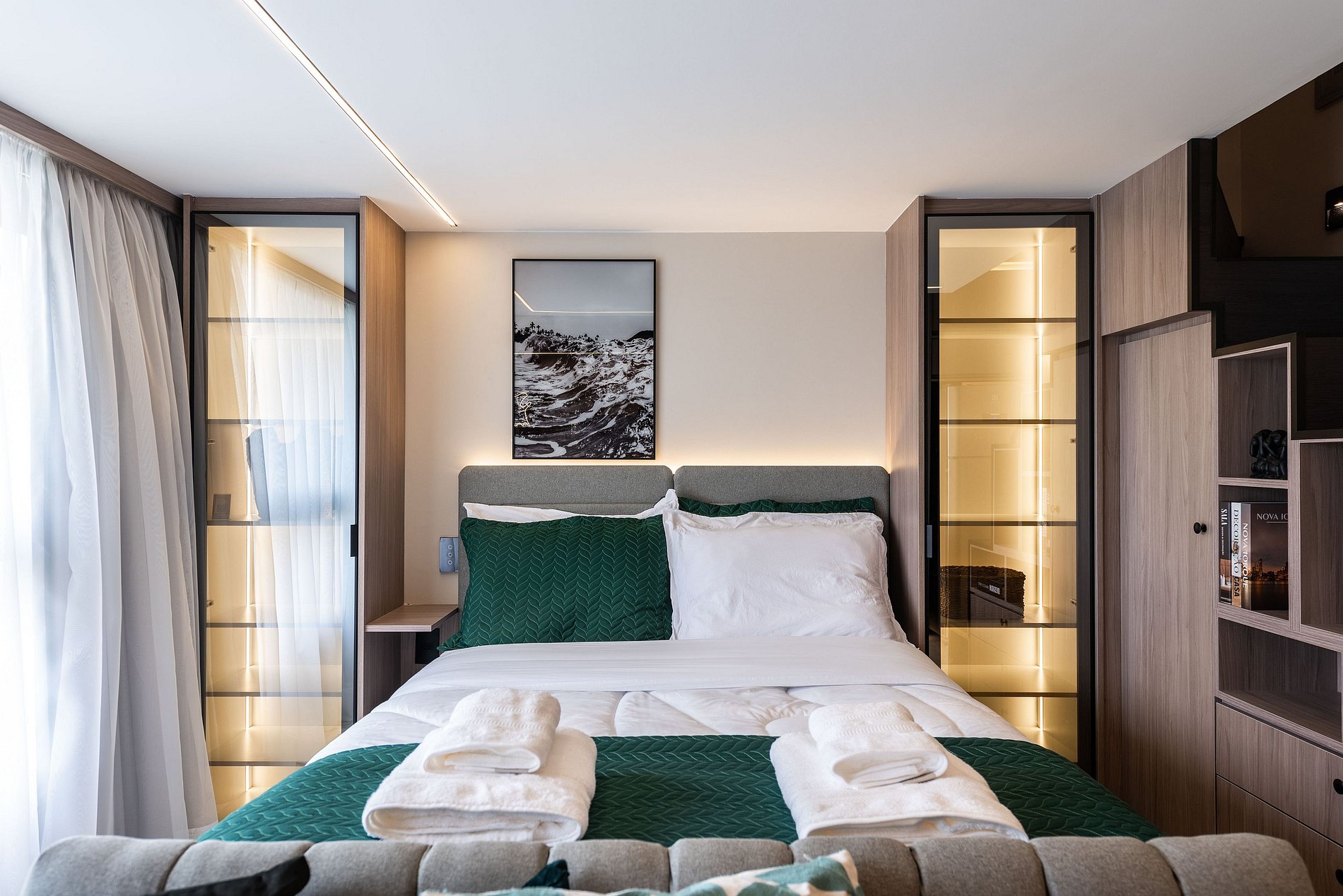 O apartamento possui 1 cama de casal padrão (1,38x1,88) e um mezanino com futon de casal para acomodar o terceiro/quarto hóspede. Cozinha completa com geladeira, freezer, micro-ondas, fogão de indução (2 bocas), taças de vinho, cafeteira elétrica de pó e Nespresso, bancada para home office, guarda-roupa, TV e banheiro com ótimo chuveiro (água quente e fria). Será fornecido um jogo de enxoval (lençóis, travesseiros, fronhas e toalhas de banho e rosto) por hóspede. Não há trocas durante a permanência.