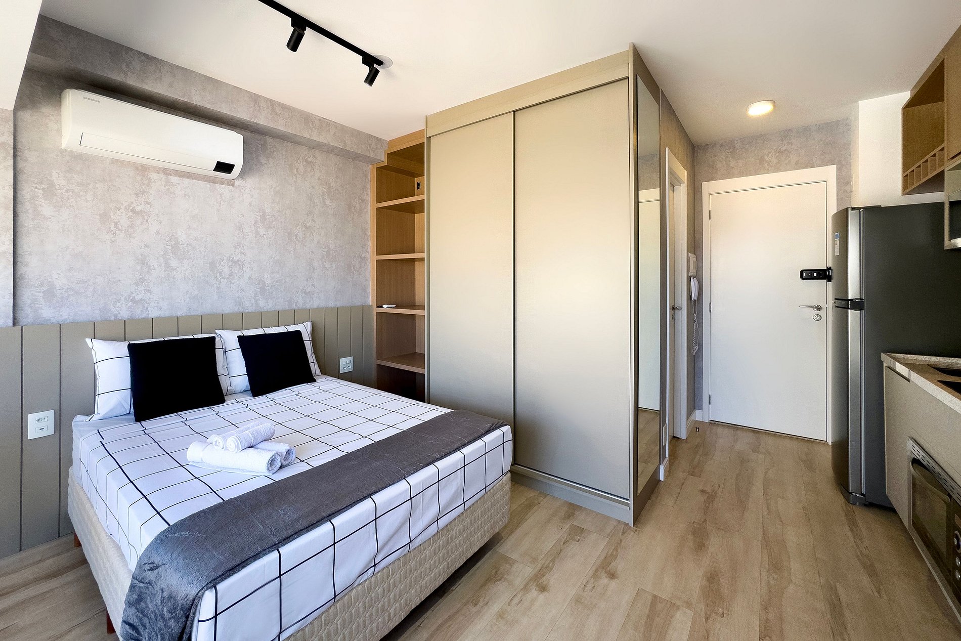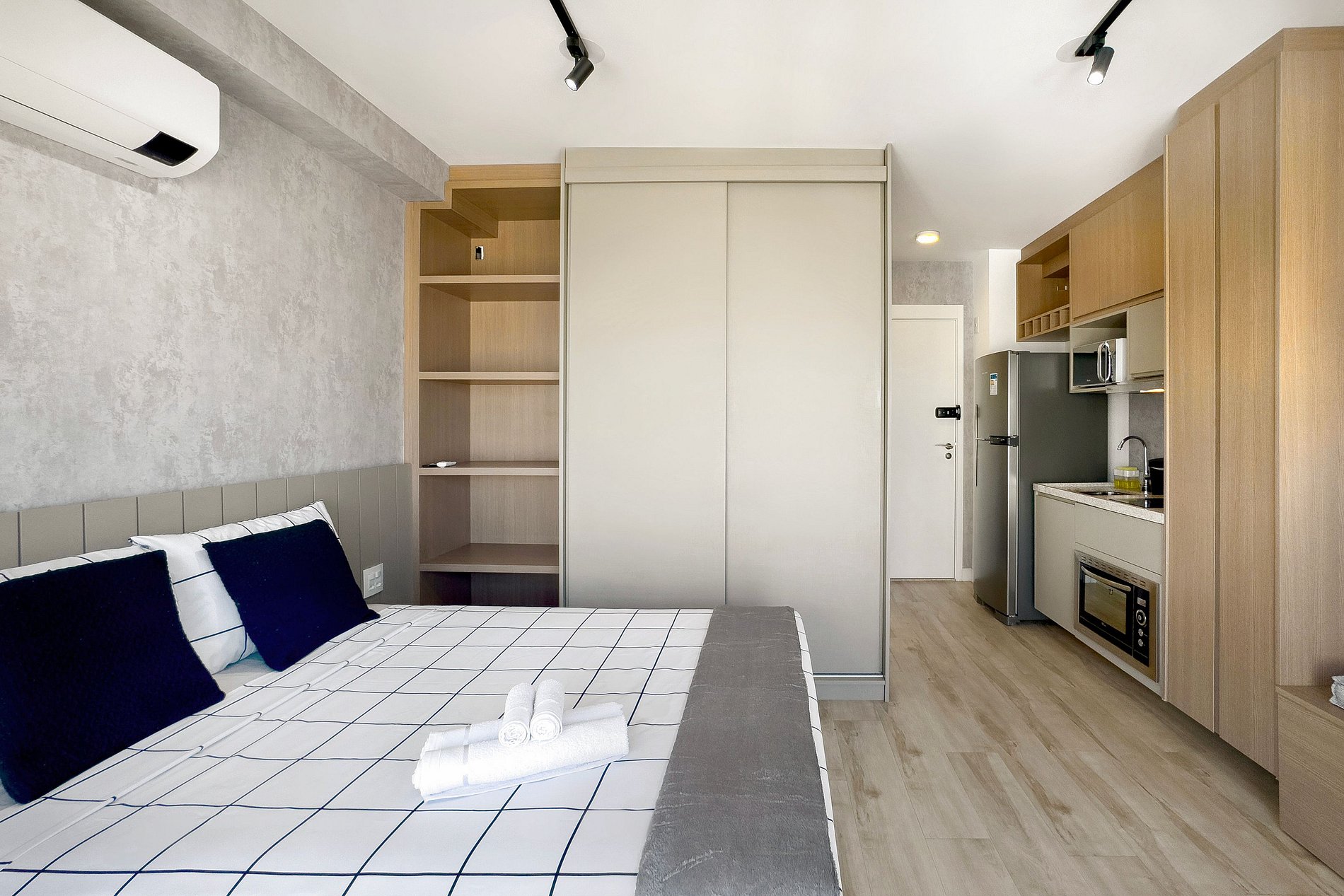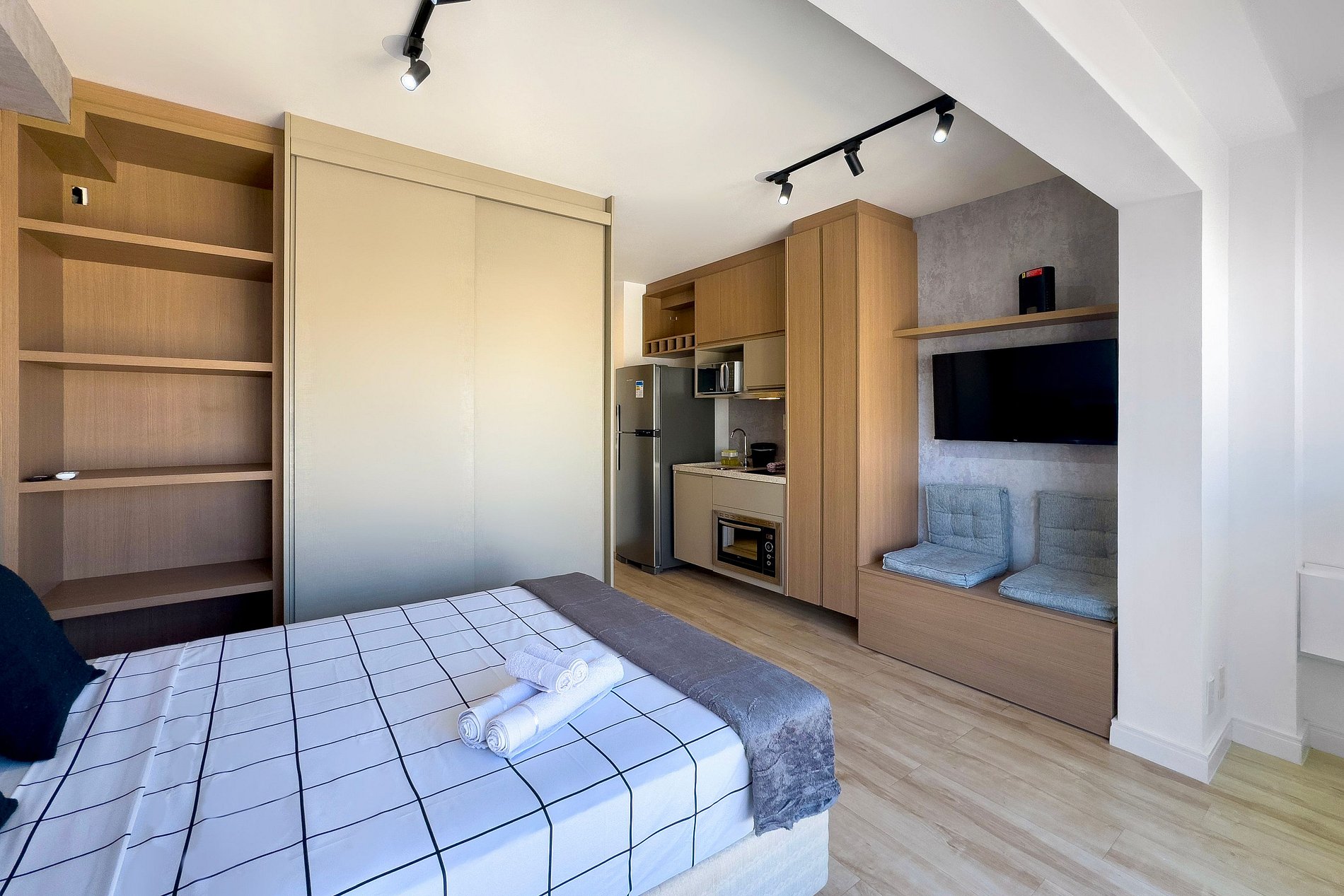 O apartamento possui 1 cama de casal padrão (1,38x1,88). Cozinha completa com geladeira, freezer, micro-ondas, fogão de indução (2 bocas), taças de vinho, cafeteira elétrica de pó , bancada para home office, guarda-roupa, TV e banheiro com ótimo chuveiro (água quente e fria). Será fornecido um jogo de enxoval (lençóis, travesseiros, fronhas e toalhas de banho e rosto) por hóspede. Não há trocas durante a permanência.