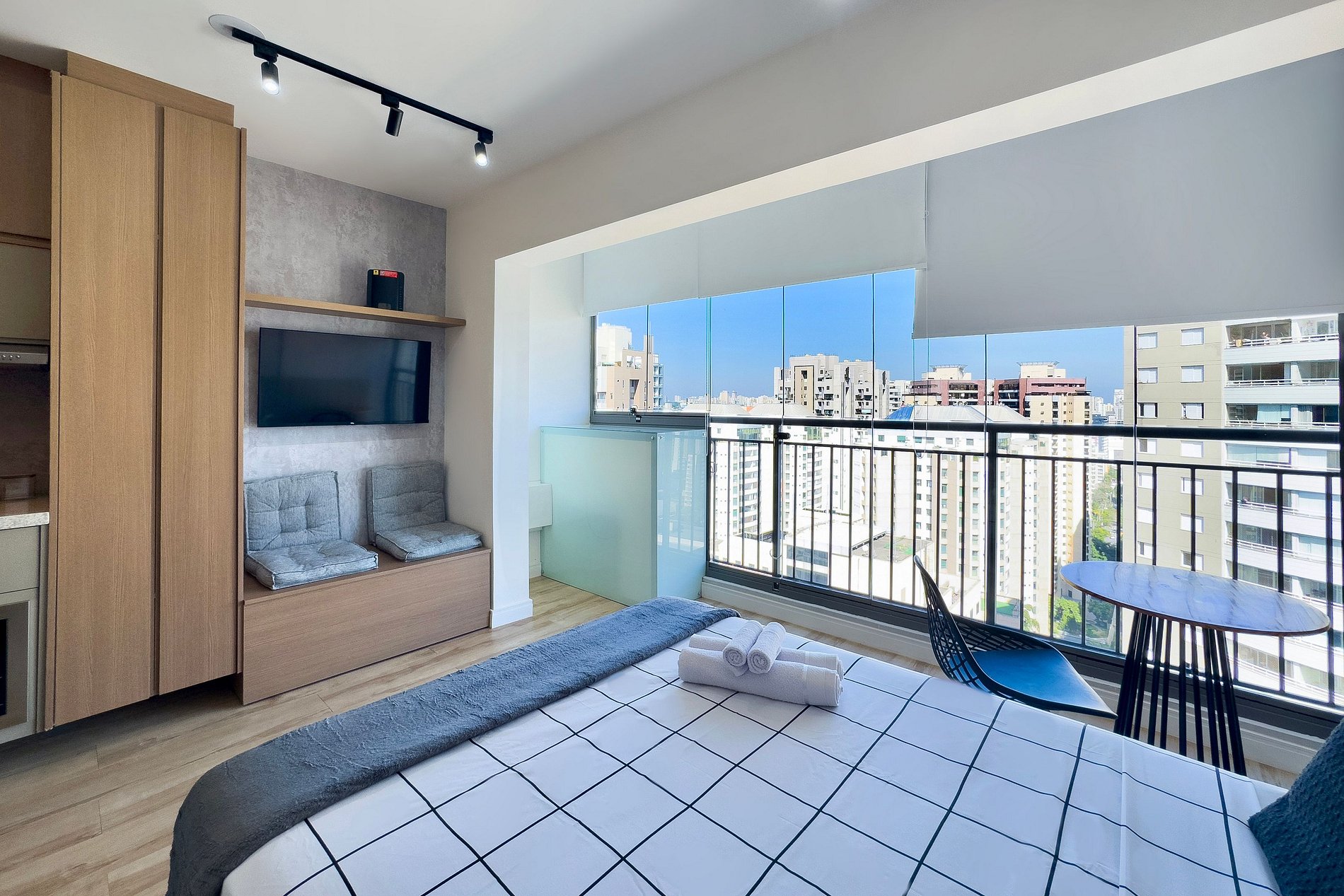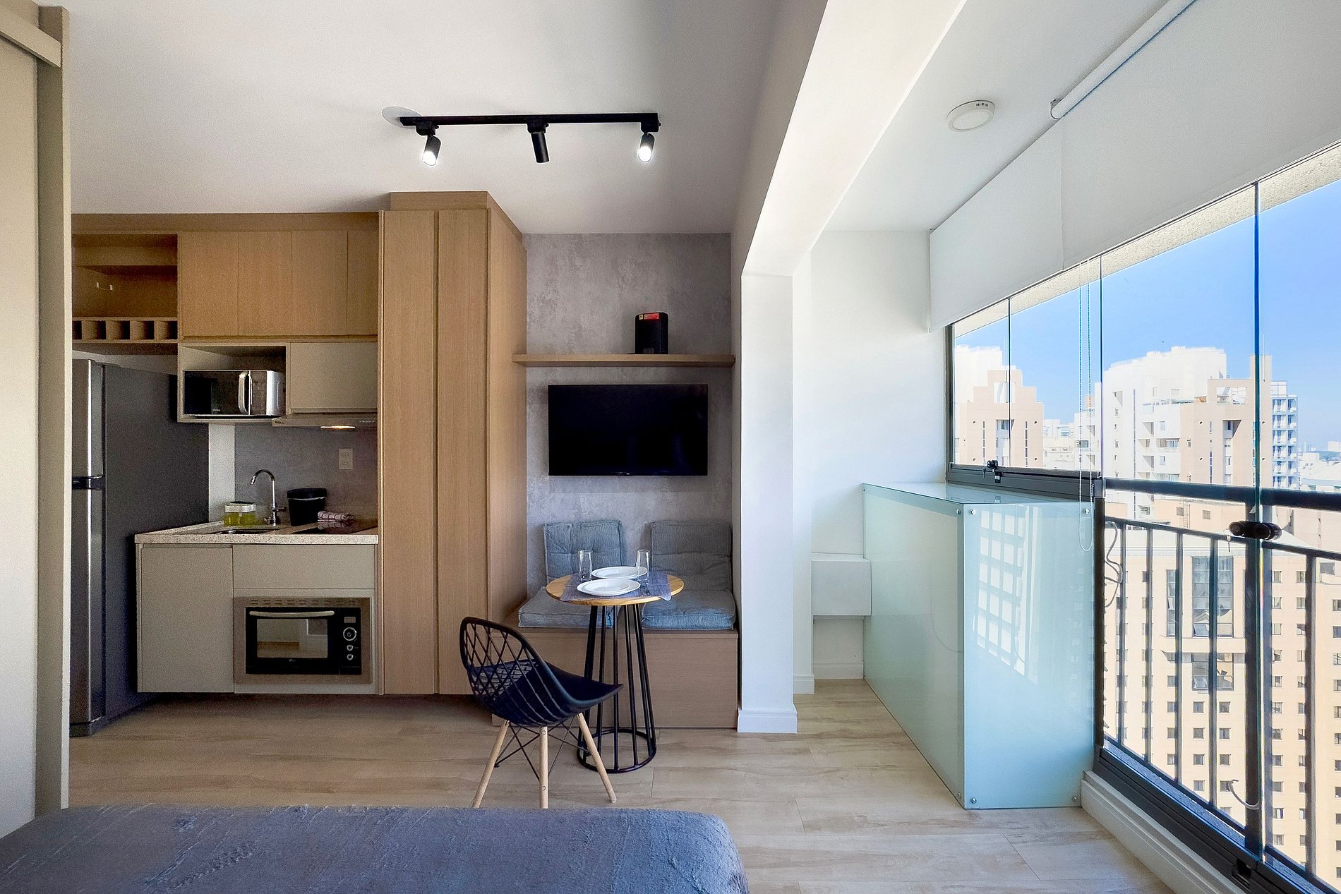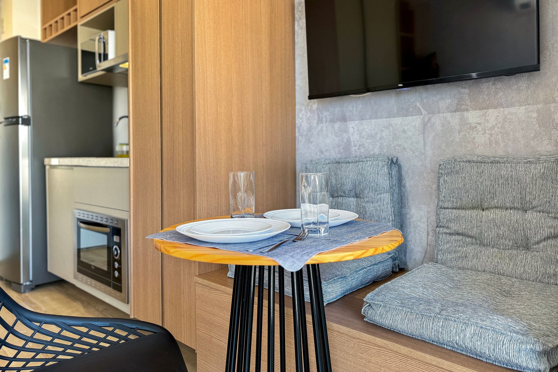 O apartamento possui 1 cama de casal padrão (1,38x1,88). Cozinha completa com geladeira, freezer, micro-ondas, fogão de indução (2 bocas), taças de vinho, cafeteira elétrica de pó , bancada para home office, guarda-roupa, TV e banheiro com ótimo chuveiro (água quente e fria). Será fornecido um jogo de enxoval (lençóis, travesseiros, fronhas e toalhas de banho e rosto) por hóspede. Não há trocas durante a permanência.