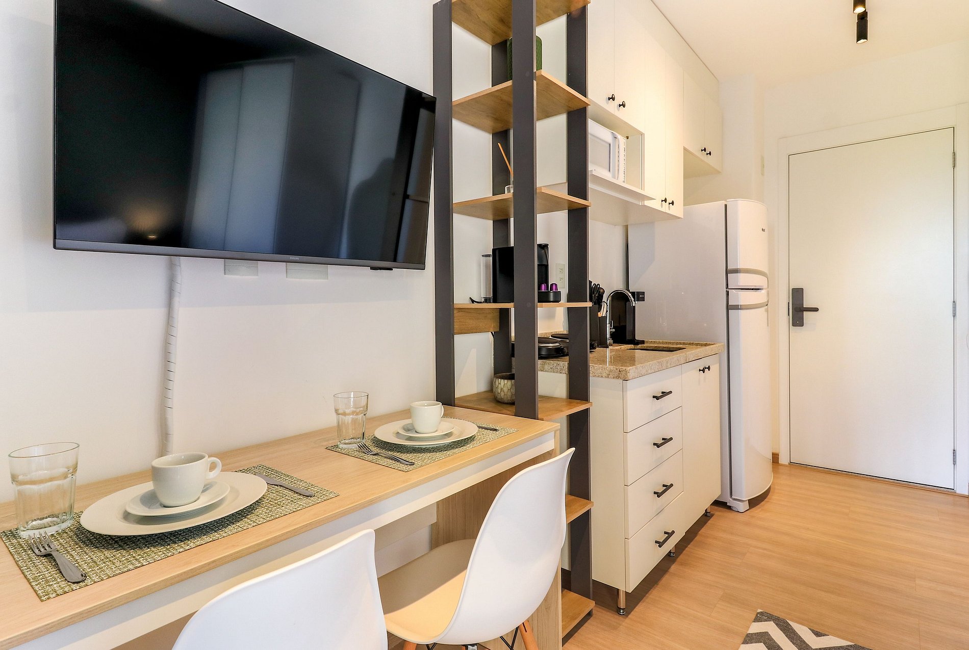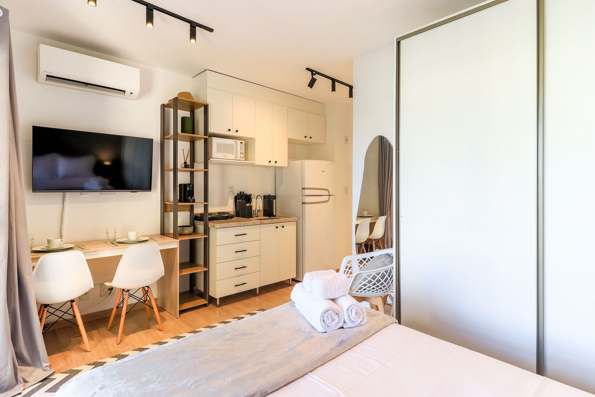 O apartamento possui 1 cama de casal padrão (1,38x1,88). Cozinha completa com geladeira, freezer, micro-ondas, fogão de indução (2 bocas), taças de vinho, cafeteira Nespresso , bancada para home office, guarda-roupa, TV e banheiro com ótimo chuveiro (água quente e fria). Será fornecido um jogo de enxoval (lençóis, travesseiros, fronhas e toalhas de banho e rosto) por hóspede. Não há trocas durante a permanência.
