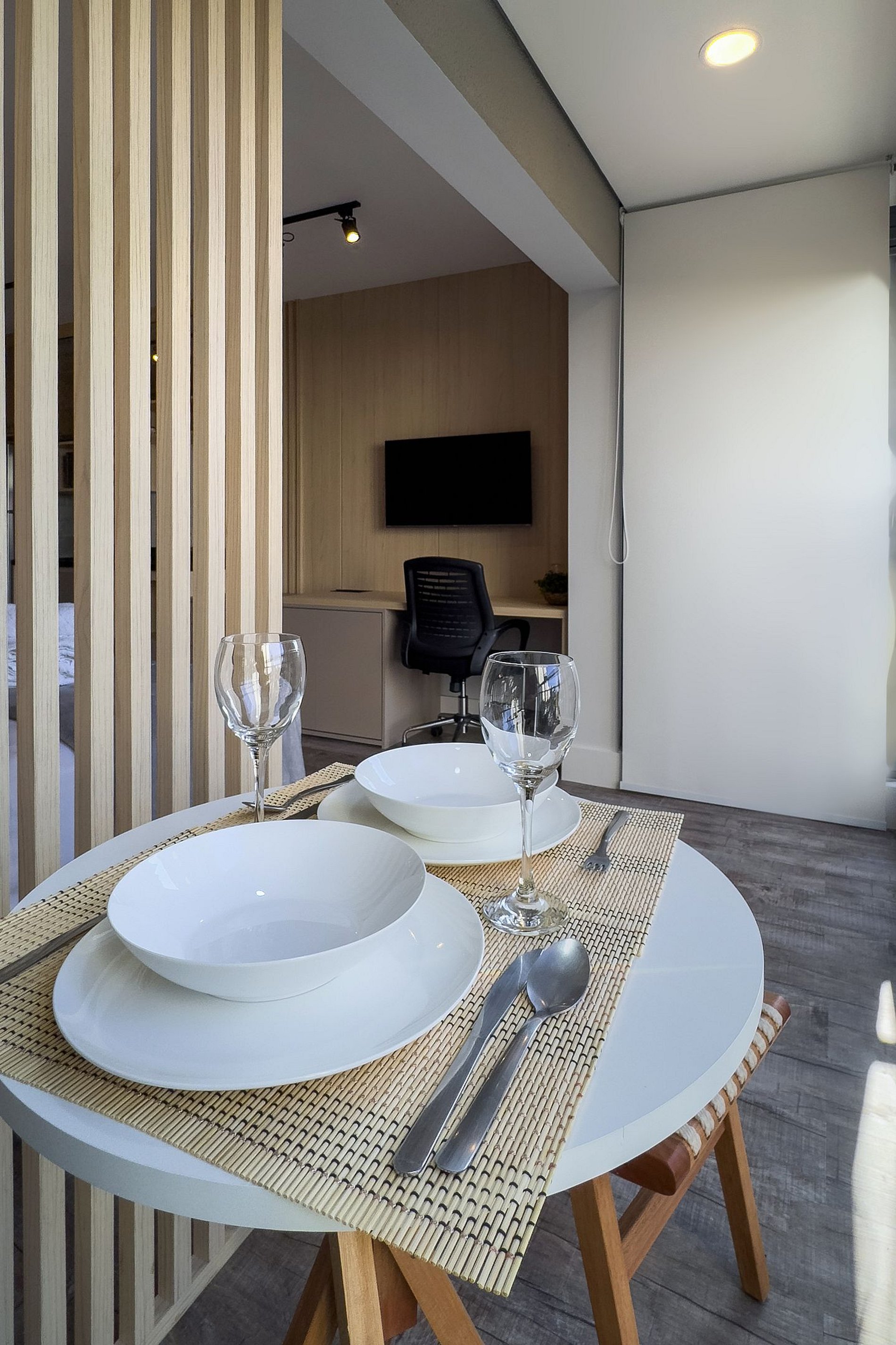 O apartamento possui 1 cama de casal King (1,85x1,98). Cozinha completa com geladeira, freezer, micro-ondas, fogão de indução (2 bocas), taças de vinho, cafeteira expresso , bancada para home office, guarda-roupa, TV e banheiro com ótimo chuveiro (água quente e fria). Será fornecido um jogo de enxoval (lençóis, travesseiros, fronhas , manta , toalhas de banho e rosto) por hóspede. Não há trocas durante a permanência.