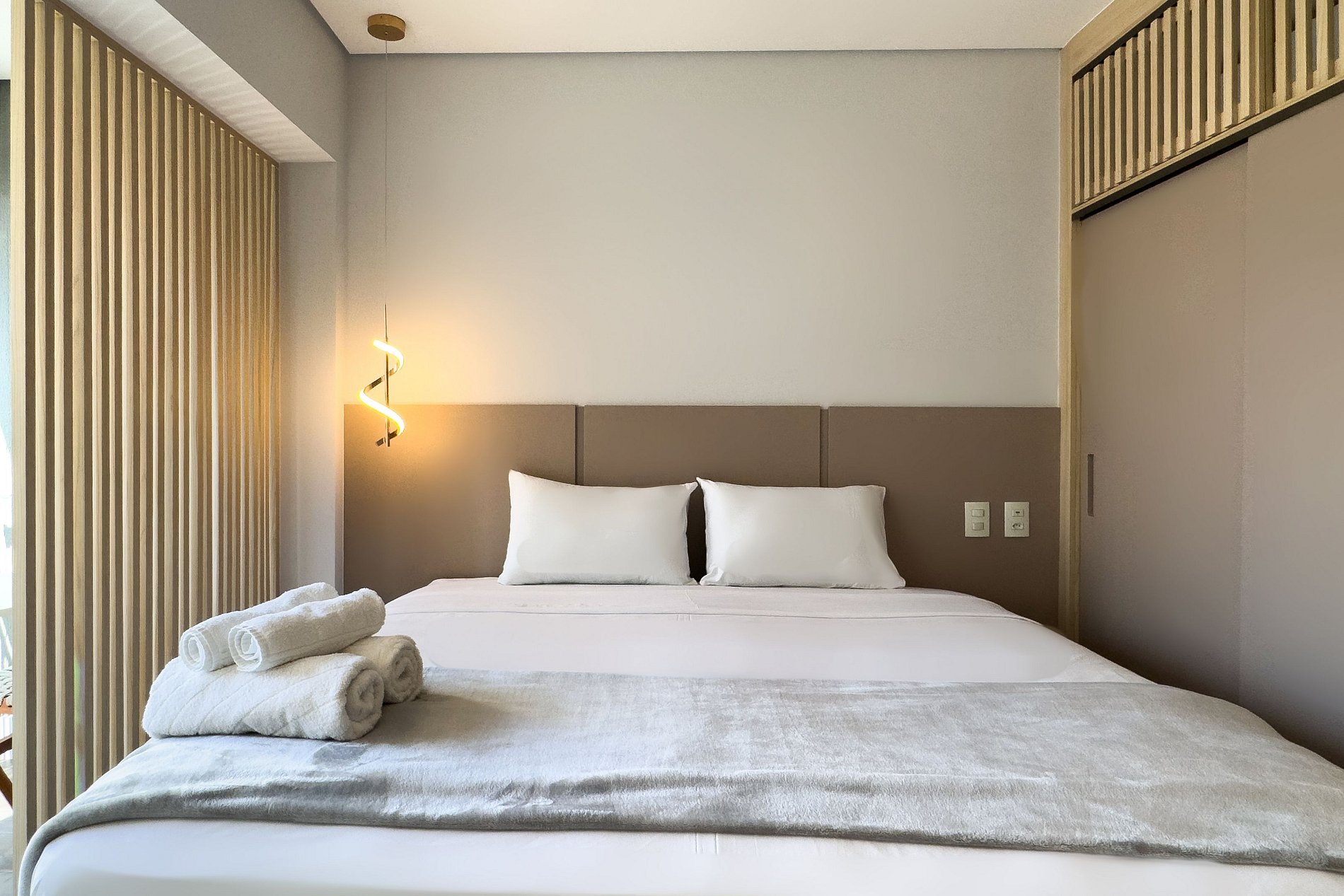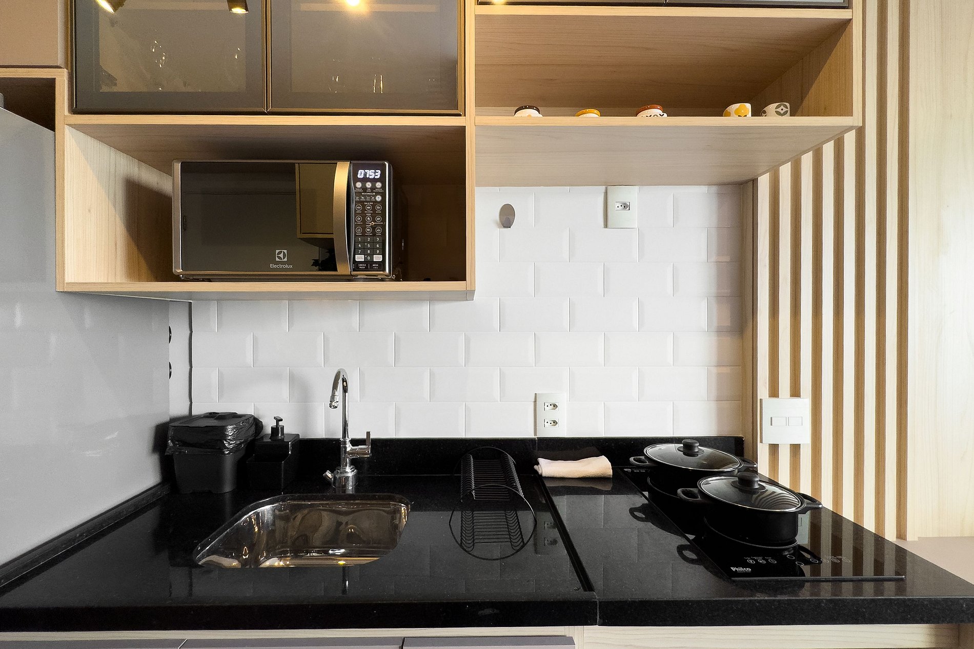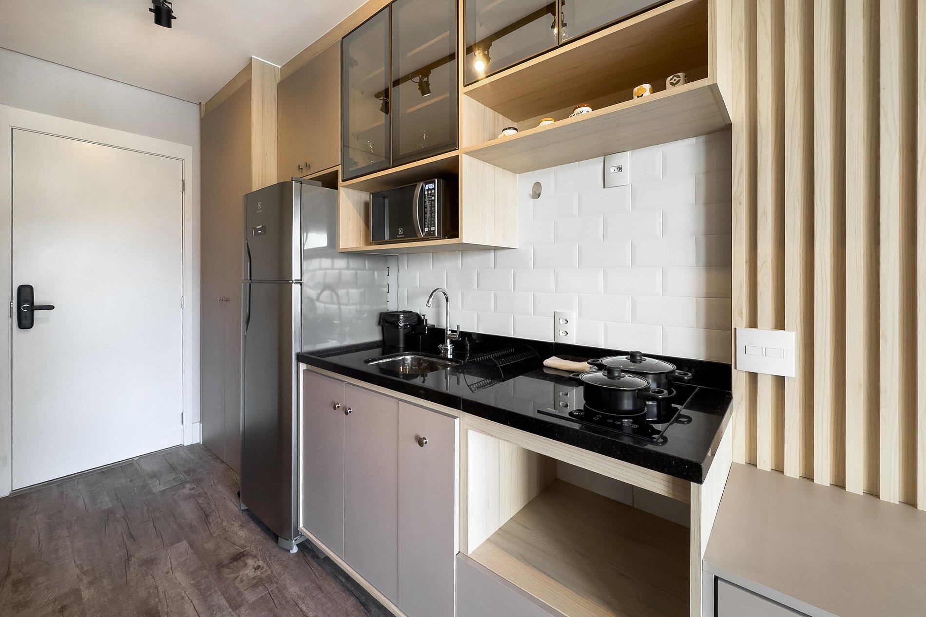 O apartamento possui 1 cama de casal King (1,85x1,98). Cozinha completa com geladeira, freezer, micro-ondas, fogão de indução (2 bocas), taças de vinho, cafeteira expresso , bancada para home office, guarda-roupa, TV e banheiro com ótimo chuveiro (água quente e fria). Será fornecido um jogo de enxoval (lençóis, travesseiros, fronhas , manta , toalhas de banho e rosto) por hóspede. Não há trocas durante a permanência.