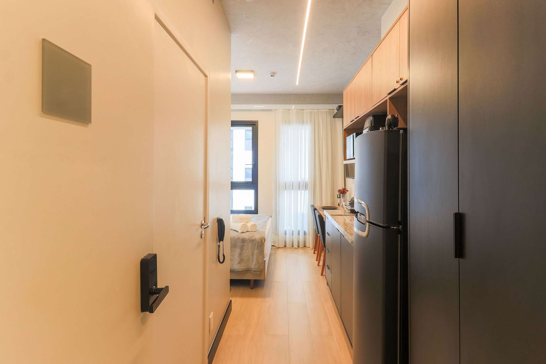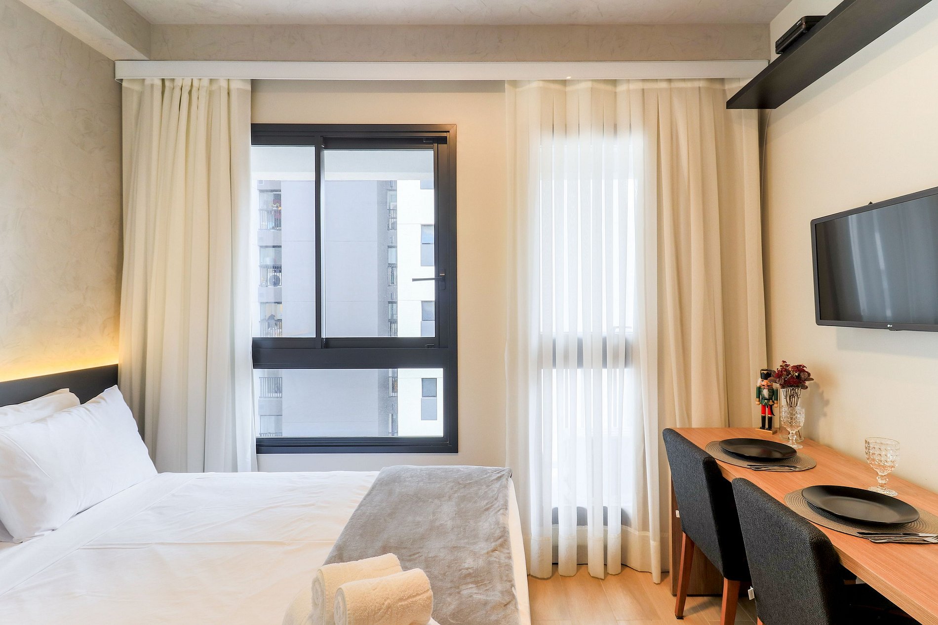O apartamento dispõe de uma cama Queen (1,58m x 1,98m) e uma cozinha completa, equipada com geladeira, freezer, micro-ondas, fogão de indução, taças de vinho, cafeteira Dolce Gusto, filtro de água, forno elétrico e air fryer. Além disso, conta com mesa e duas cadeiras internas, guarda-roupa, TV e um banheiro com excelente chuveiro (água quente e fria) alem de ferro de passar roupa e secador de cabelo. Será fornecido um jogo de enxoval por hóspede, incluindo lençóis, travesseiros, fronhas e toalhas de banho e rosto. Não há trocas durante a estadia, porém, é possível disponibilizar um kit de enxoval extra mediante o pagamento de uma taxa adicional. Outras Observações O apartamento está localizado na Rua Coronel Lisboa, 805, em uma região com diversas opções para tornar sua estadia ainda mais agradável: