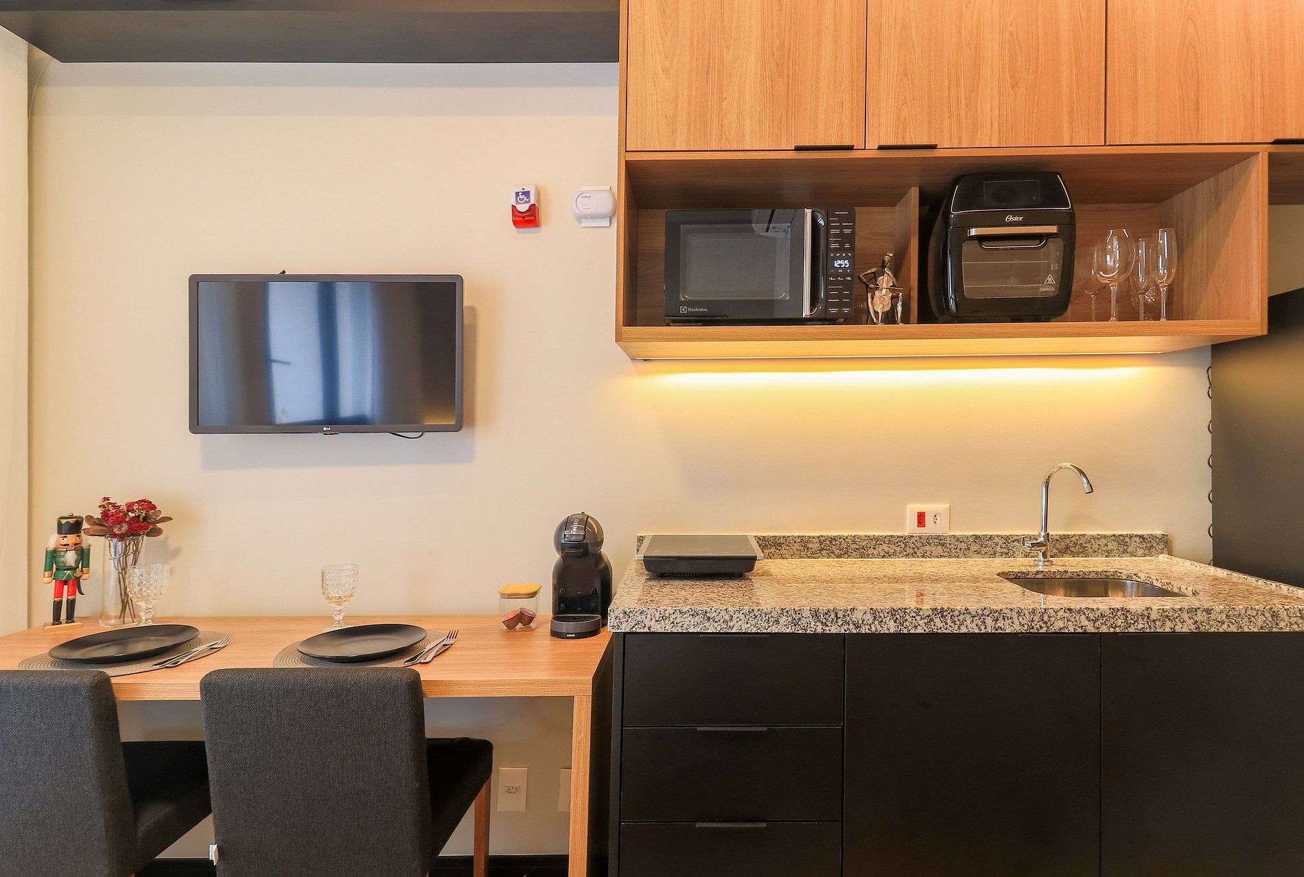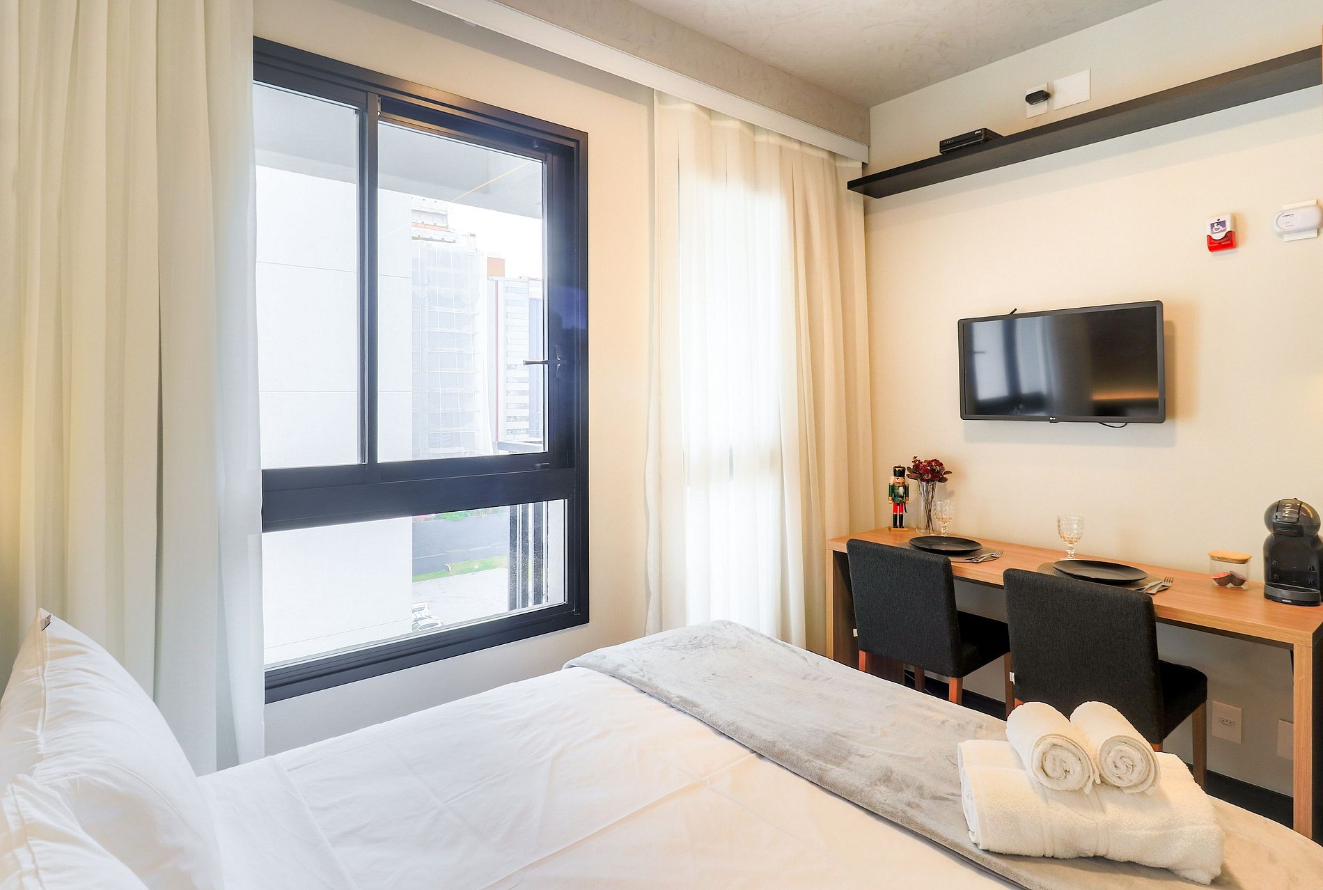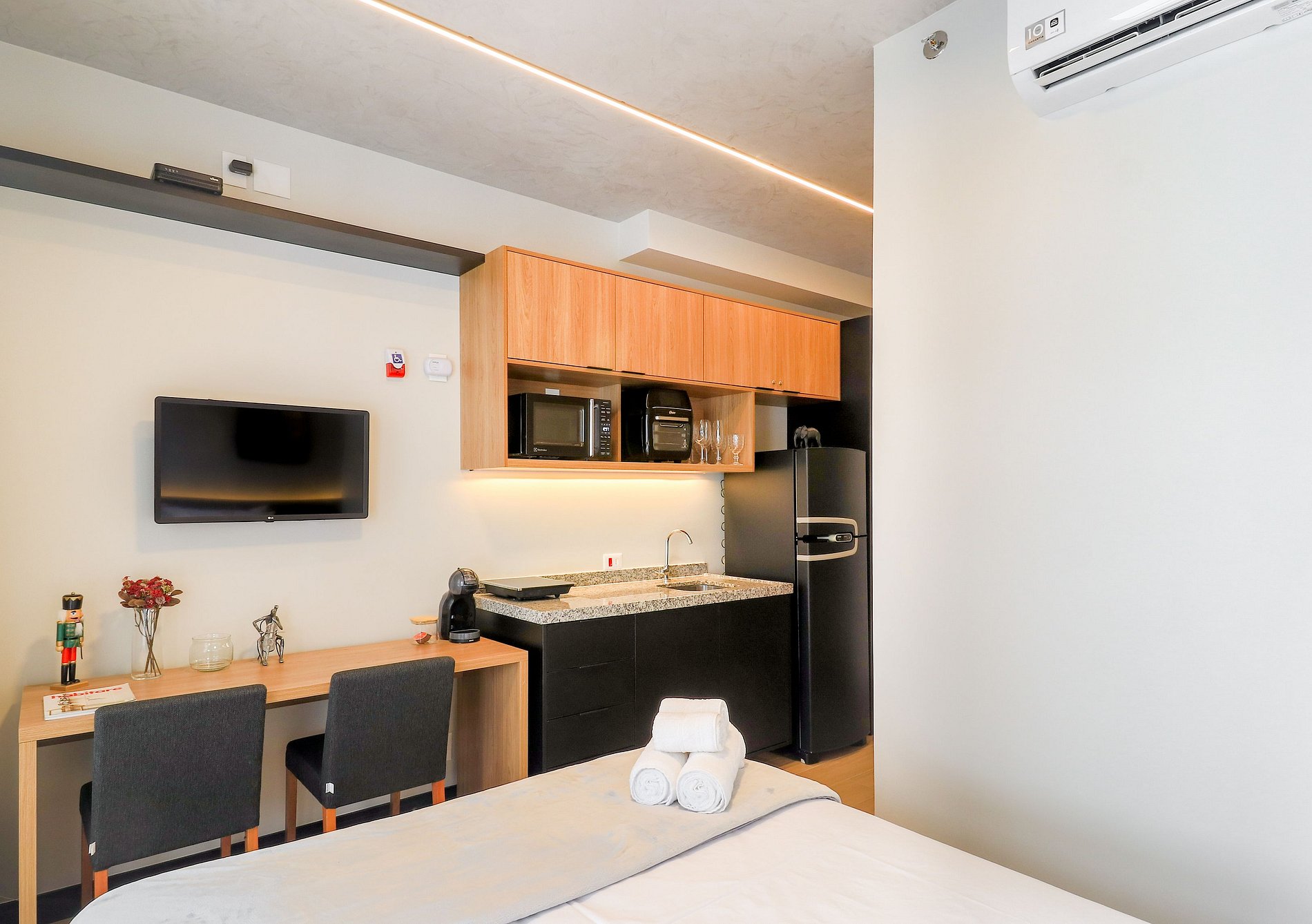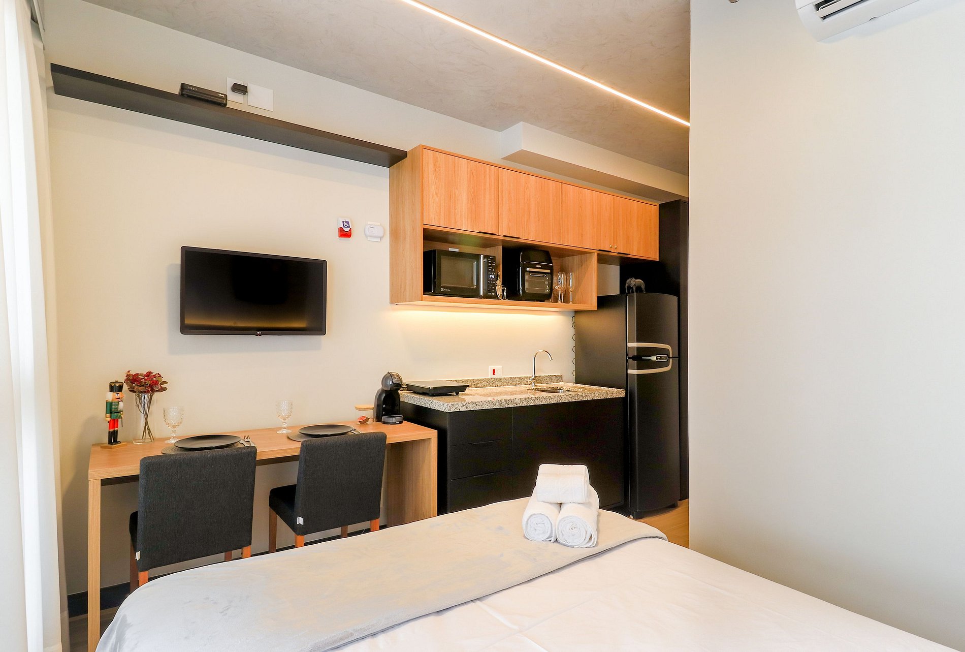 O apartamento dispõe de uma cama Queen (1,58m x 1,98m) e uma cozinha completa, equipada com geladeira, freezer, micro-ondas, fogão de indução, taças de vinho, cafeteira Dolce Gusto, filtro de água, forno elétrico e air fryer. Além disso, conta com mesa e duas cadeiras internas, guarda-roupa, TV e um banheiro com excelente chuveiro (água quente e fria) alem de ferro de passar roupa e secador de cabelo. Será fornecido um jogo de enxoval por hóspede, incluindo lençóis, travesseiros, fronhas e toalhas de banho e rosto. Não há trocas durante a estadia, porém, é possível disponibilizar um kit de enxoval extra mediante o pagamento de uma taxa adicional. Outras Observações O apartamento está localizado na Rua Coronel Lisboa, 805, em uma região com diversas opções para tornar sua estadia ainda mais agradável: