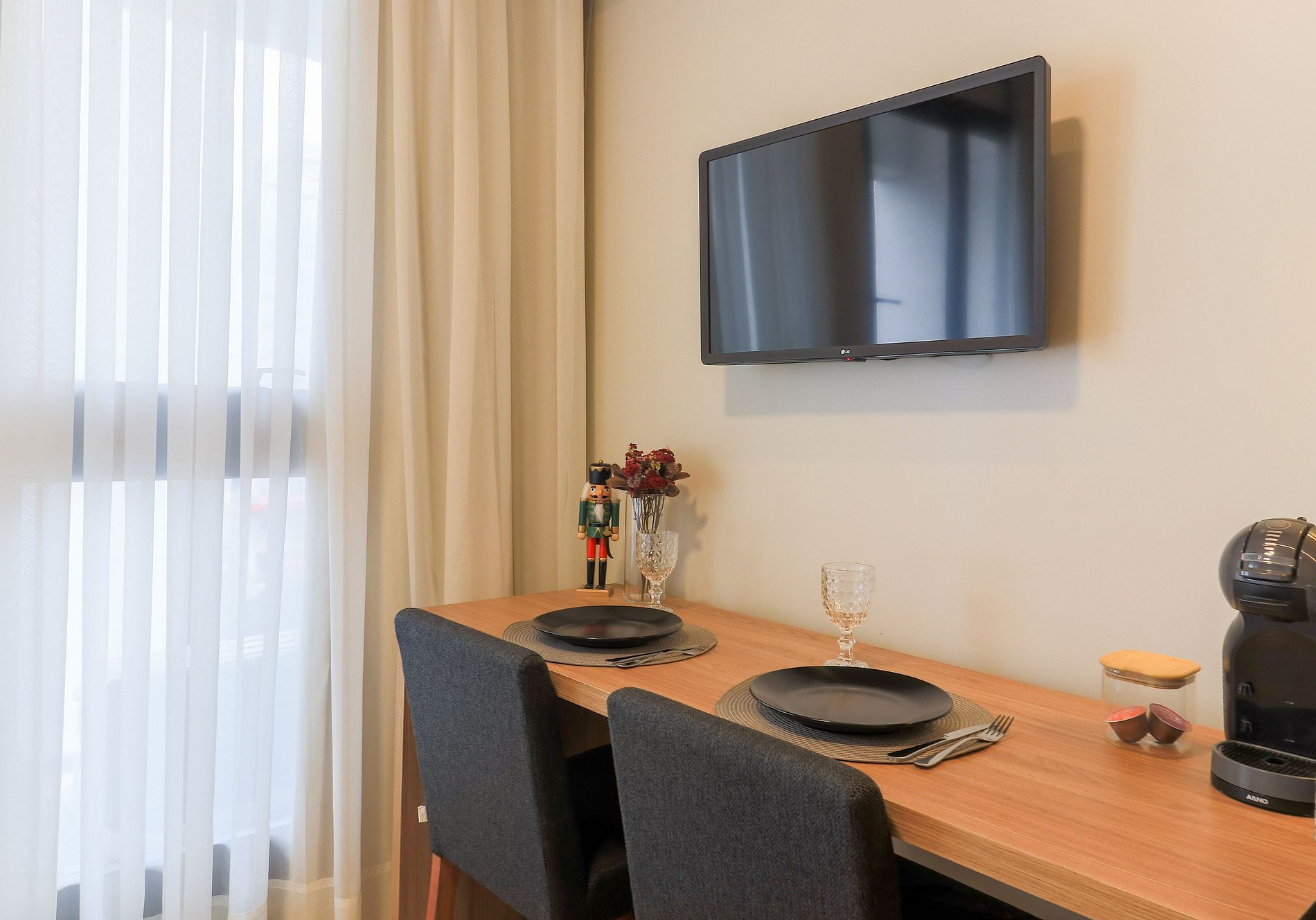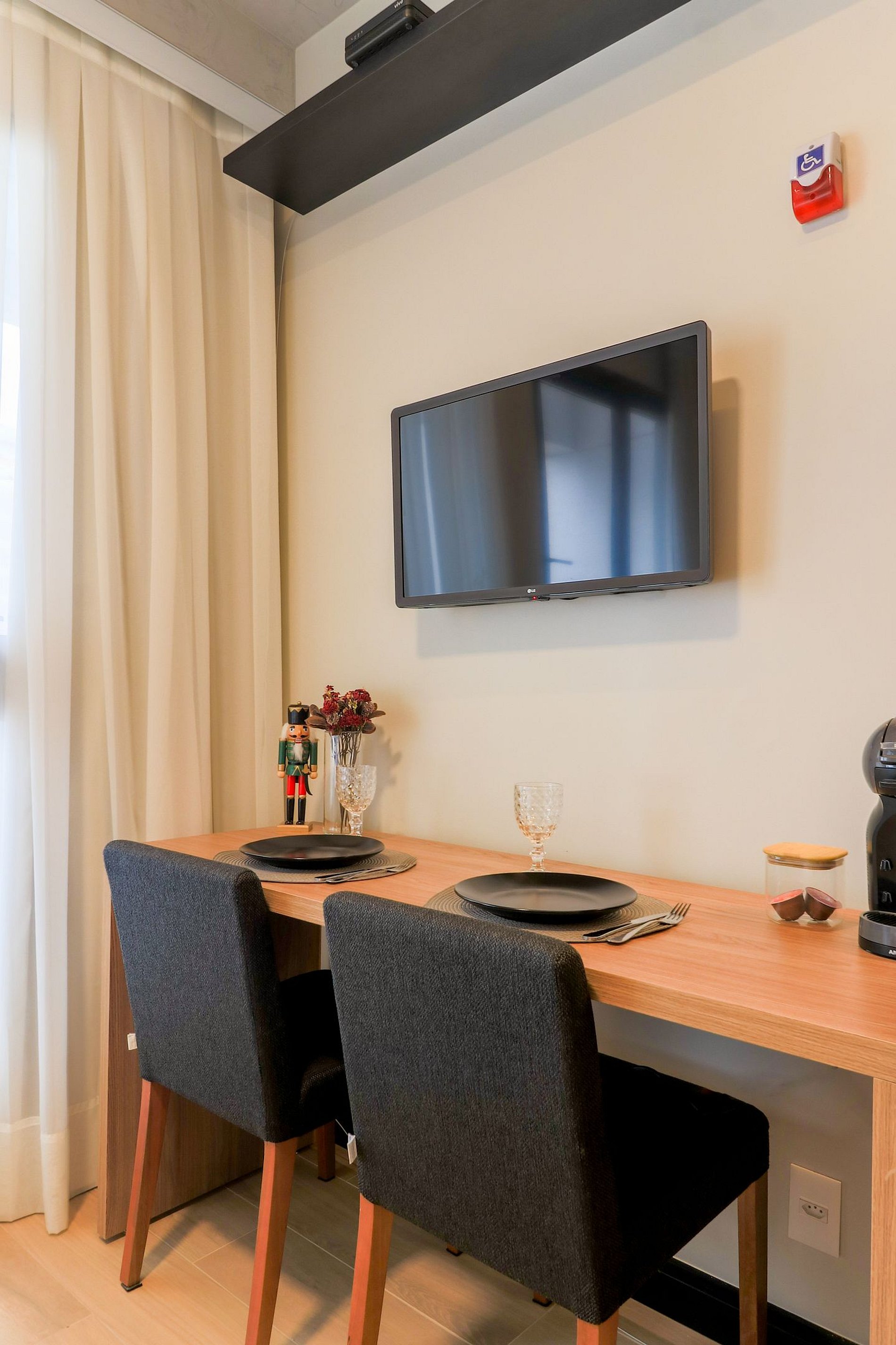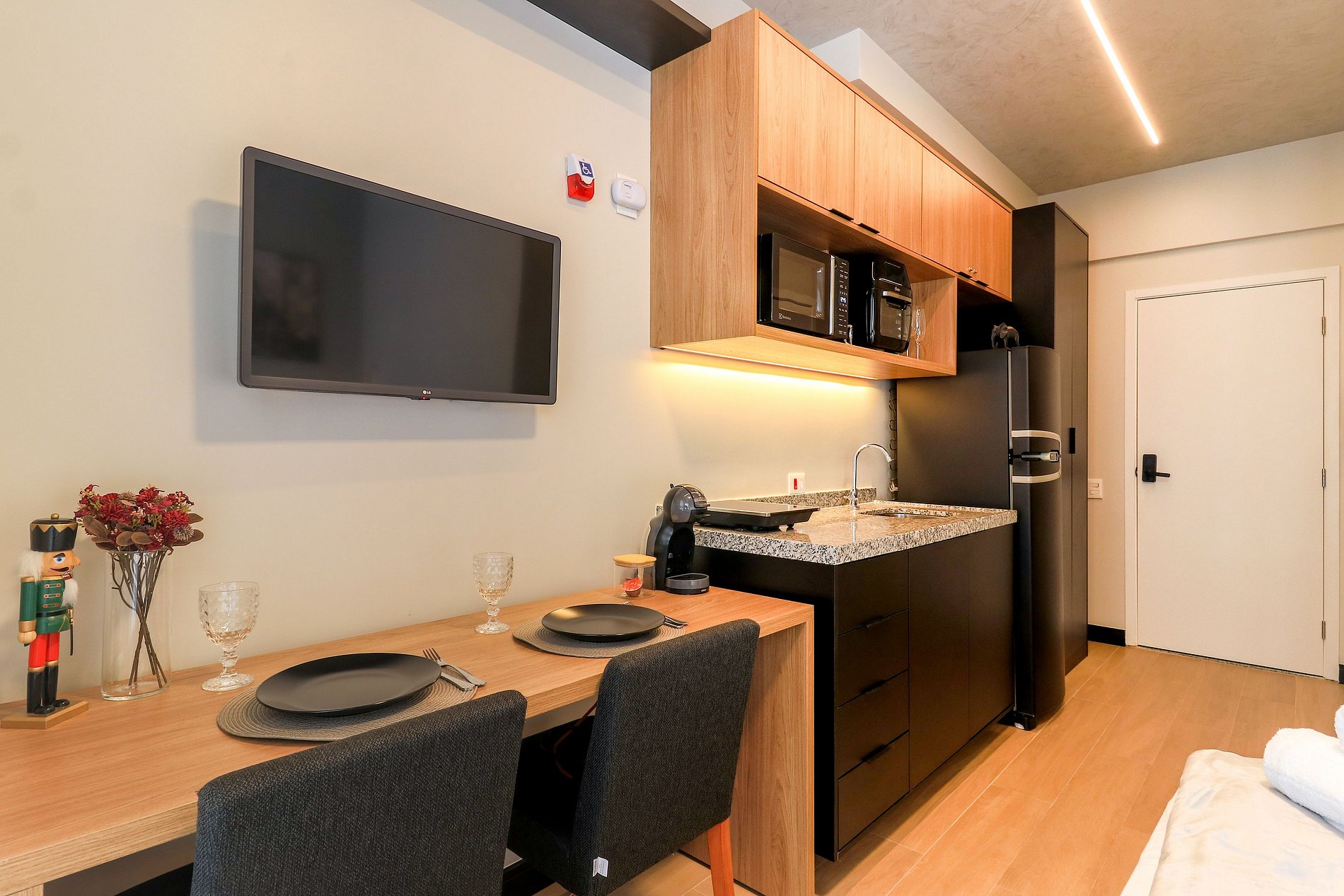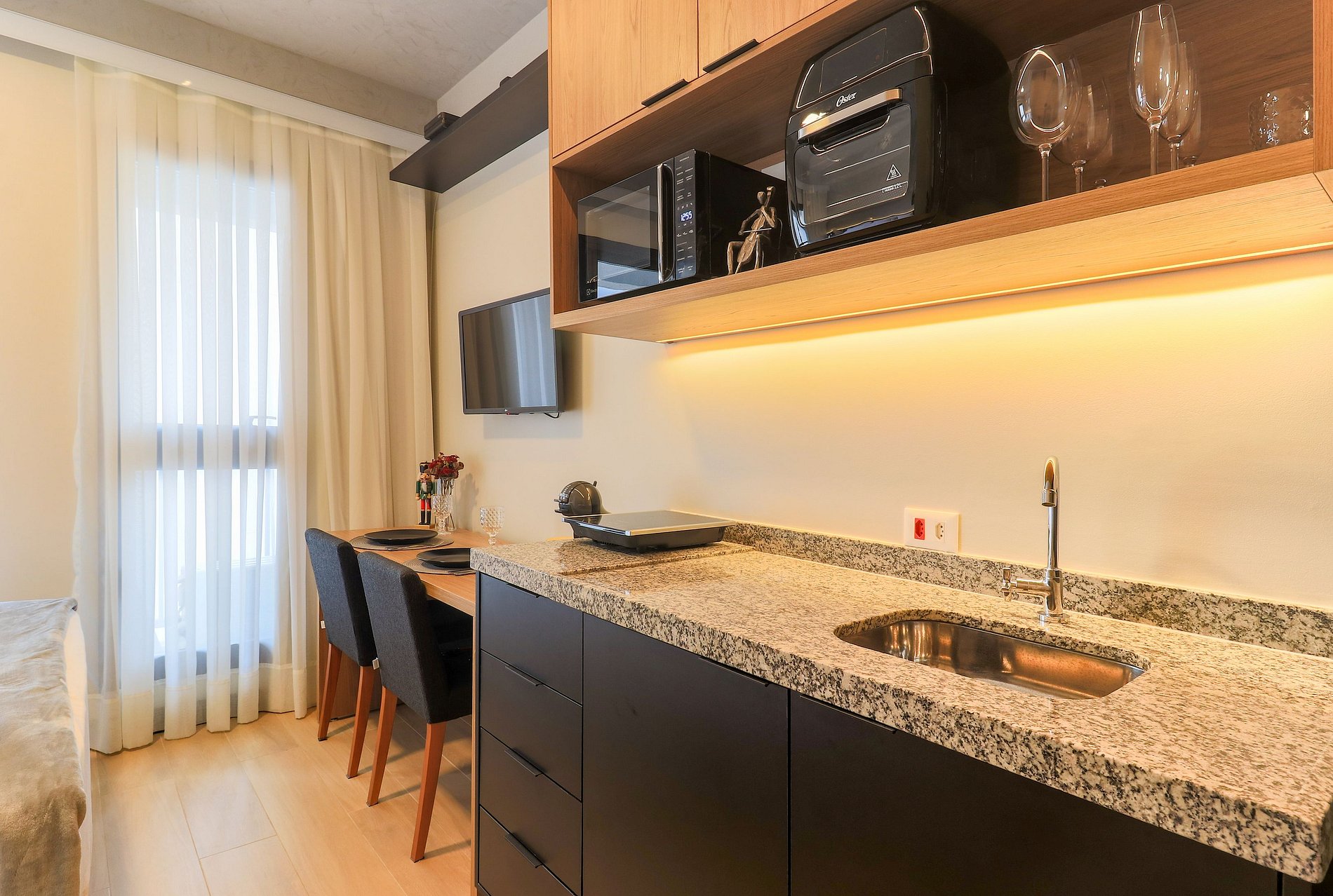 O apartamento dispõe de uma cama Queen (1,58m x 1,98m) e uma cozinha completa, equipada com geladeira, freezer, micro-ondas, fogão de indução, taças de vinho, cafeteira Dolce Gusto, filtro de água, forno elétrico e air fryer. Além disso, conta com mesa e duas cadeiras internas, guarda-roupa, TV e um banheiro com excelente chuveiro (água quente e fria) alem de ferro de passar roupa e secador de cabelo. Será fornecido um jogo de enxoval por hóspede, incluindo lençóis, travesseiros, fronhas e toalhas de banho e rosto. Não há trocas durante a estadia, porém, é possível disponibilizar um kit de enxoval extra mediante o pagamento de uma taxa adicional. Outras Observações O apartamento está localizado na Rua Coronel Lisboa, 805, em uma região com diversas opções para tornar sua estadia ainda mais agradável: