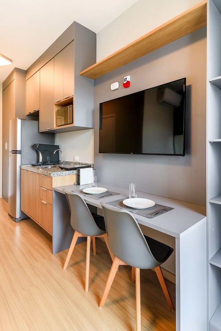 O apartamento possui 1 cama de casal padrão (1,38x1,88). Cozinha completa com geladeira, freezer, micro-ondas, fogão de indução (1 bocas), taças de vinho, cafeteira nespresso para home office, guarda-roupa, Mesa, 2 Cadeira Interna, filtro de agua, forninho, liquidificador , TV e banheiro com ótimo chuveiro (água quente e fria) secador e ferro de passar.. Será fornecido um jogo de enxoval (lençóis, travesseiros, fronhas e toalhas de banho e rosto) por hóspede. Não há trocas durante a permanência. Também é possível deixar um kit de enxovais extra com o pagamento de uma taxa adicional! Outras observações Ao redor do endereço Rua Coronel Lisboa 805 você encontrará uma variedade de opções para tornar sua estadia cada vez mais agradável.