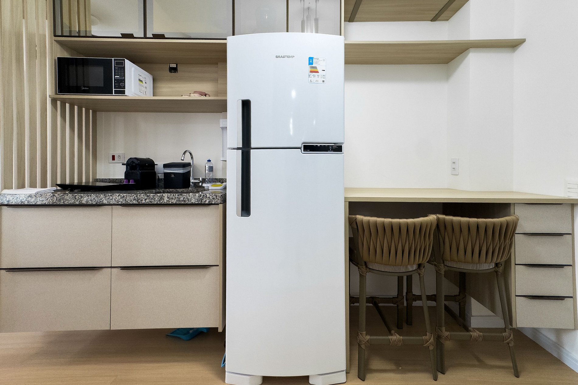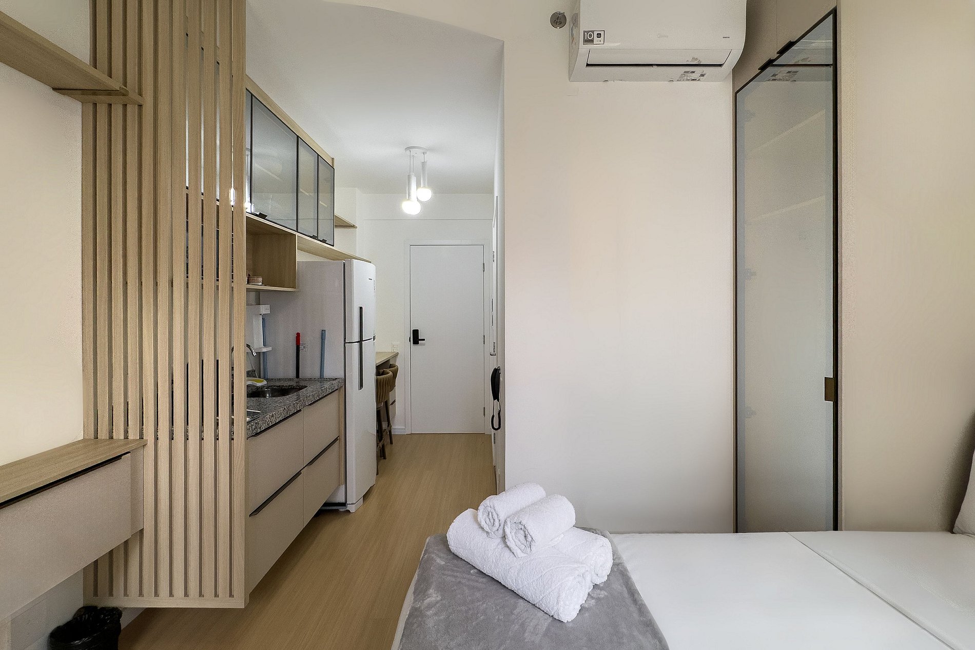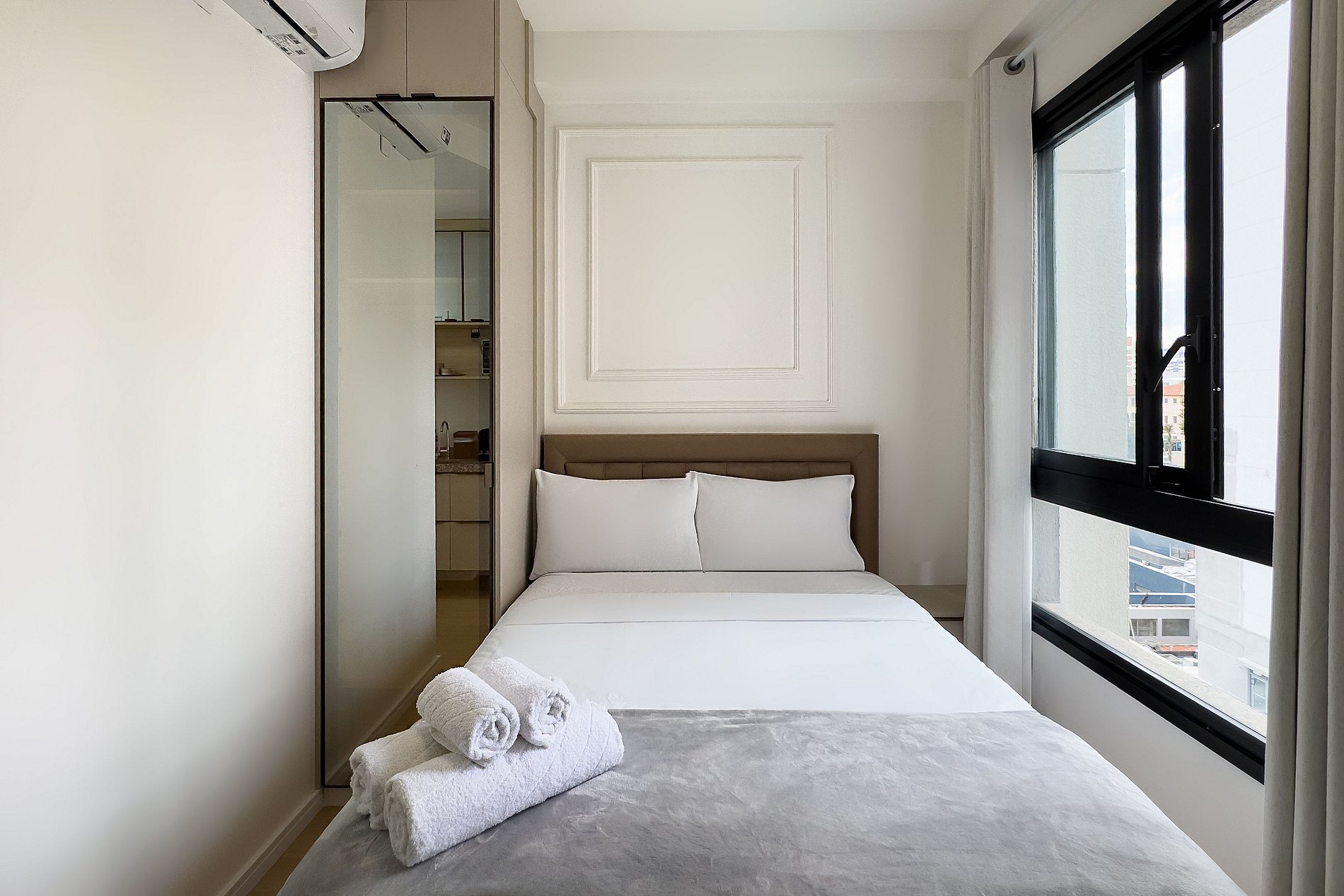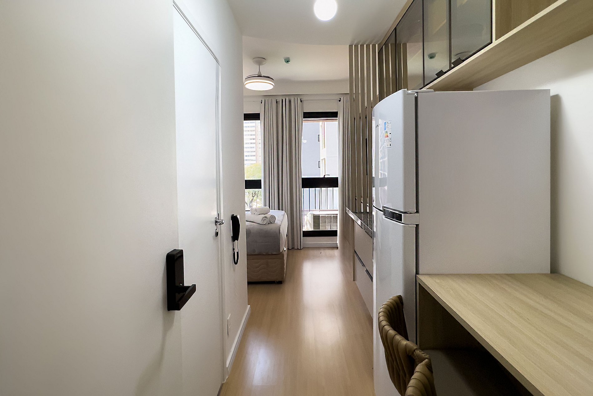 O apartamento dispõe de uma cama casal (1,38m x 1,88m) e uma cozinha completa, equipada com geladeira, freezer, micro-ondas, fogão de indução, taças de vinho, cafeteira nespresso . Além disso, conta com mesa e duas cadeiras internas, guarda-roupa, TV e um banheiro com excelente chuveiro (água quente e fria) alem de ferro de passar roupa e secador de cabelo. Será fornecido um jogo de enxoval por hóspede, incluindo lençóis, travesseiros, fronhas e toalhas de banho e rosto. Não há trocas durante a estadia, porém, é possível disponibilizar um kit de enxoval extra mediante o pagamento de uma taxa adicional. Outras Observações O apartamento está localizado na Rua Coronel Lisboa, 805, em uma região com diversas opções para tornar sua estadia ainda mais agradável: