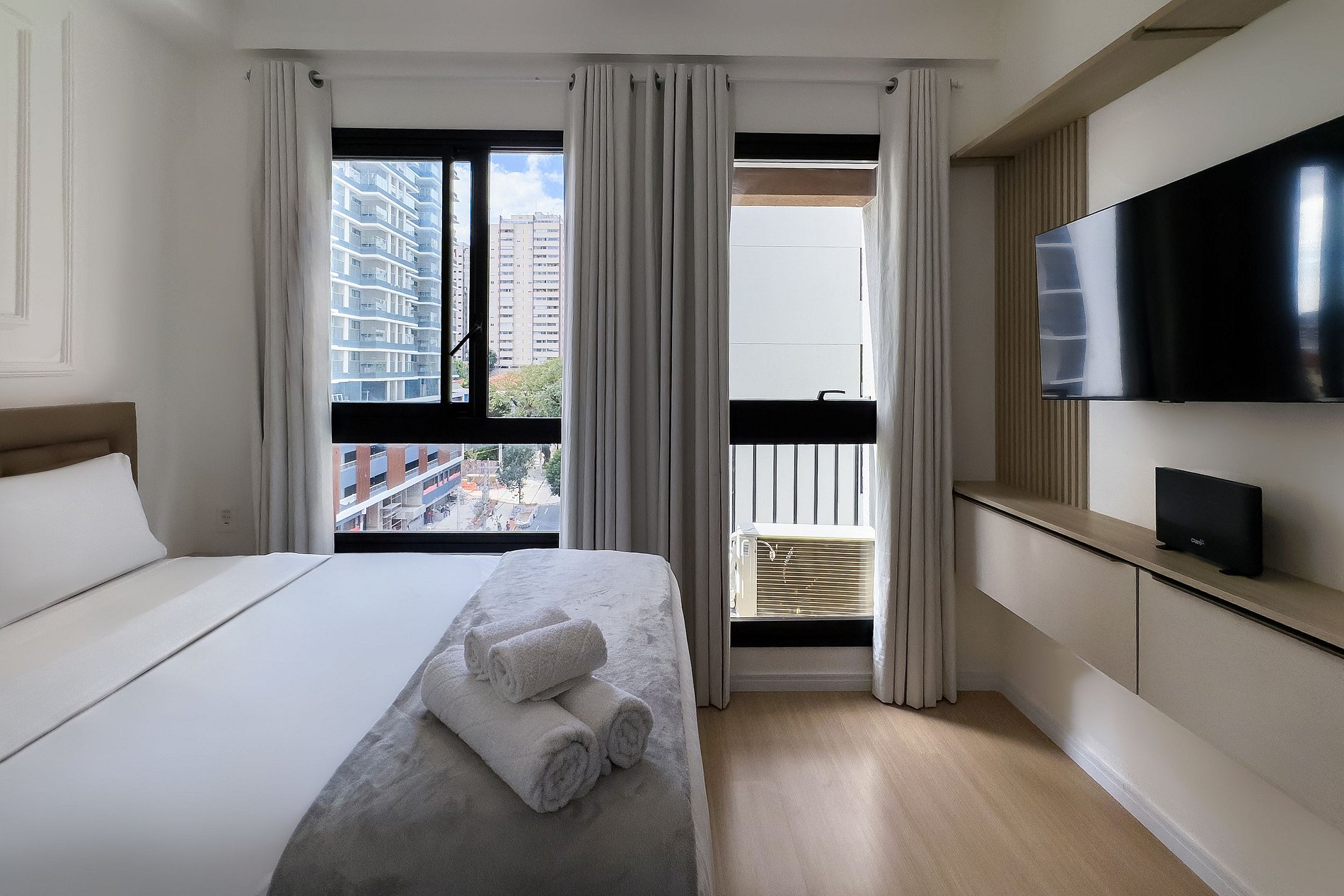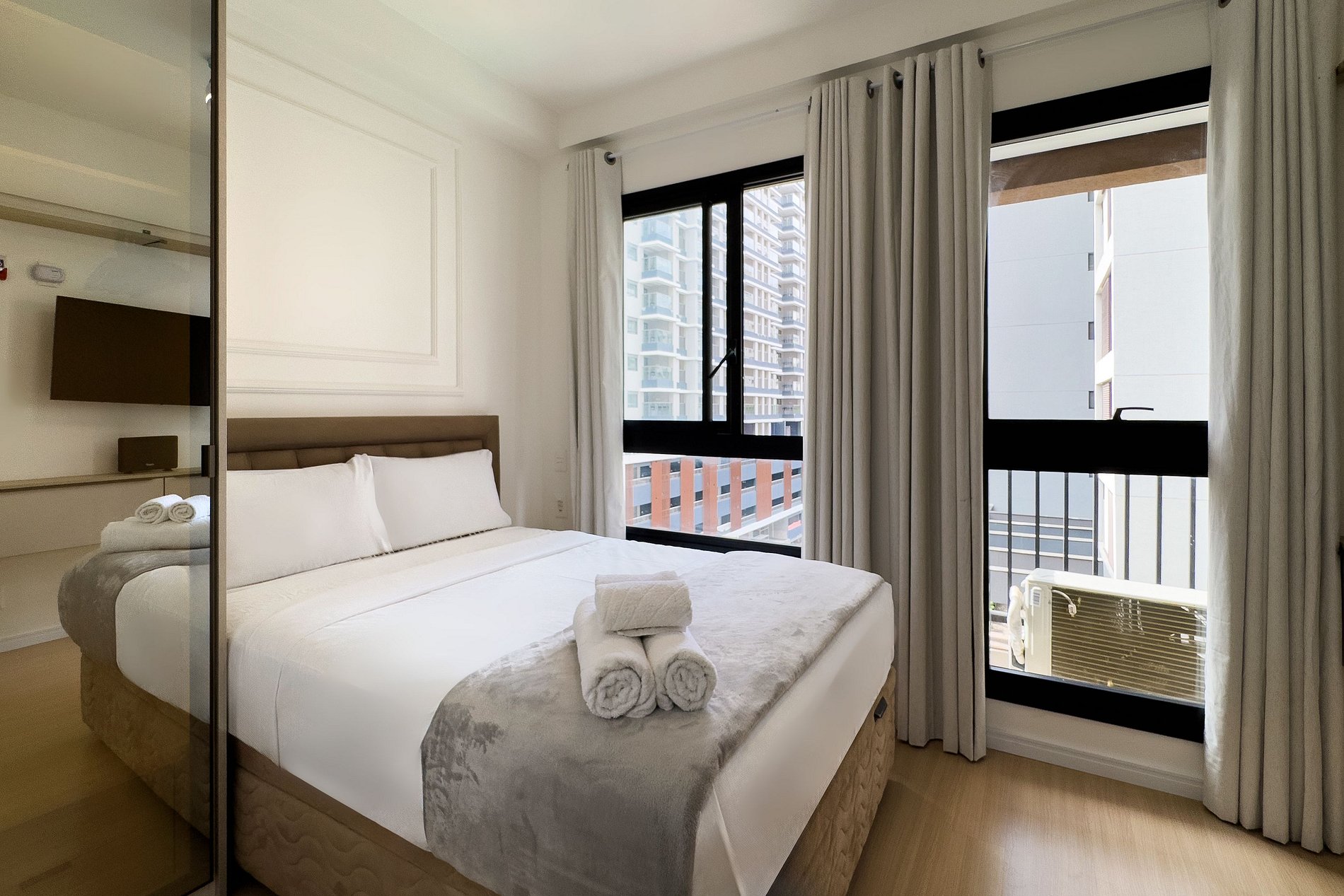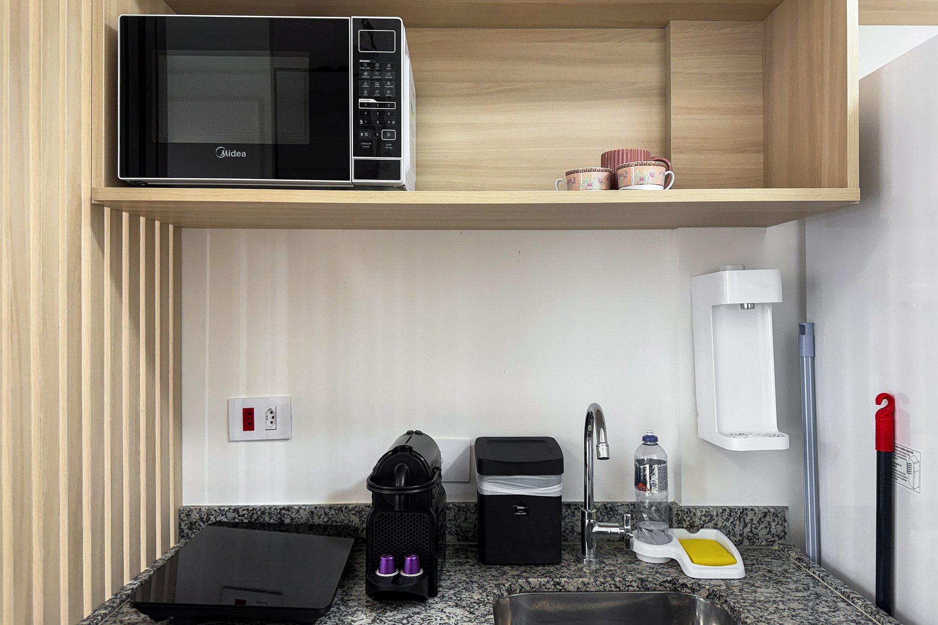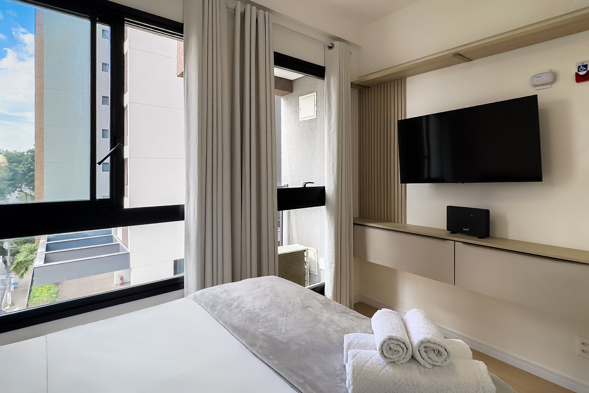 O apartamento dispõe de uma cama casal (1,38m x 1,88m) e uma cozinha completa, equipada com geladeira, freezer, micro-ondas, fogão de indução, taças de vinho, cafeteira nespresso . Além disso, conta com mesa e duas cadeiras internas, guarda-roupa, TV e um banheiro com excelente chuveiro (água quente e fria) alem de ferro de passar roupa e secador de cabelo. Será fornecido um jogo de enxoval por hóspede, incluindo lençóis, travesseiros, fronhas e toalhas de banho e rosto. Não há trocas durante a estadia, porém, é possível disponibilizar um kit de enxoval extra mediante o pagamento de uma taxa adicional. Outras Observações O apartamento está localizado na Rua Coronel Lisboa, 805, em uma região com diversas opções para tornar sua estadia ainda mais agradável: