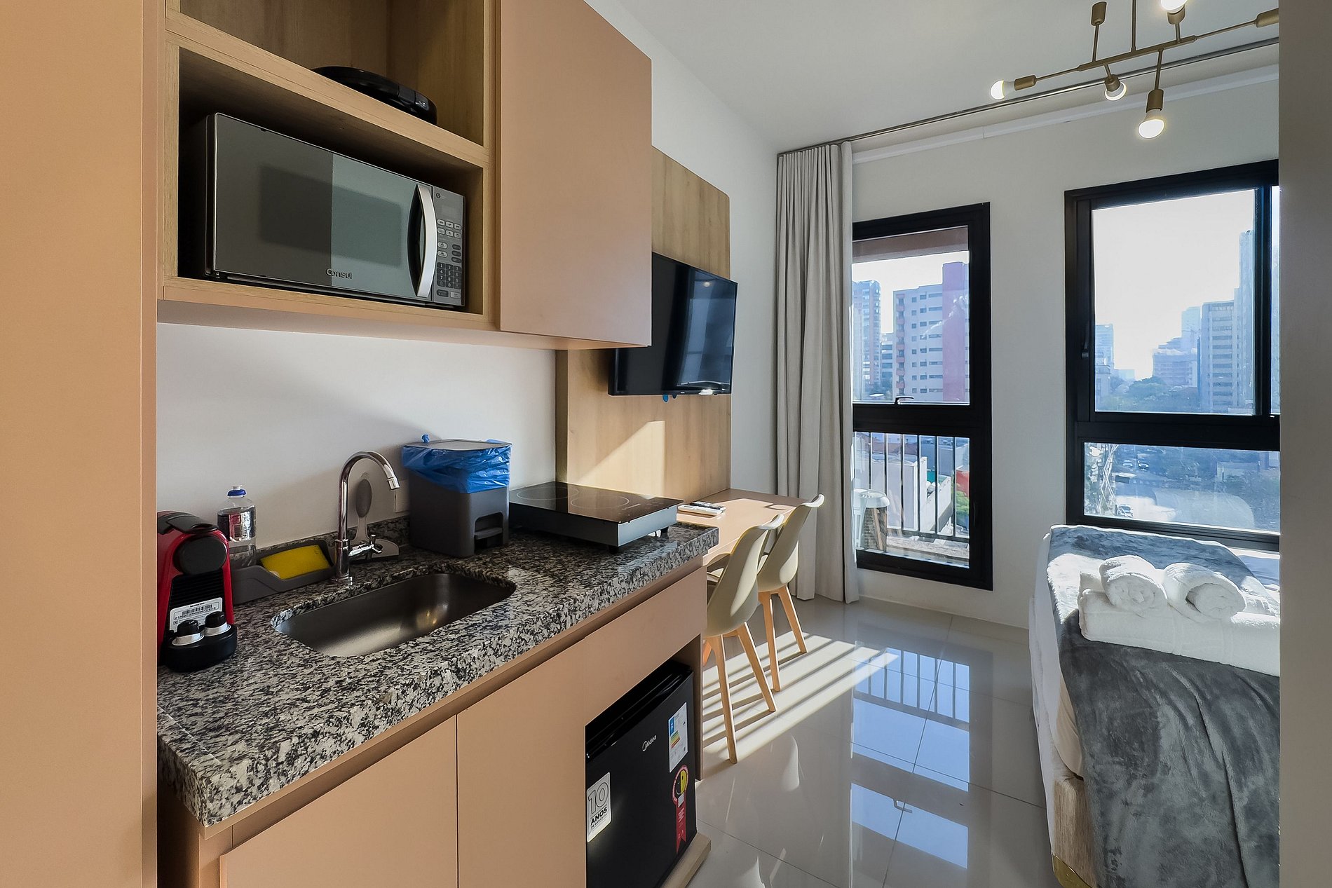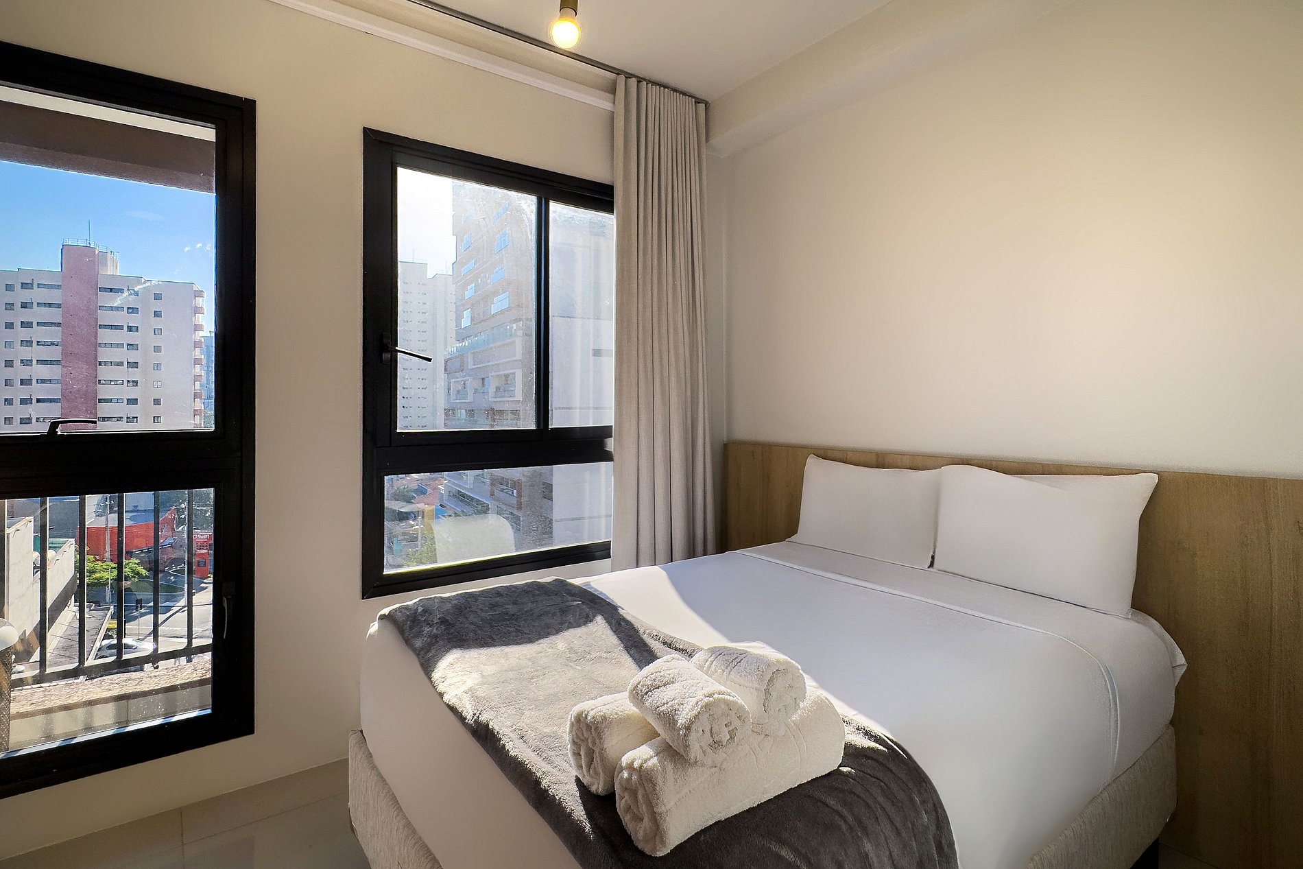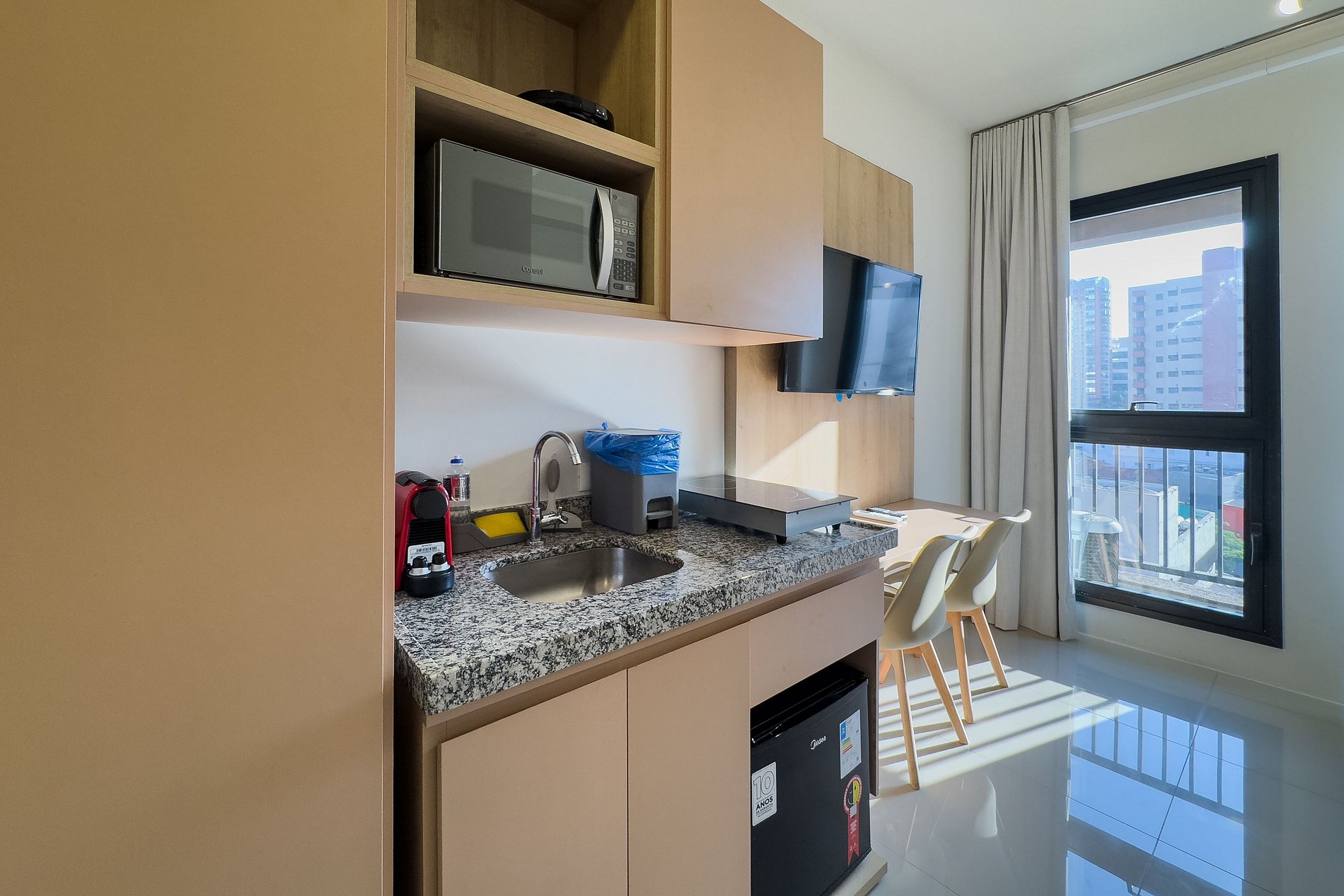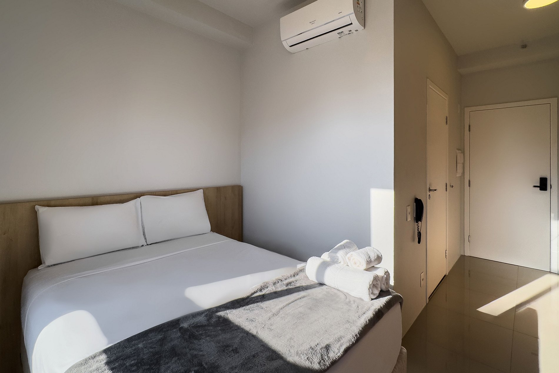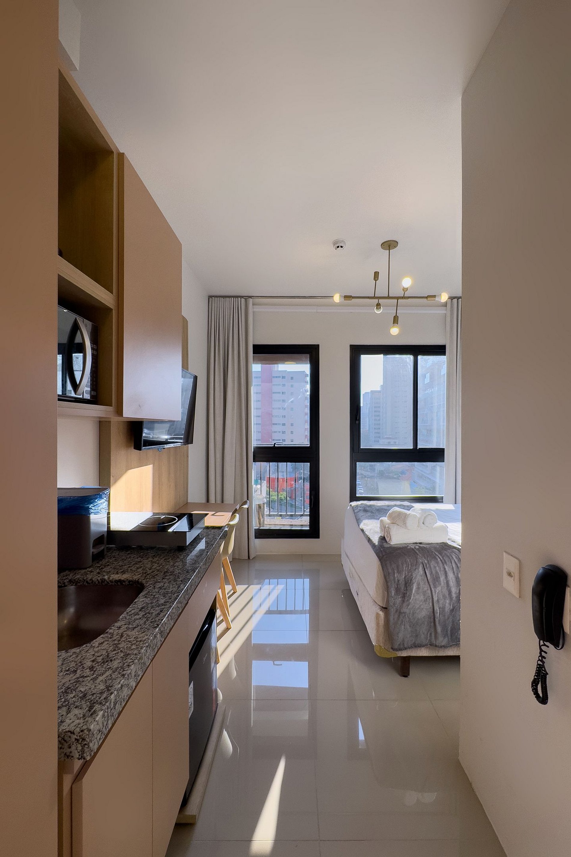 O apartamento dispõe de uma cama casal (1,38m x 1,88m) e uma cozinha completa, equipada com geladeira, freezer, micro-ondas, fogão de indução, taças de vinho, cafeteira Dolce Gusto, filtro de água, forno. Além disso, conta com mesa e duas cadeiras internas, guarda-roupa, TV e um banheiro com excelente chuveiro (água quente e fria) alem de ferro de passar roupa e secador de cabelo. Será fornecido um jogo de enxoval por hóspede, incluindo lençóis, travesseiros, fronhas e toalhas de banho e rosto. Não há trocas durante a estadia, porém, é possível disponibilizar um kit de enxoval extra mediante o pagamento de uma taxa adicional. Outras Observações O apartamento está localizado na Rua Coronel Lisboa, 805, em uma região com diversas opções para tornar sua estadia ainda mais agradável: Villa Grano Breads A poucos metros do prédio (uma quadra). Famosa pelos pães frescos e deliciosos.